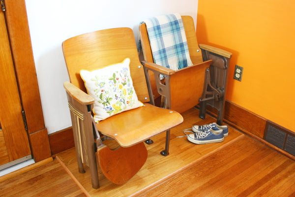 Found: The perfect theater chairs! Well... almost. They were manufactured around the 1920s and came from a lecture hall at nearby Wells College, which was originally founded as the ladies-only sister school to Cornell University. Think of all the smart gals that have sat in these seats!