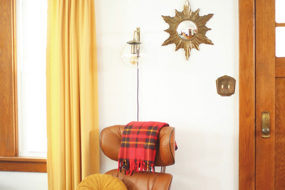 We've lived in our fare share of rented apartments over the years, and each time we've moved into a new space, it's taken us quite a while to start putting things on the walls. We're pretty fast with decorating in general - furniture finds its rightful place within the first couple of weeks, nick-knacks are unpacked and placed in just the right spot, and we're quick as can be to find the best nooks and windows for our plants. But putting holes in the walls always feels like such a commitment. Now that we're living in our very own home, putting holes in the walls seems even scarier! Add on the fact that our 1920 home has horsehair plaster walls (you can't use traditional nails or you risk cracking the whole darn wall!), and maybe you'll understand why we've been here for almost two years and are still looking at a lot of blank spaces. One of the first sections of wall we knew we wanted to tackle was right near our front door - a small space with lots of possibility. When we first moved in, we haphazardly hung one of my favorite vintage pieces on an existing nail - a mid century starburst mirror. The spacing and height were all wrong, but then there were more than a few things that were not quite right about this little nook. Here's what the situation looked like shortly after we moved in: