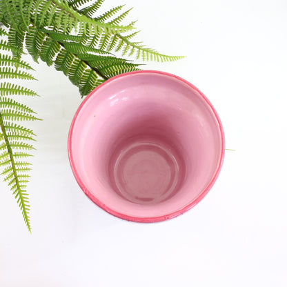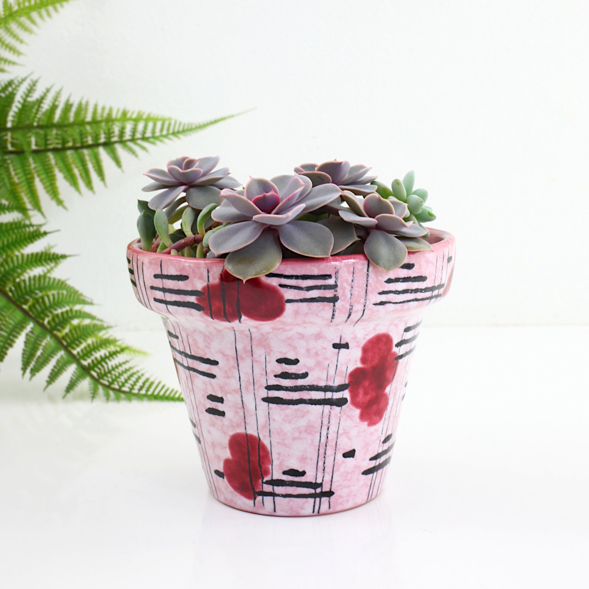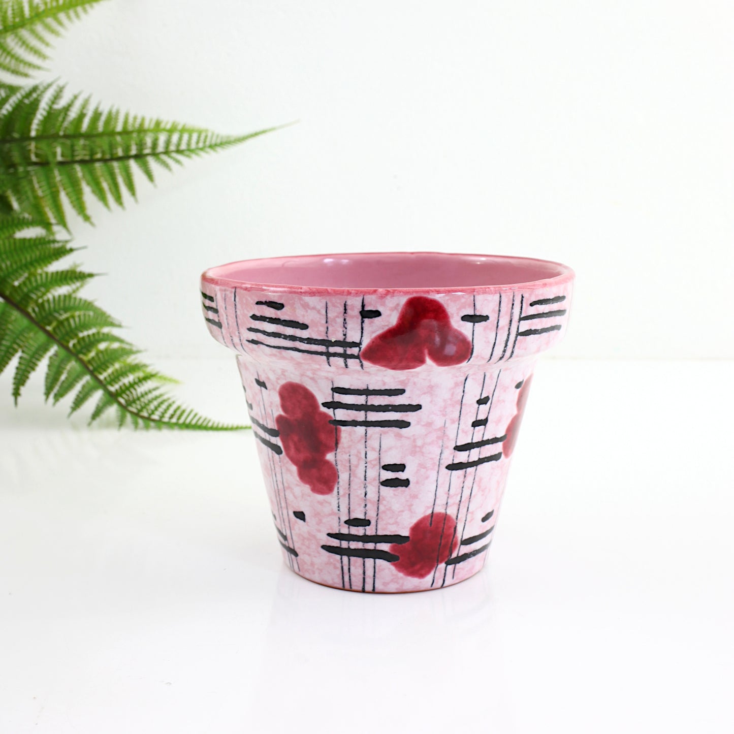 This fabulous mid century modern planter from Italy is a real stunner! Made in the 1960s, this fun piece of Italian art pottery is hand painted with a mottled pink background, abstract cranberry-colored blobs, and striking black lines - even the inside of the pot is painted a fun pink color! A fun and unique piece, this little cache pot is sure to make any plant look extra special!