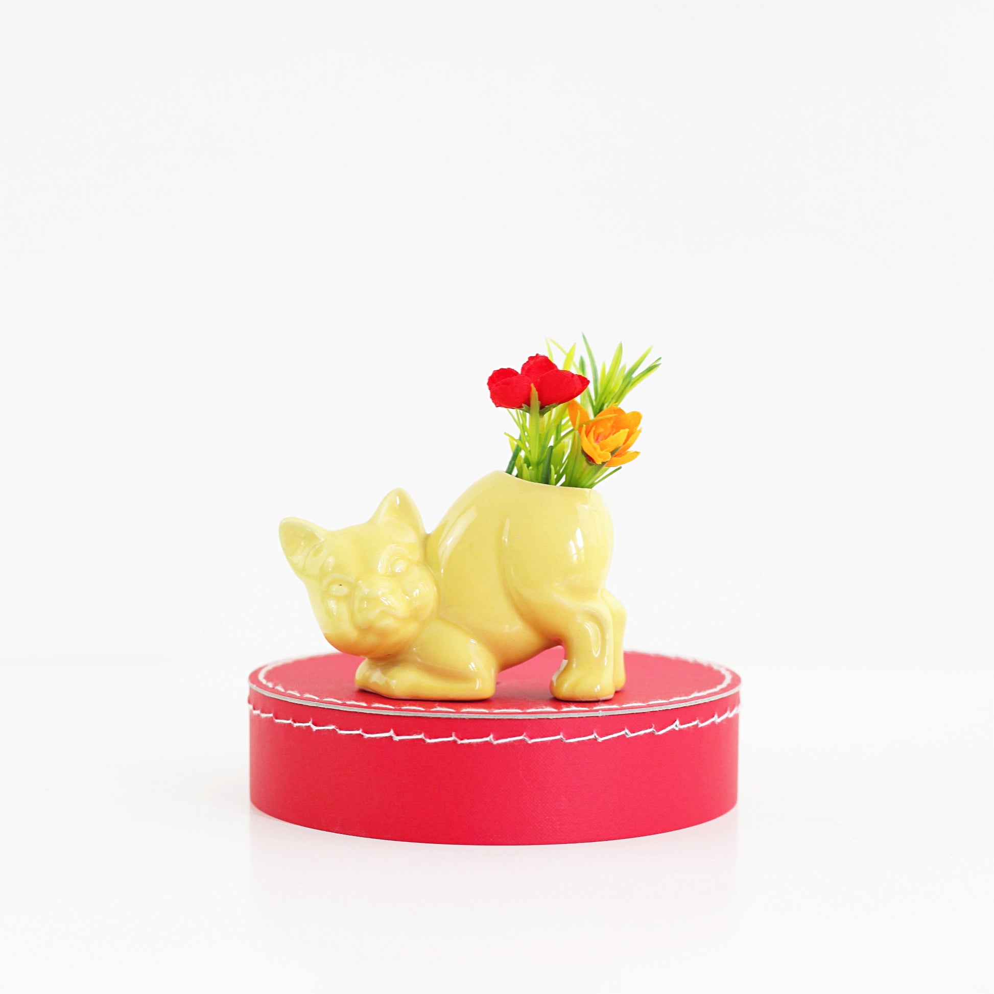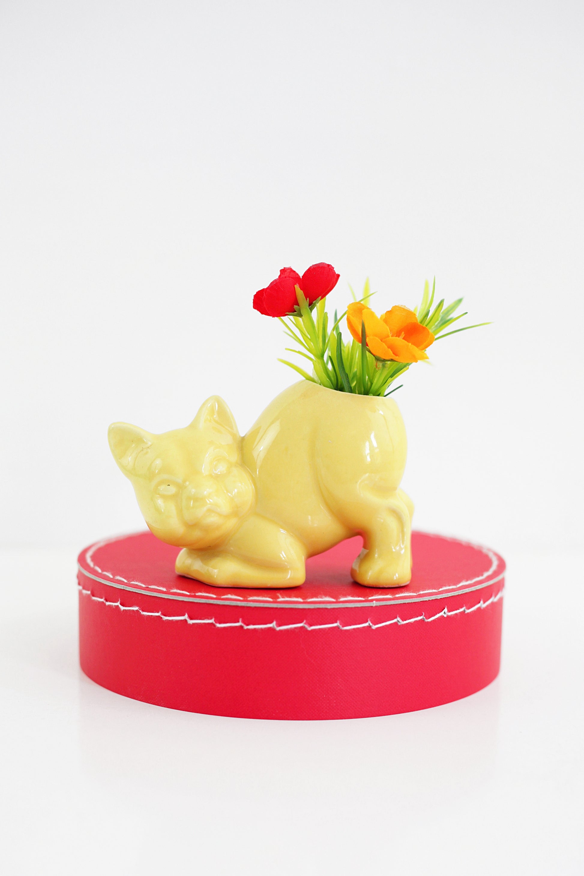 This absolutely adorable vintage cat planter is just so sweet! Made in the 1940s by the Morton Pottery Company of Illinois, this planter is a beautiful sunny yelow color. The placement of the opening on this cat means your favorite cactus or succulent magically turns into kitty's tail! Also looks cute with flowers, pens and pencils, or whatever you please! No matter what you do with it, you're sure to love this planter for many years to come - and I'm not 'kitten'!