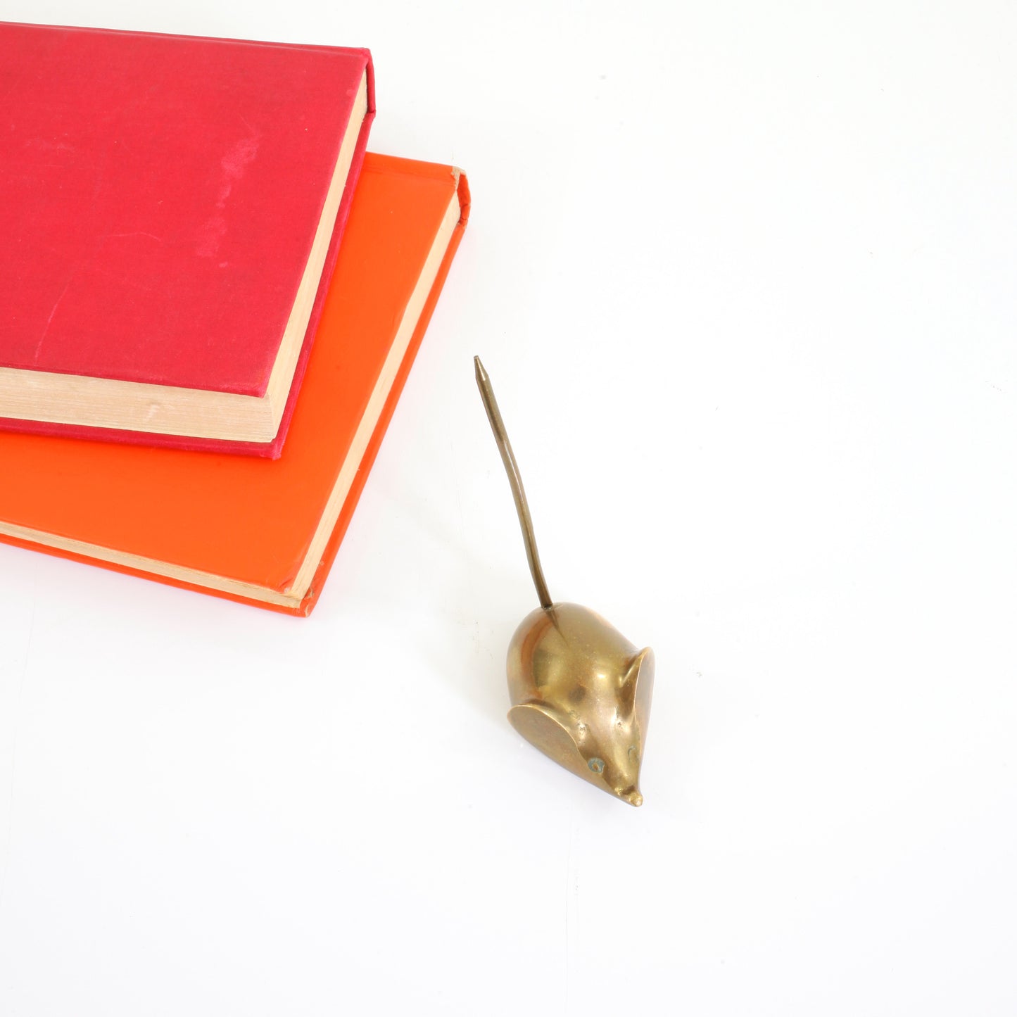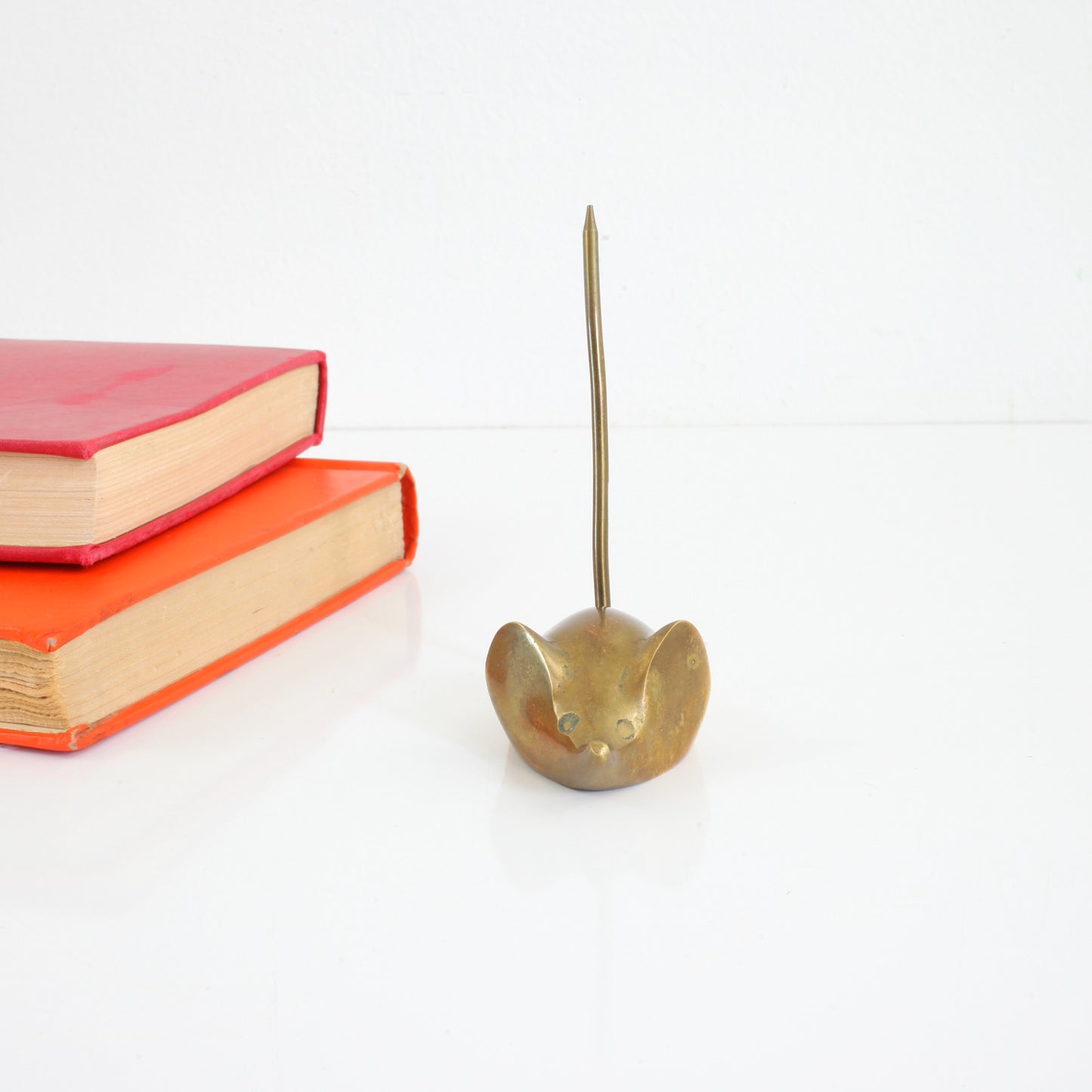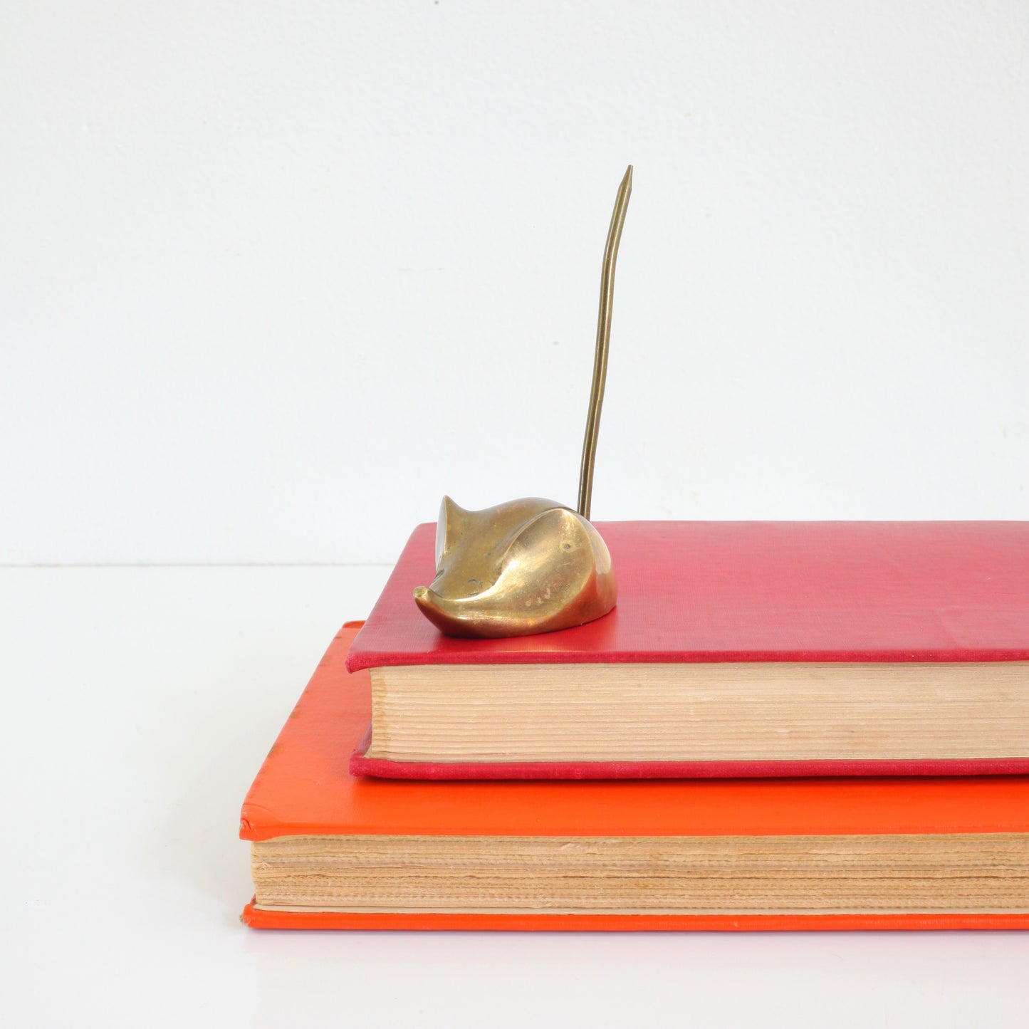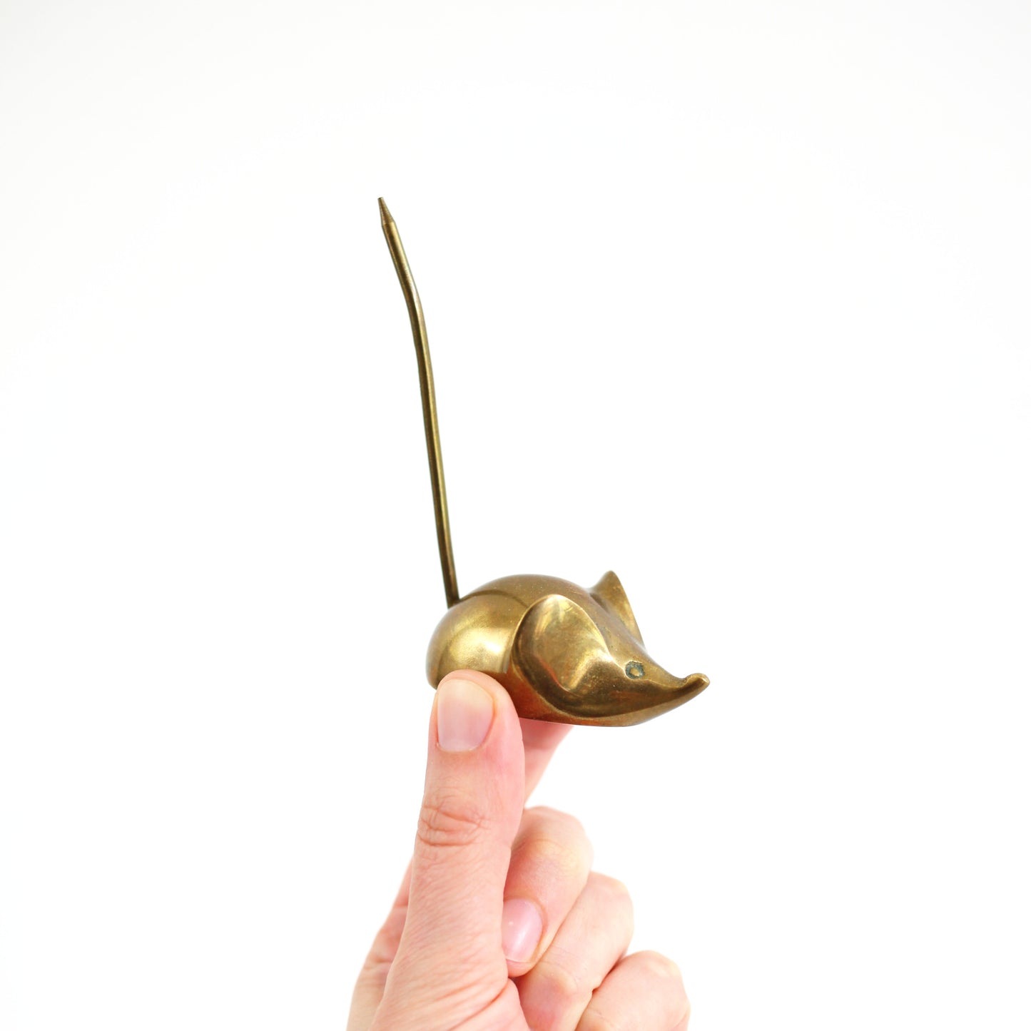 This sweet little vintage brass mouse is such a rich, warm golden color with a beautiful aged patina and a long brass tail. Perfect as a paperweight on your desk (his long tail makes a great note-holder!) or decor on your dresser (his tail is also perfect for holding rings!), this little mouse is cute enough for any room in your house!
