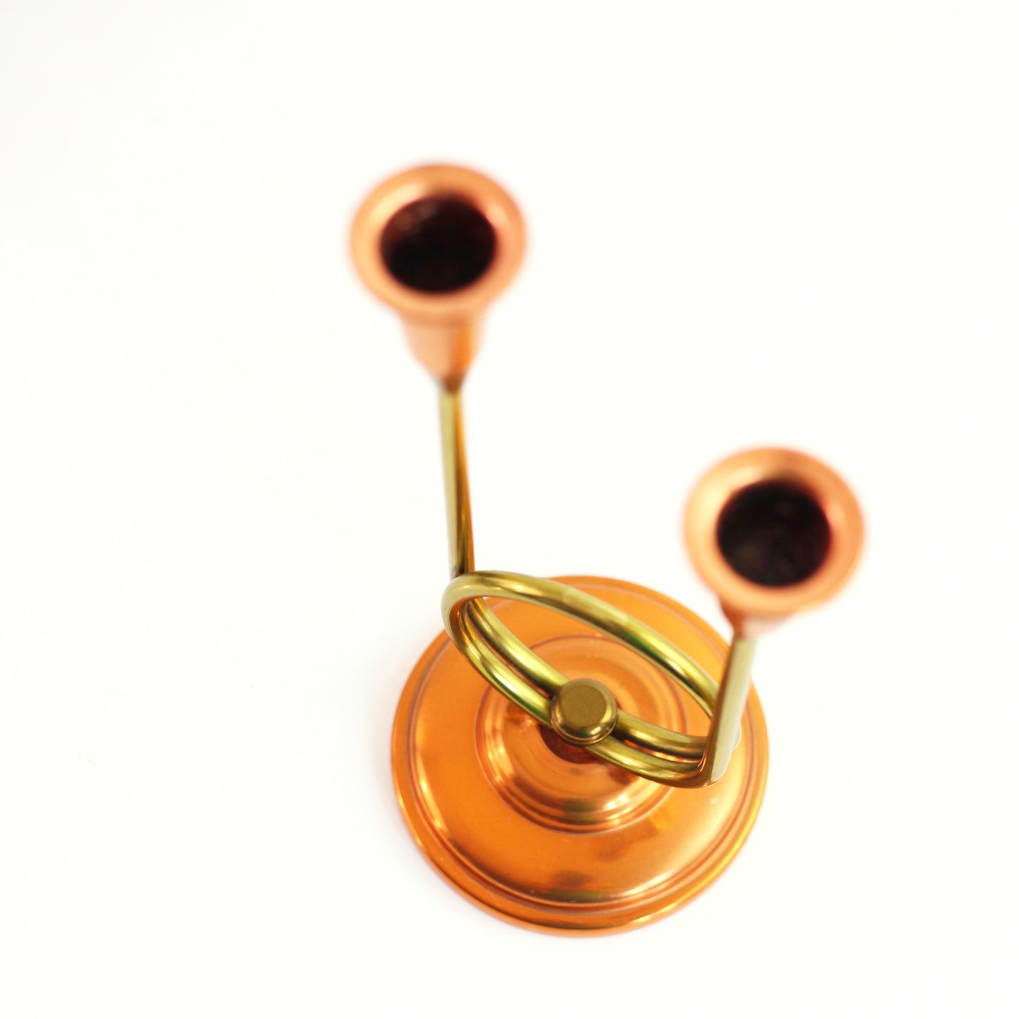 This beautiful mid century copper and brass candlestick holder is a real stunner! Made by Coppercraft Guild in the 1970s, this elegant candle holder has a golden brass loop atop a shiny copper base with two matching trumpet-shaped copper cups on top. Perfect for adding a bit of mid century charm to your shelf or table!
