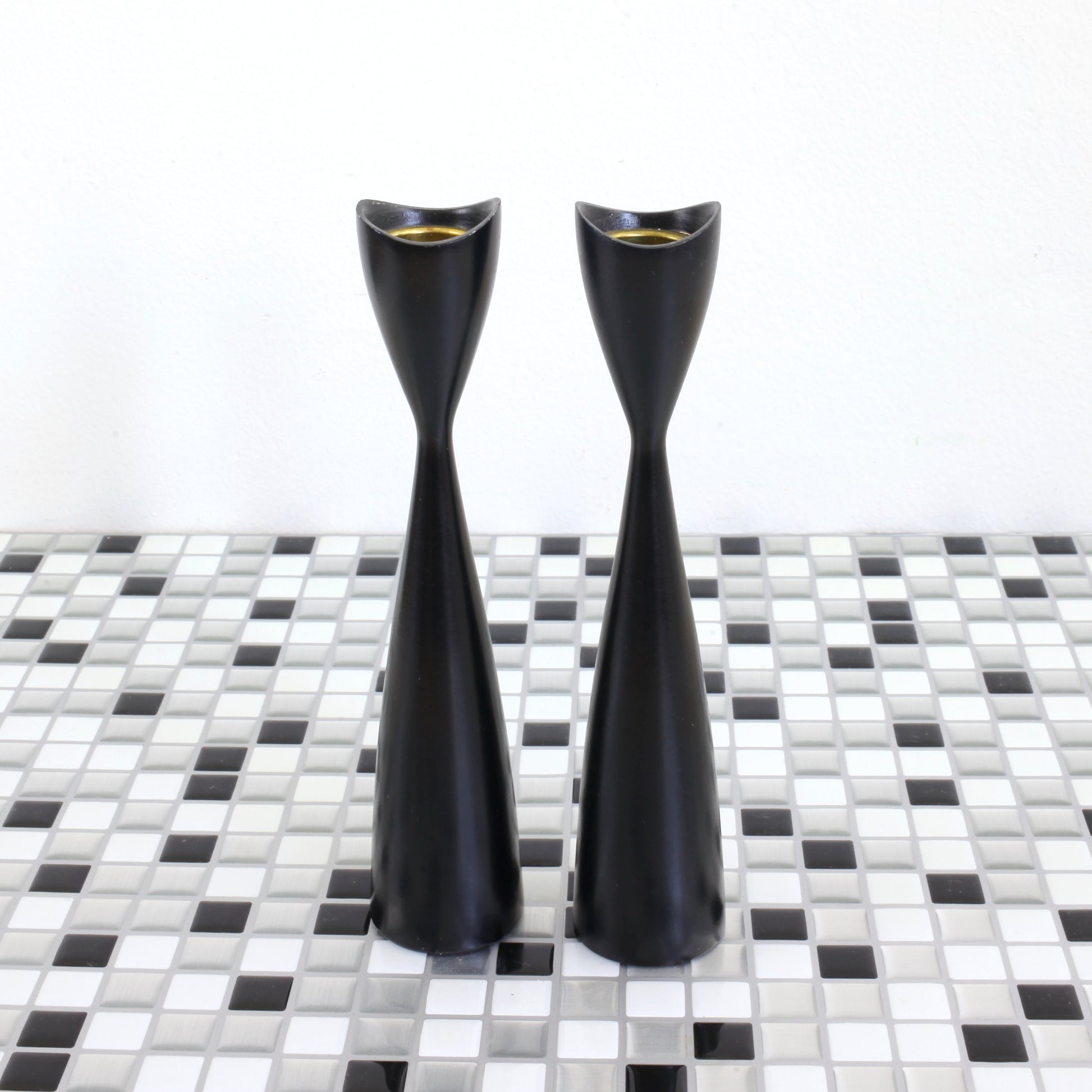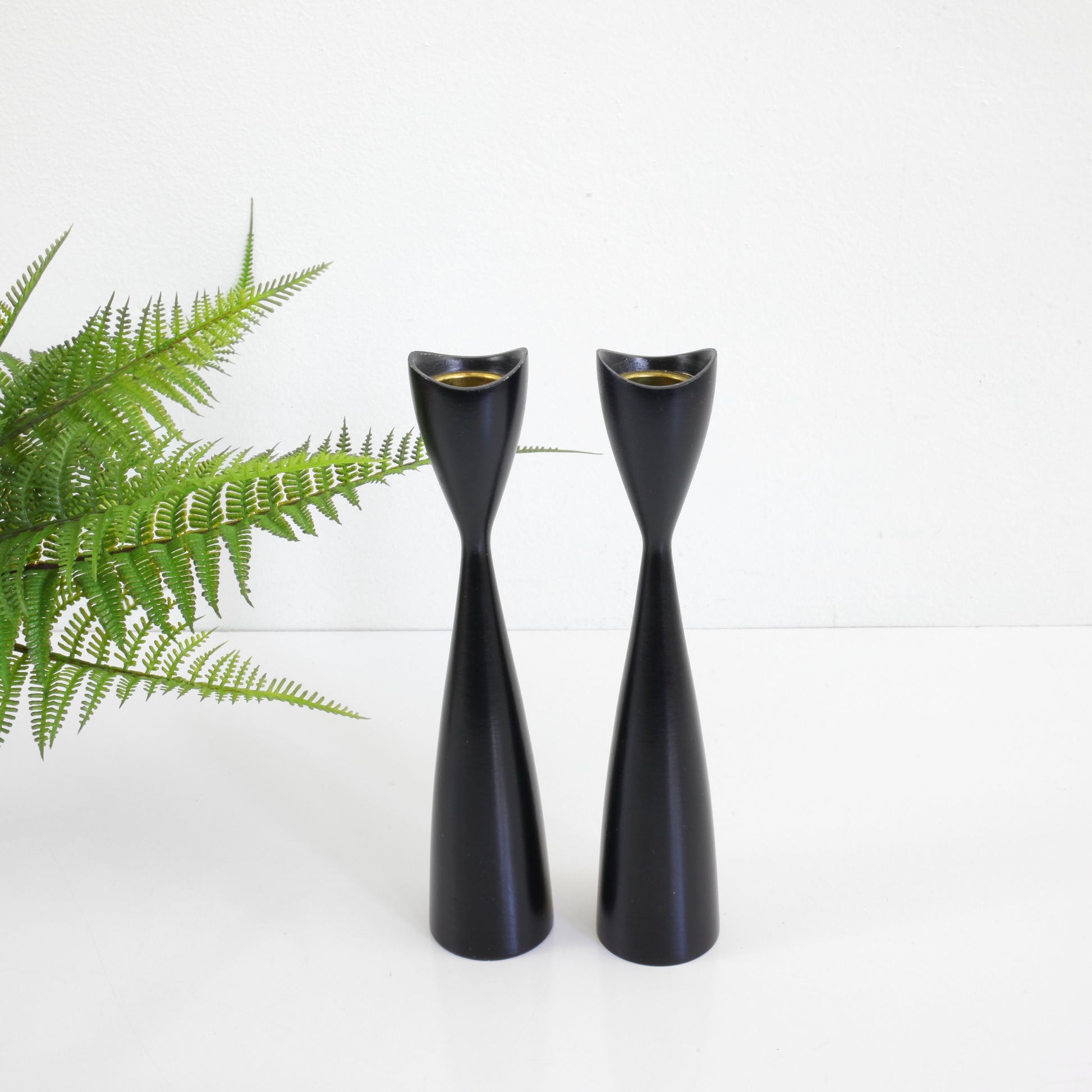 This absolutely stunning pair of mid century modern candlesticks is just gorgeous! Made in Denmark of solid, hand-turned wood with an elegantly curved mid century modern tulip shape, these candle holders each have a deep black painted finish and a shiny brass insert. Timeless and sleek, these candle holders will be the perfect addition to your mid century decor.