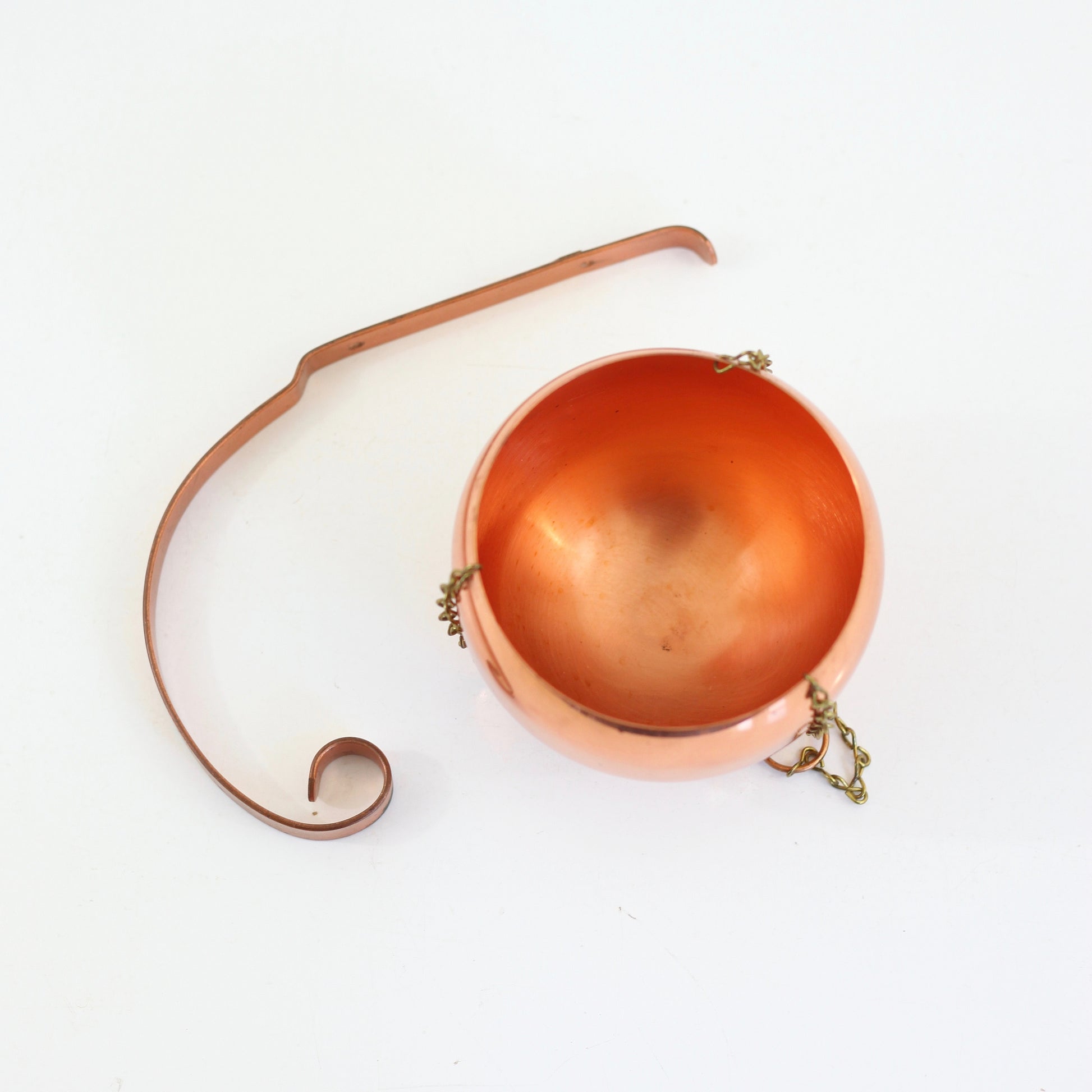 This gorgeous vintage copper and brass planter by Coppercraft Guild is just so lovely! With a beautiful copper body that's a bit larger than the mini planters I typically find, this beautiful pot features a linked brass chain, a shiny copper loop for hanging, and a scrolled copper wall bracket. Perfect for holding an extra special plant - or whatever else you can dream up!