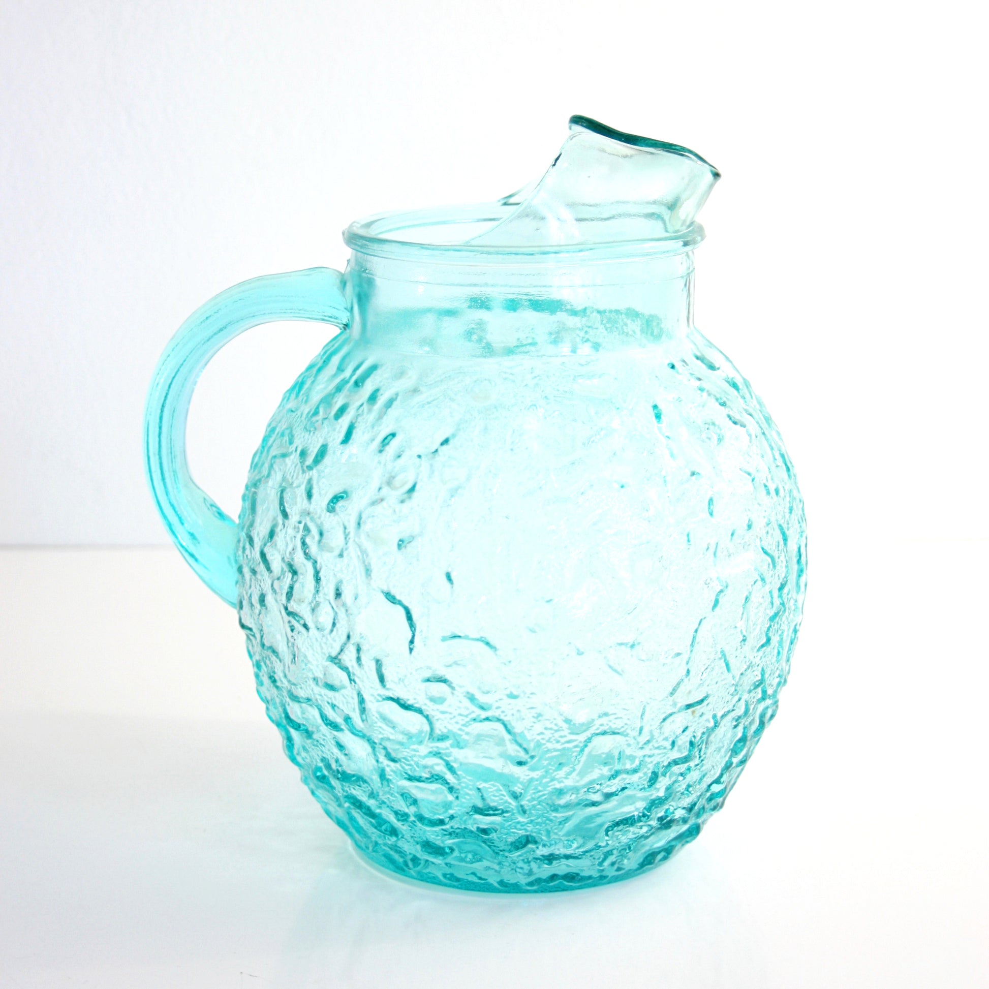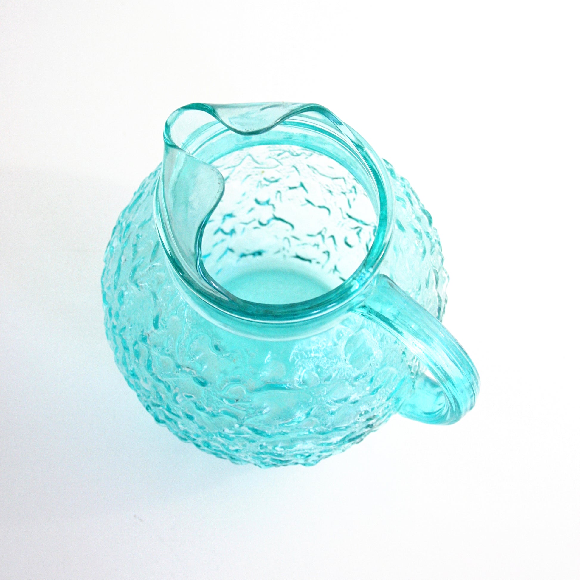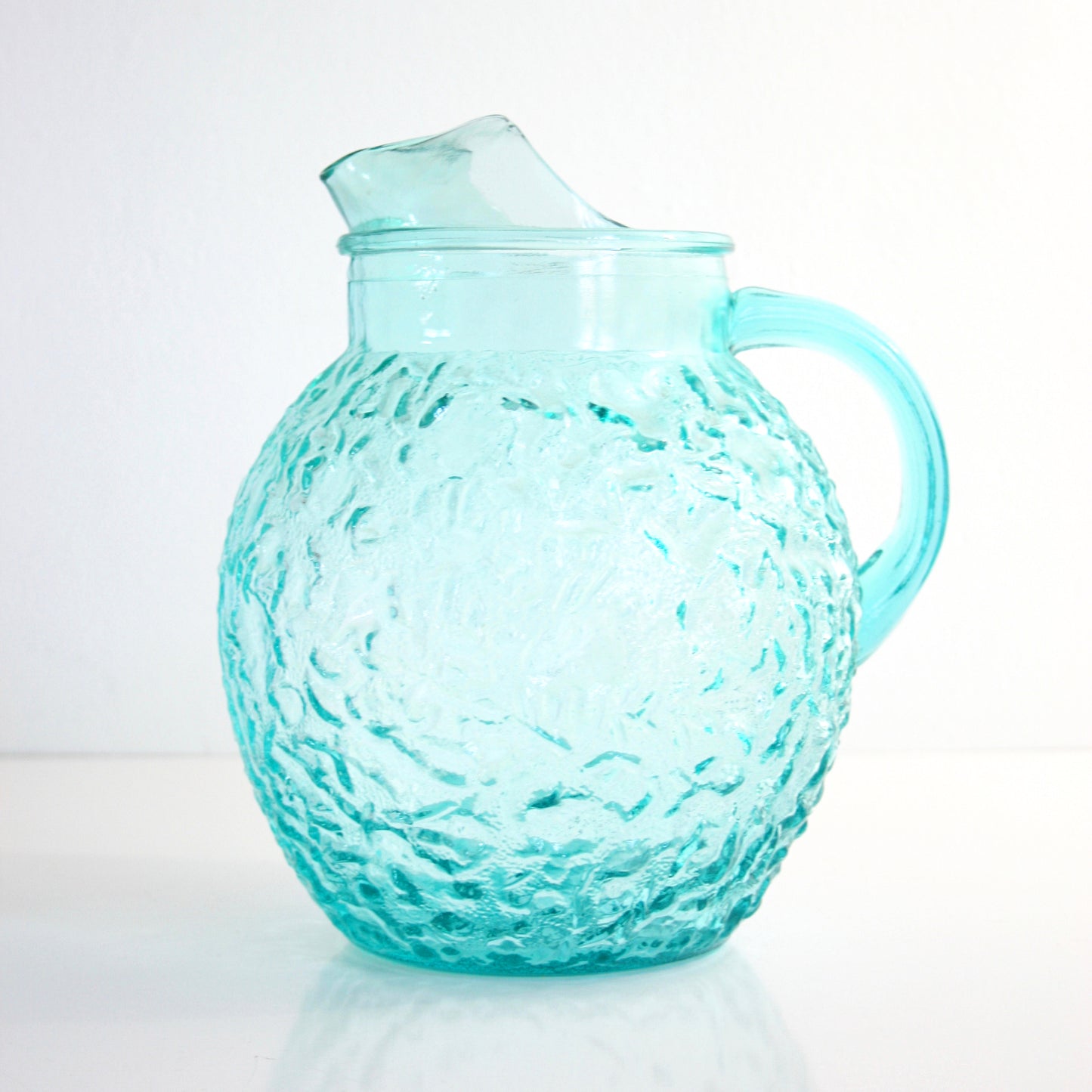 This fantastic vintage Lido glass pitcher is so gorgeous! Made by Anchor Hocking in the 1960s and 70s, this Lido pitcher is a gorgeous shade of aquamarine and features an awesome bumpy texture that makes it look like it's been carved out of ice. Hard to find in this color! Perfect for cocktails, iced tea, or an icy cold pitcher of water!