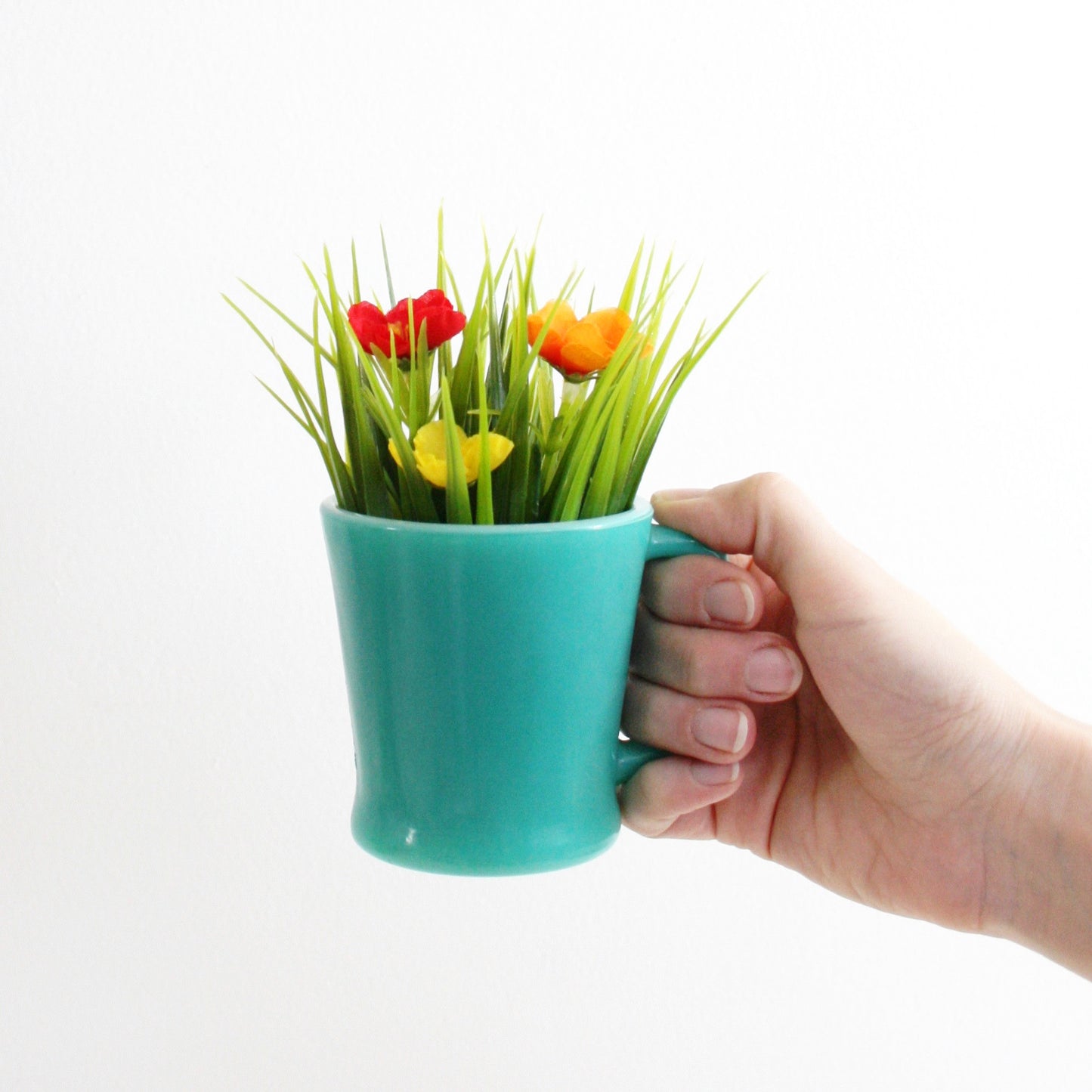 This bright and beautiful mid century aqua Fire King milk glass mug is a real stunner! Made of sturdy white milk glass with a gorgeous fired-on aqua finish, this mug is the classic D-handle shape. Hard to find in this fabulous mid century color, this mug is sure to brighten your day!