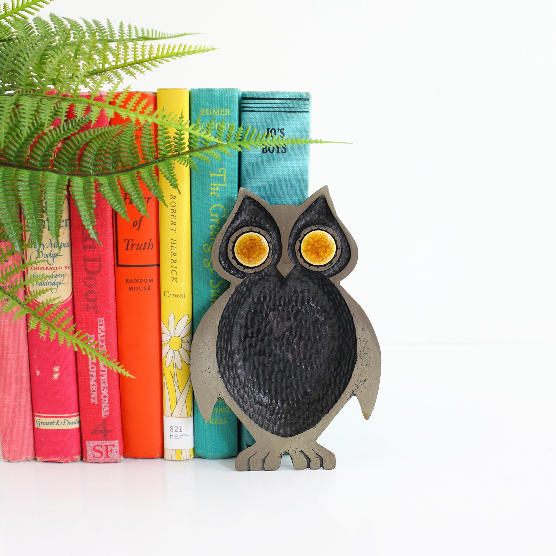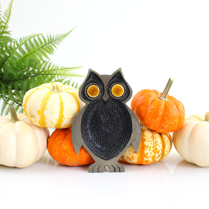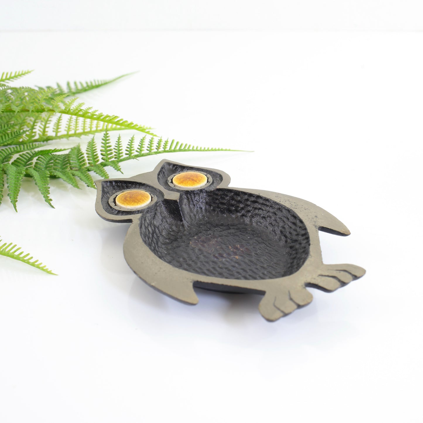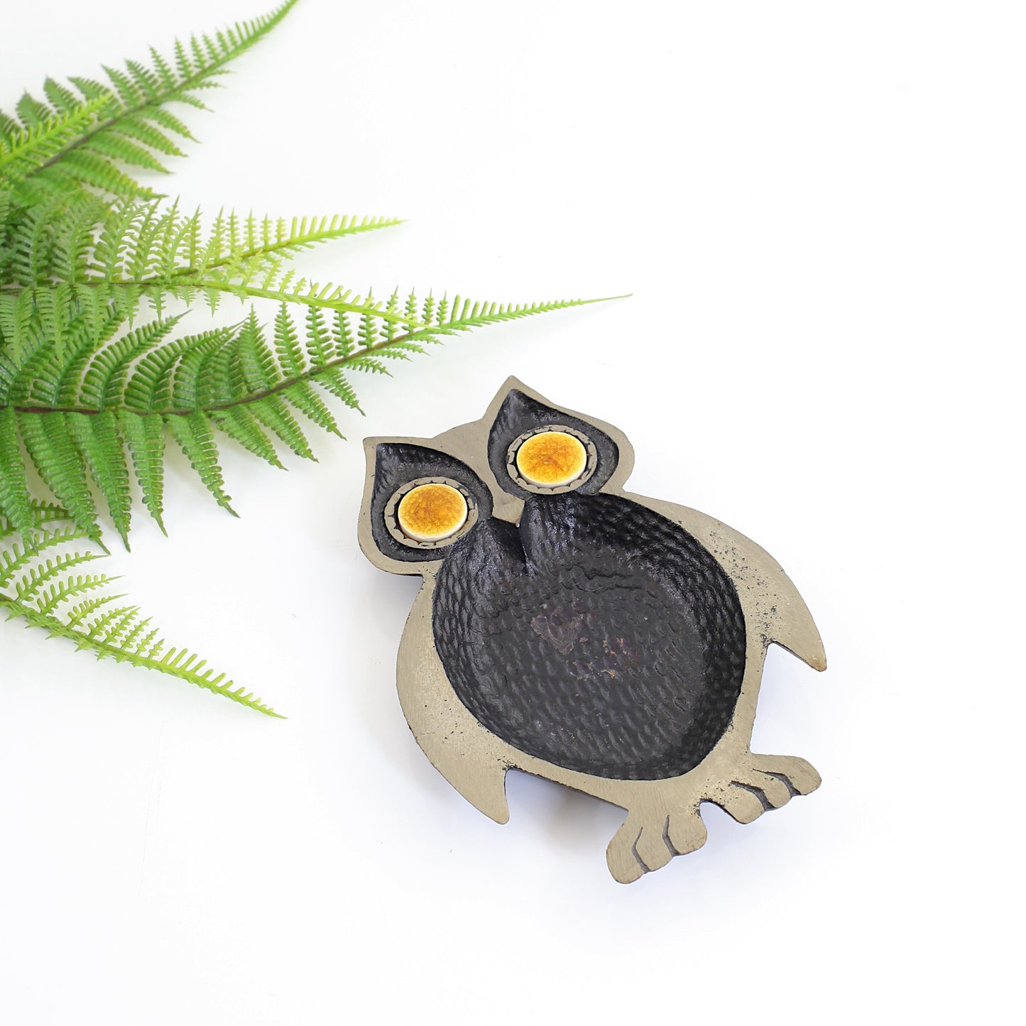 This super fun vintage owl trinket dish is a real hoot! Made of cast metal with a silver finish on the front, this mid century cutie has a textured black belly and gorgeous amber ceramic eyes. Perfect for catching change near your entryway or holding jewelry on your dresser, this little owl is sure to make you smile no matter where or how you use him!
