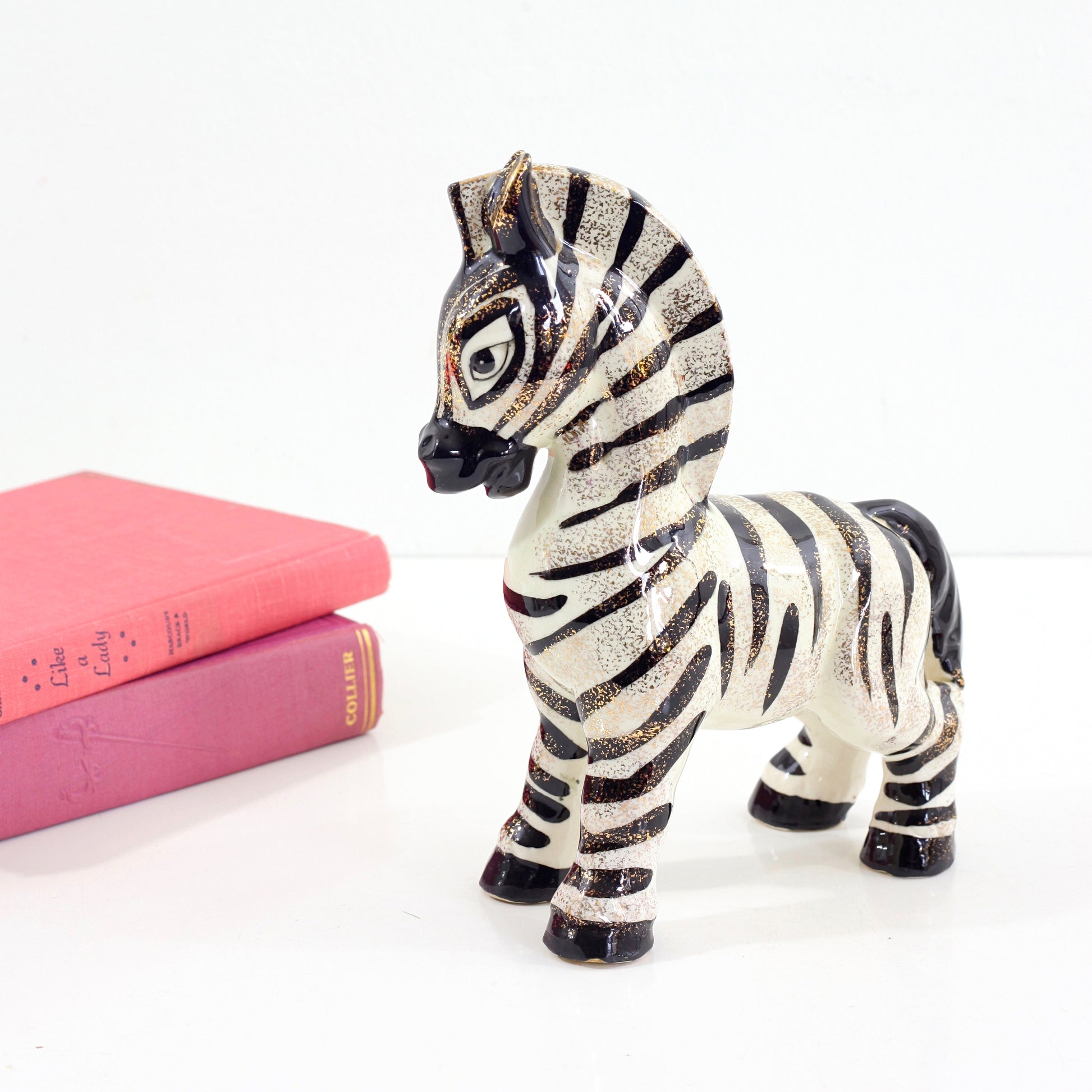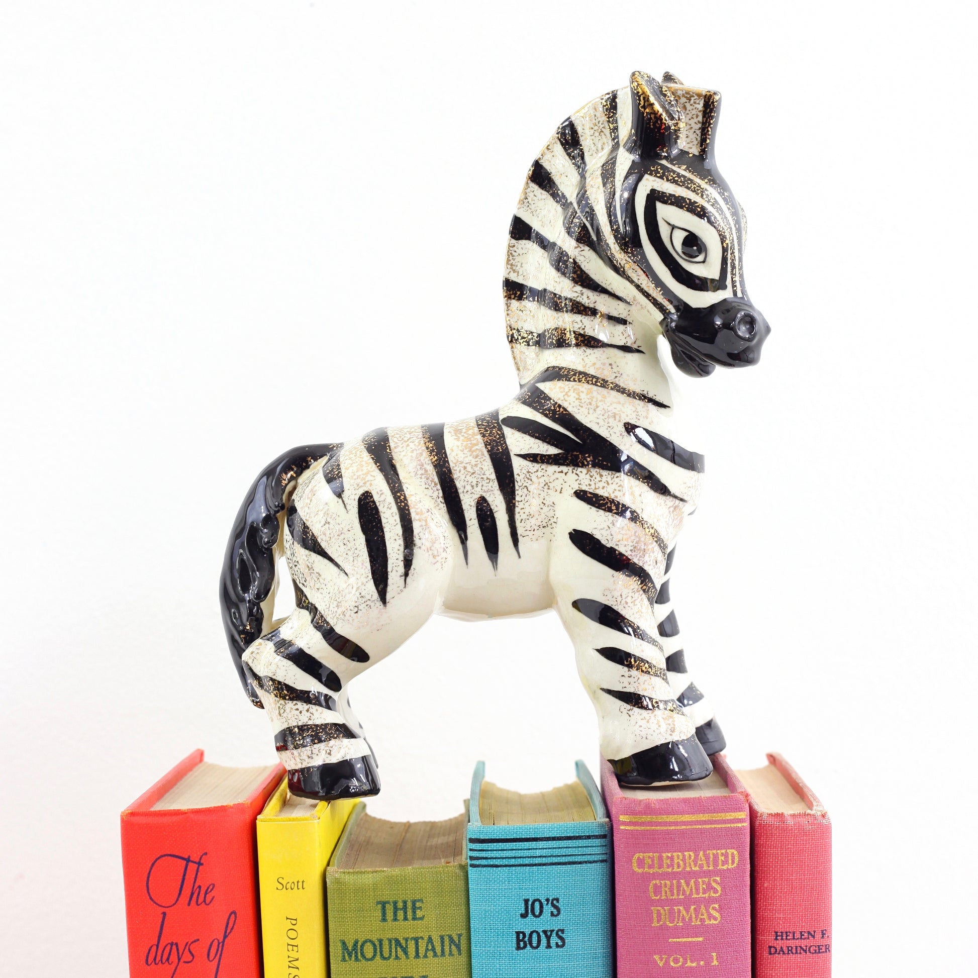 This gorgeous vintage ceramic zebra is a real stunner! Made of ceramic with hand painted details in black and white, this vintage cutie is finished with a dusting of gold flakes sealed beneath a high gloss glaze. Unmarked, but I've seen similar ceramic animals with stickers by Atlas of Japan. A super fun piece that's sure to add plenty of vintage charm to your decor!