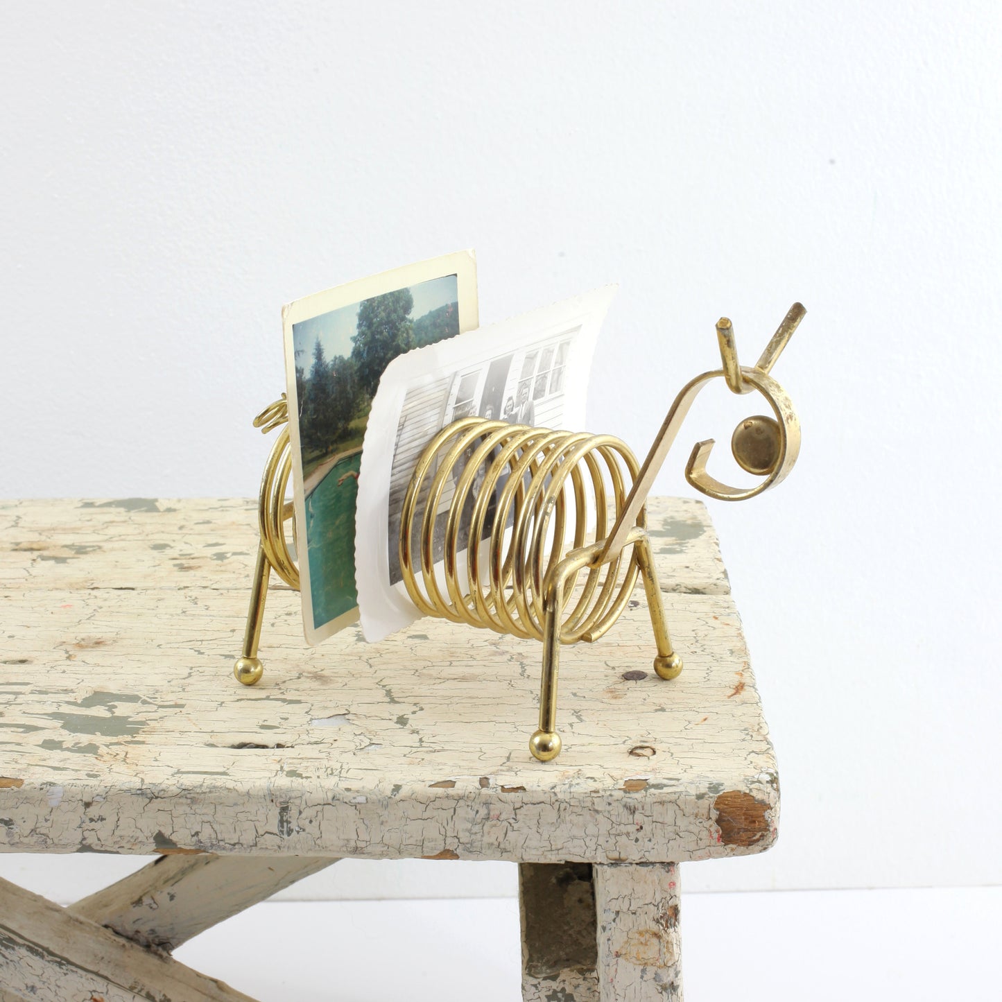 This fun vintage coiled critter letter holder is just too cute! Made in the in the 1960s, this coiled gold-tone metal desk organizer is as fun as it is useful - stash your letters and photos between the coils, and tuck your your favorite pen or pencil inside his tail! Perfect for holding mail in your entryway or photos on your dresser, you're going to love this vintage cutie no matter how or where you use it!
