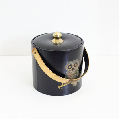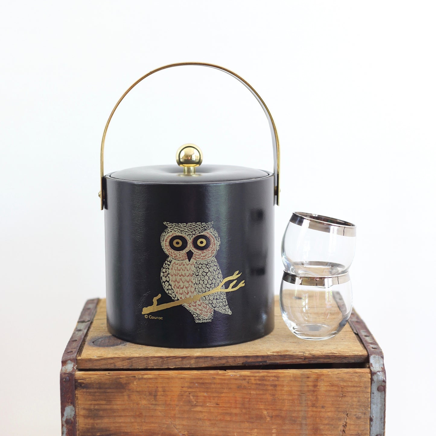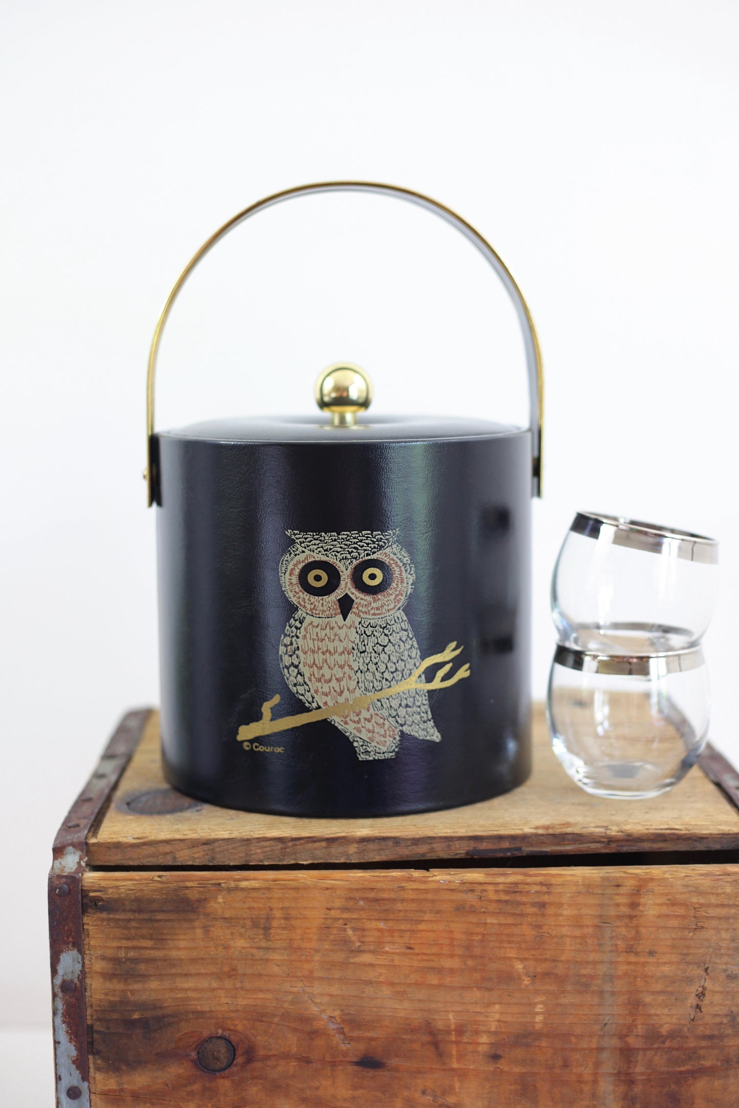This fabulous mid century owl ice bucket is a real hoot! Made in the 1960s by Couroc of Monterey, California, this handsome ice bucket is made of rich, black vinyl with a gold-tone metal handle and knob. Front of ice bucket is decorated with Couroc's iconic owl motif in gold and brown. The perfect addition to your mid century bar cart!