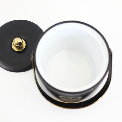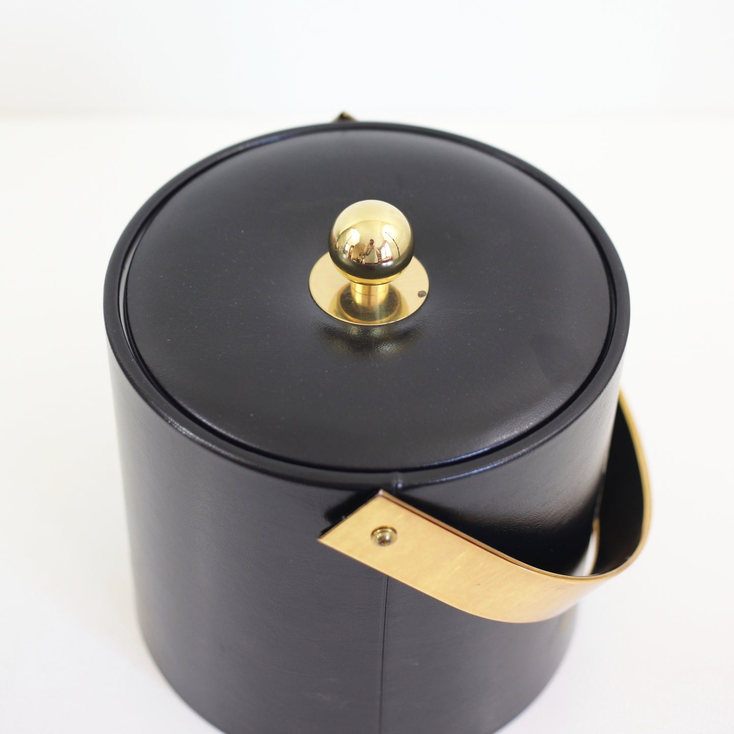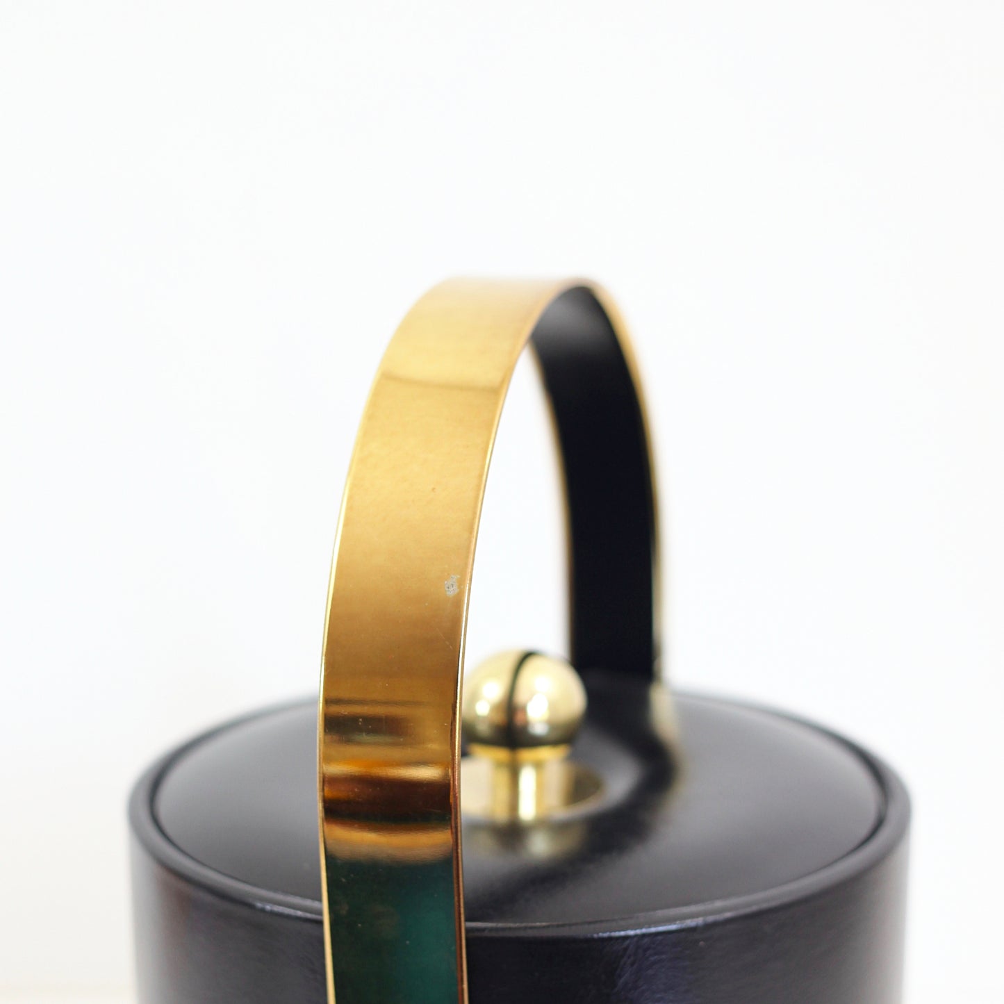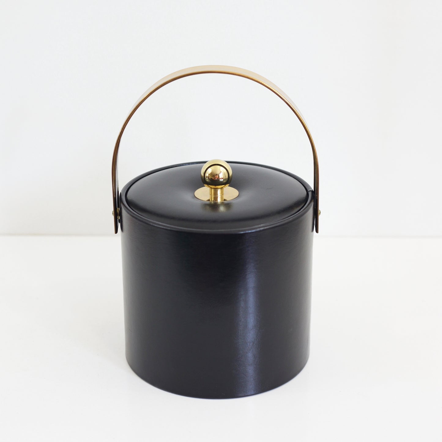 This fabulous mid century owl ice bucket is a real hoot! Made in the 1960s by Couroc of Monterey, California, this handsome ice bucket is made of rich, black vinyl with a gold-tone metal handle and knob. Front of ice bucket is decorated with Couroc's iconic owl motif in gold and brown. The perfect addition to your mid century bar cart!