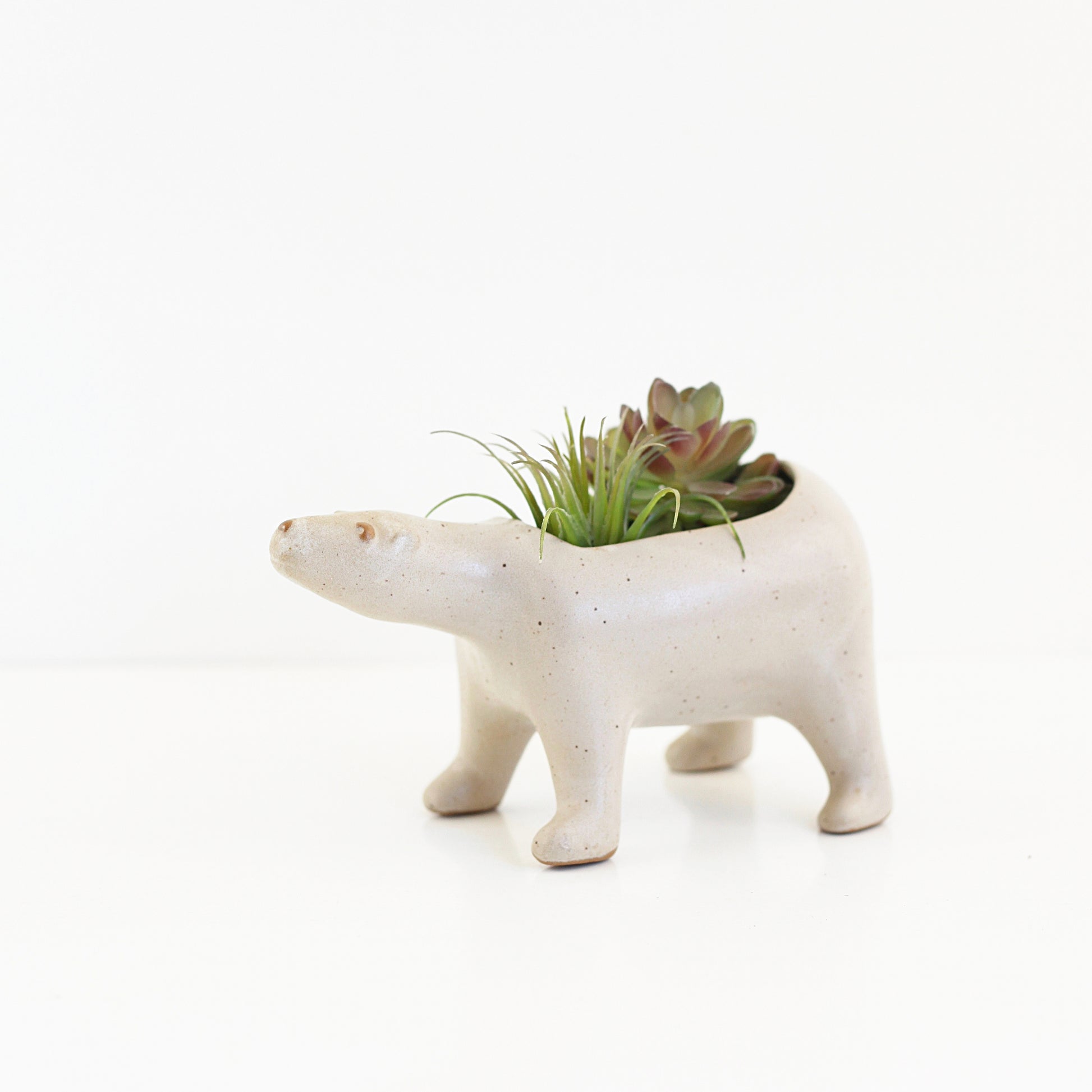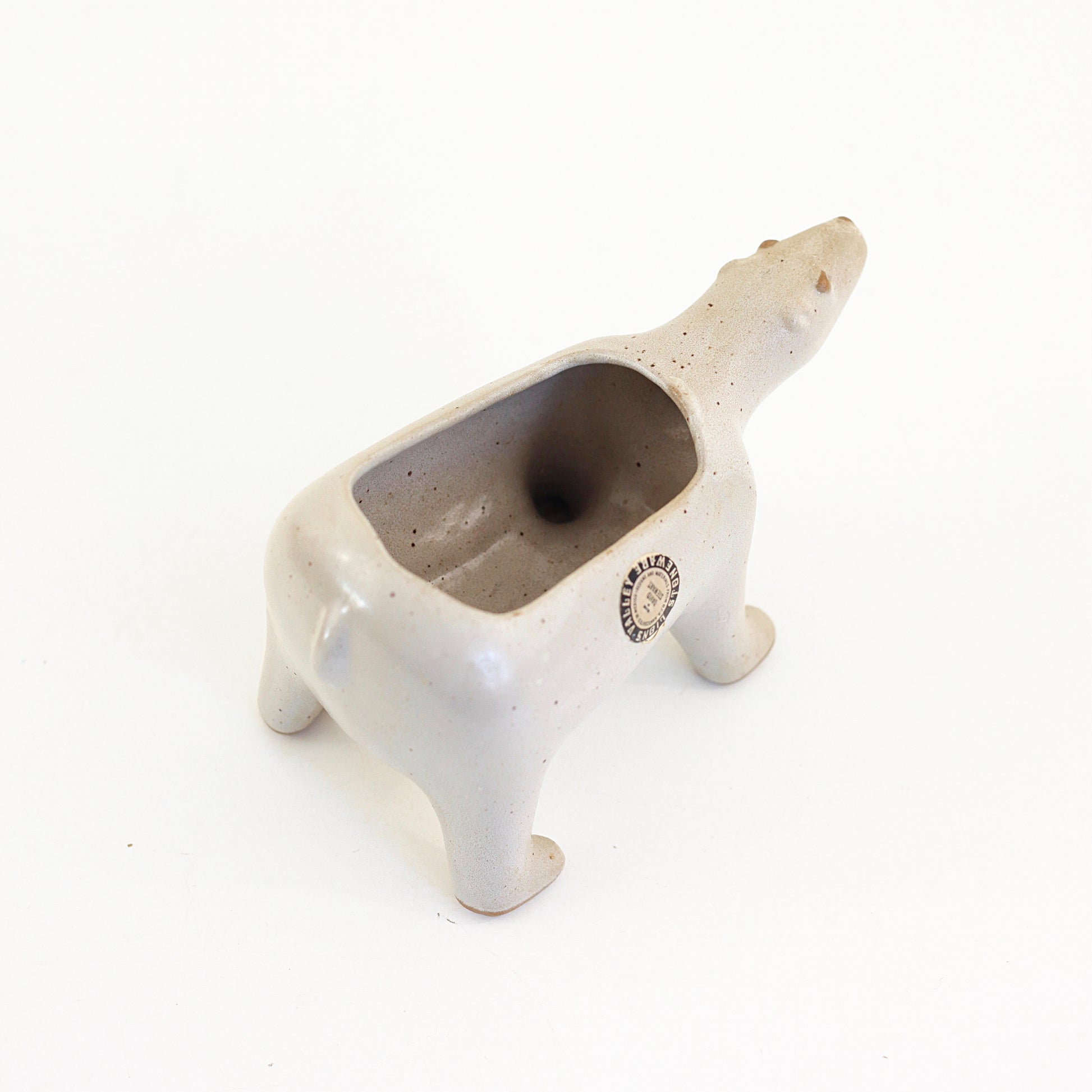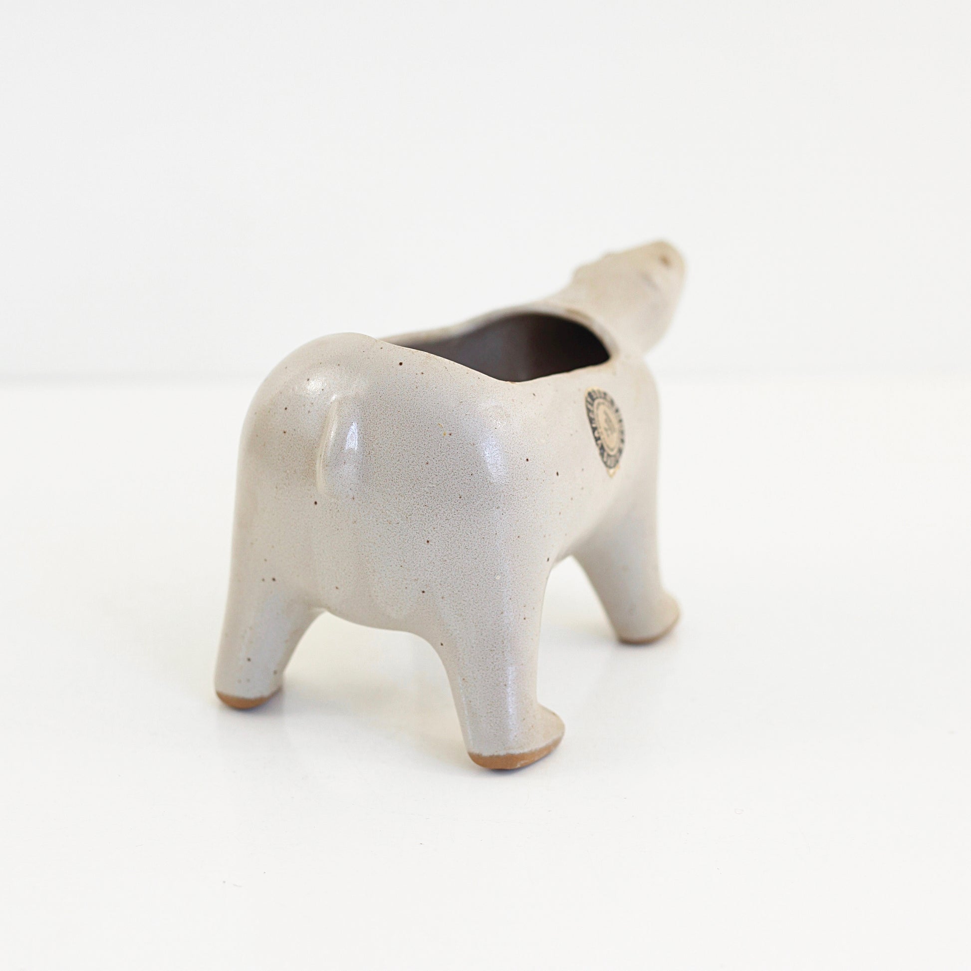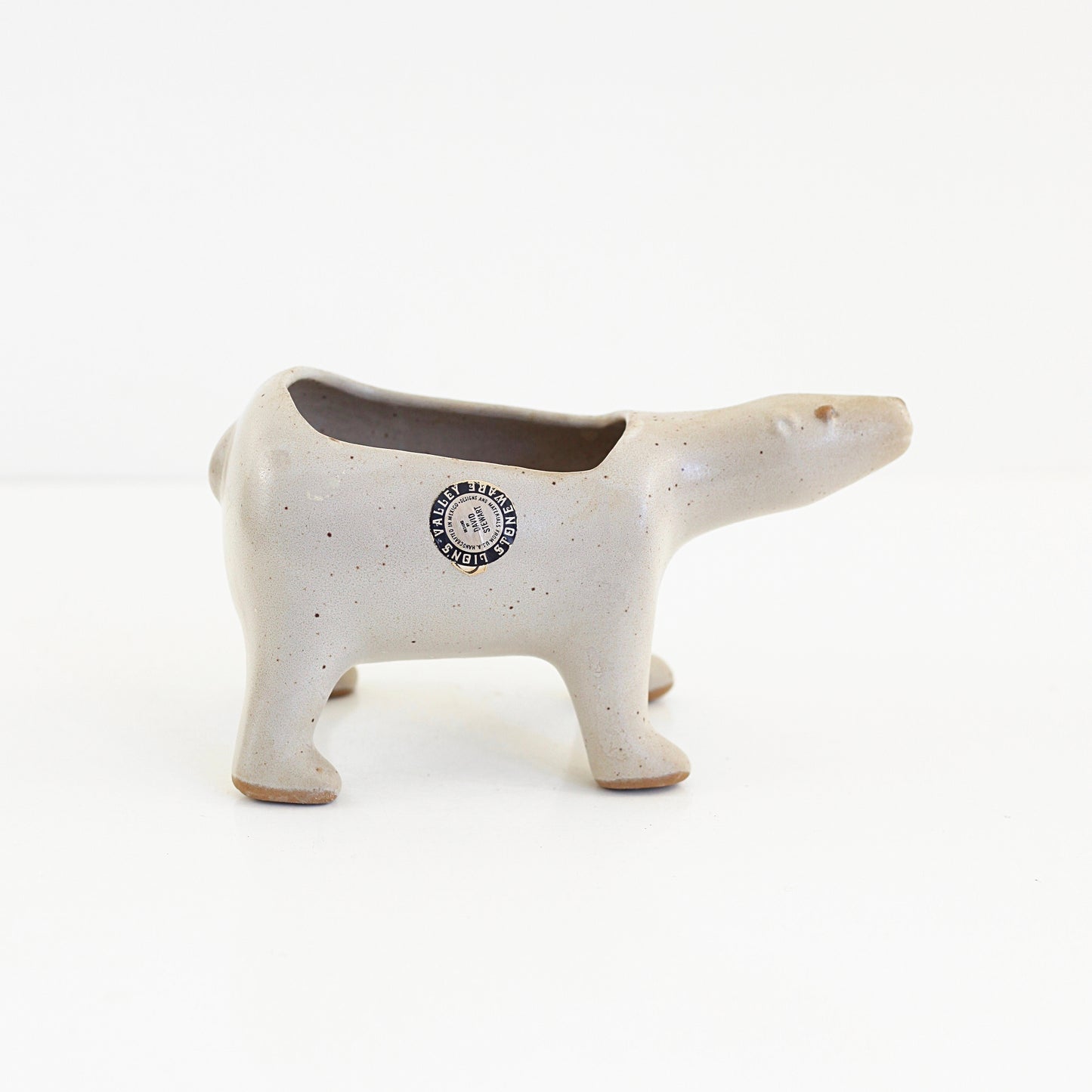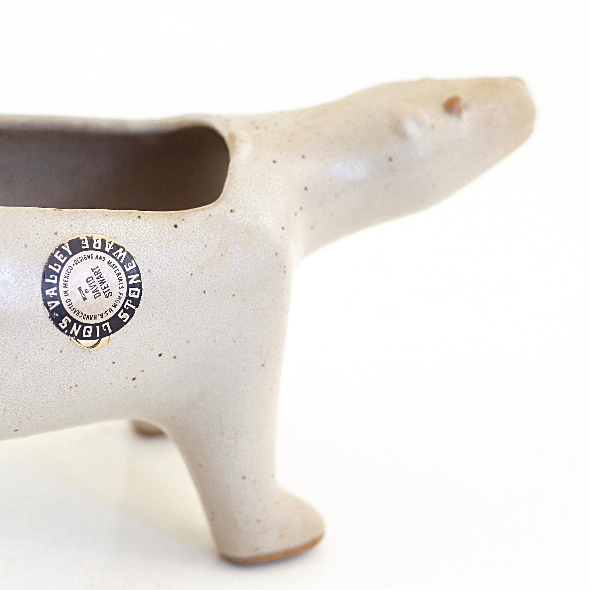 This beautiful mid century polar bear planter is a real stunner! Made by California ceramicist David Stewart for his famous Lion's Valley Stoneware, this beautiful planter has all the charm Stewart is known for. An extremely hard to find piece, this stoneware planter is perfect for holding a few succulents or house plants, catching odds and ends on your dresser, or whatever you please!