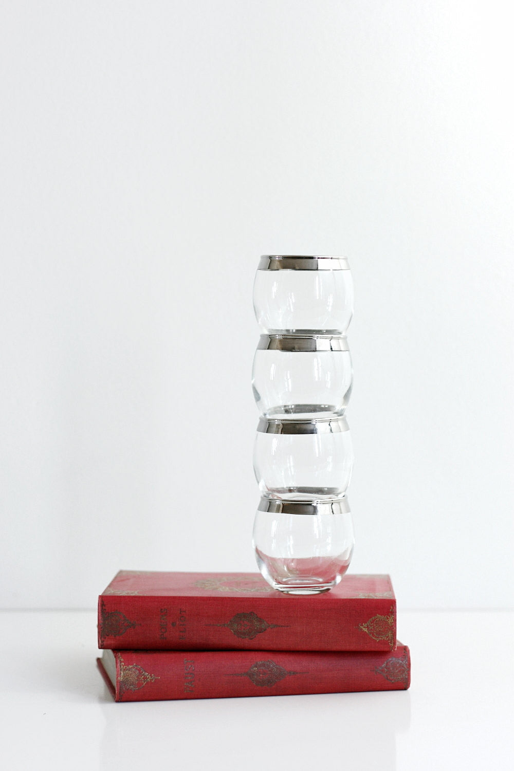 This gorgeous set of four Dorothy Thorpe inspired roly poly double shot glasses feature a lovely silver band around the top. These little glasses look exactly like the larger tumbler version, only, well, smaller - they hold about two standard shots of your favorite liquor. Take these beauties home and throw a cocktail party even the Drapers would be proud to attend!