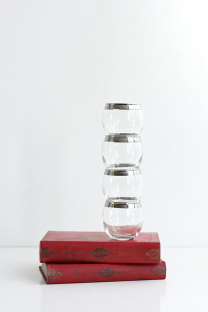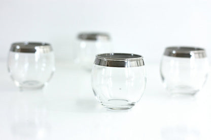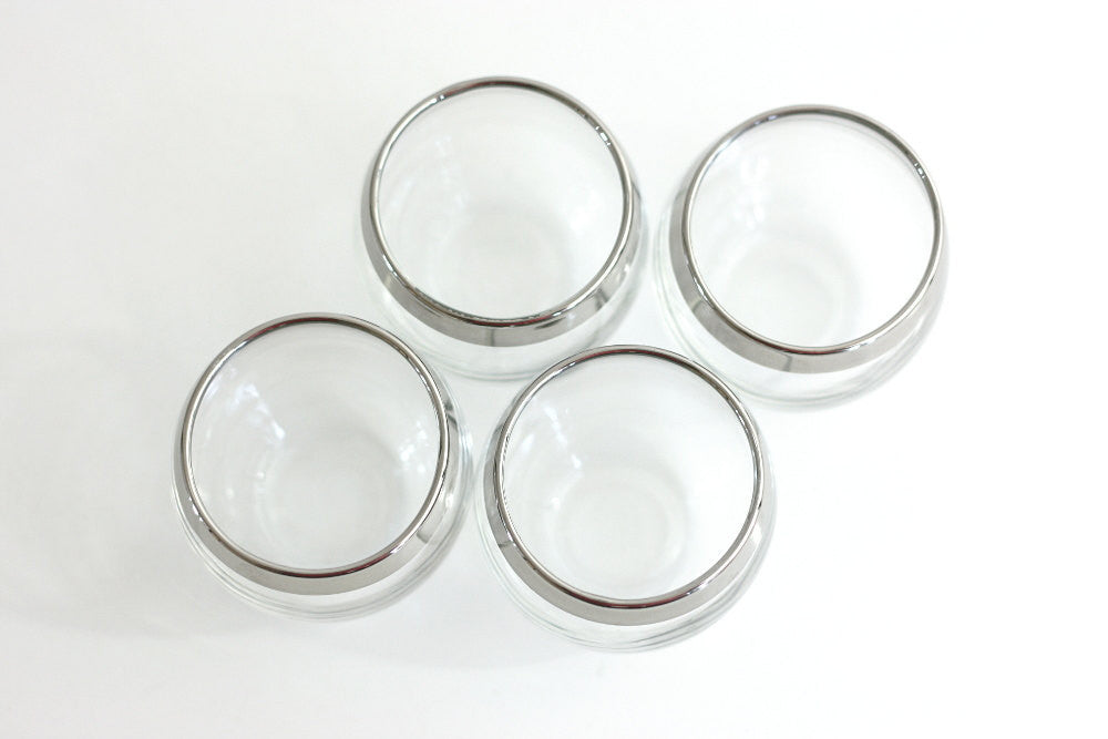 SOLD - Mid Century Dorothy Thorpe Roly Poly Silver Rim Double Shot Glasses