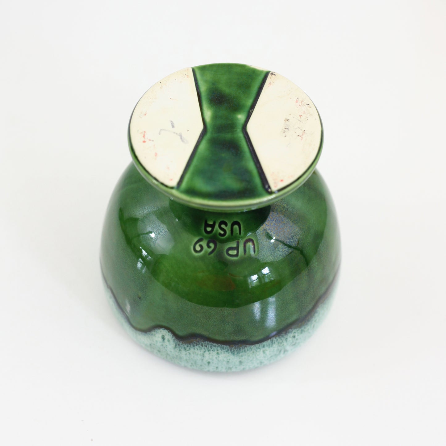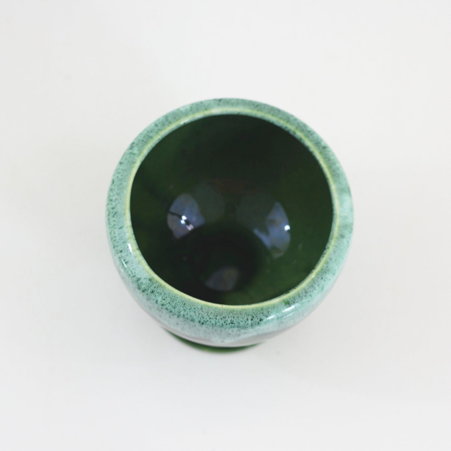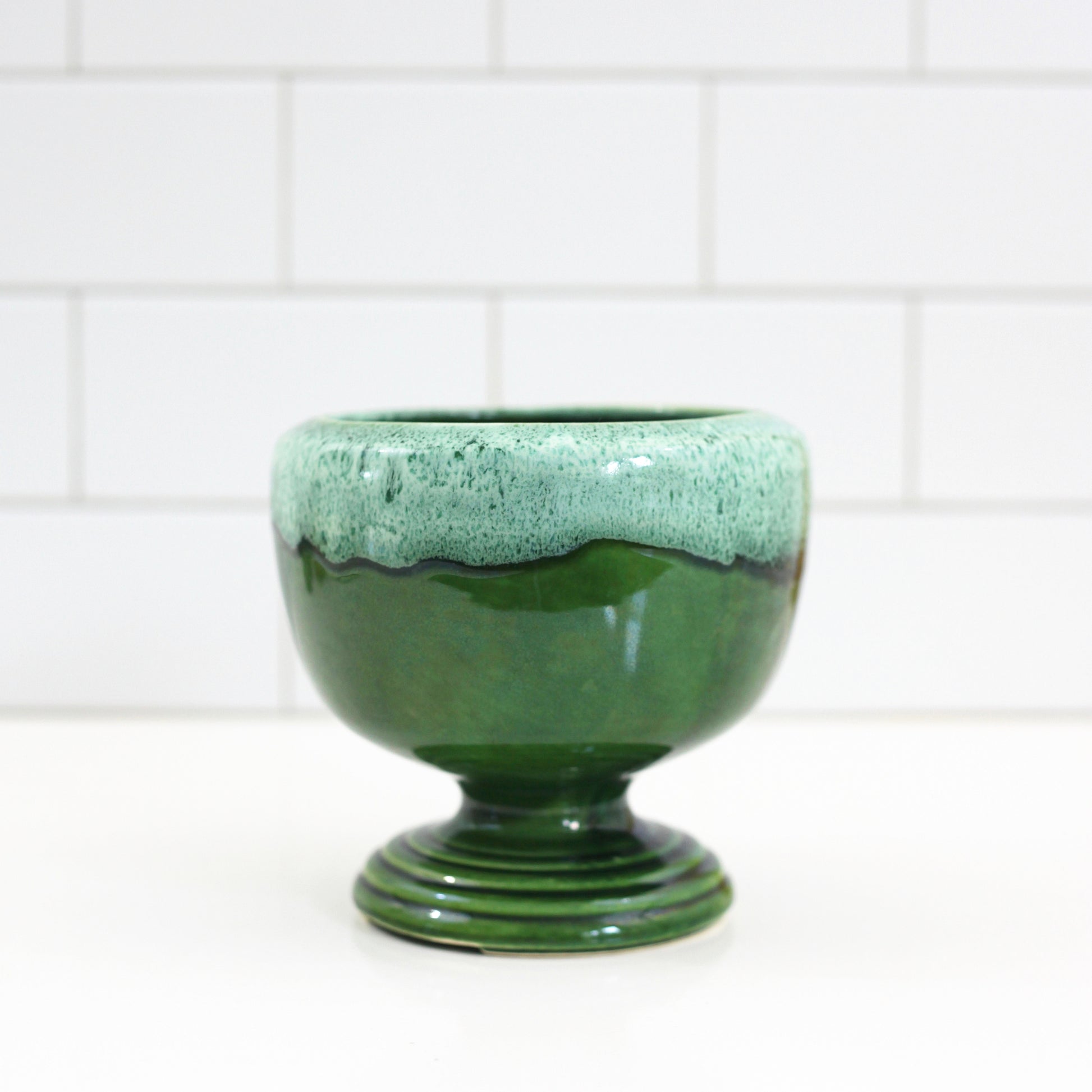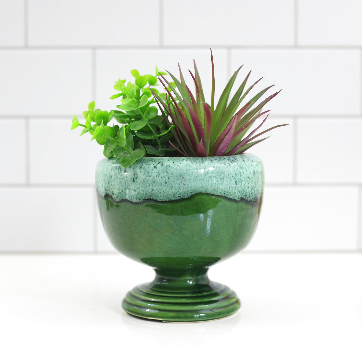 This fabulous mid century modern drip glaze ceramic planter is so retro and fun! In a gorgeous shade of deep emerald green with a ring of mint drip glaze near the rim, this planter has a great rounded pedestal shape and fun mid century vibe. Perfect for making your favorite plant feel extra special, but also great for catching change on your dresser, holding fruit on your kitchen counter, or whatever else you can dream up!