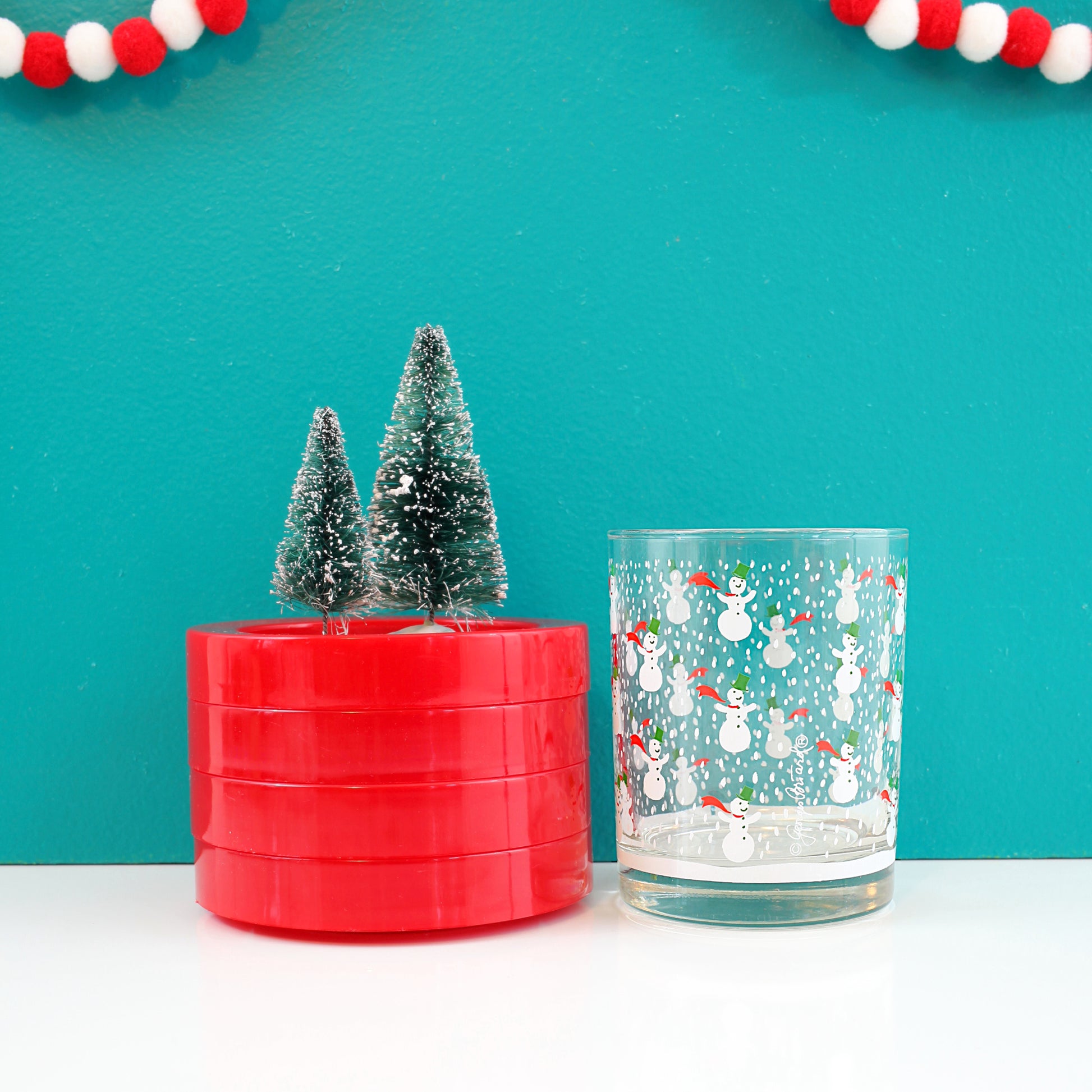 This fun and festive glassware set by Georges Briard is so colorful and fun! Designed and signed by prolific mid century designer Georges Briard, this set includes four double old fashioned glasses, four bright red plastic and cork coasters, and the original box. Glasses each feature sweet retro snowmen with a flurry of snowflakes all the way around - the perfect way to add some vintage holiday cheer to all of your winter celebrations!