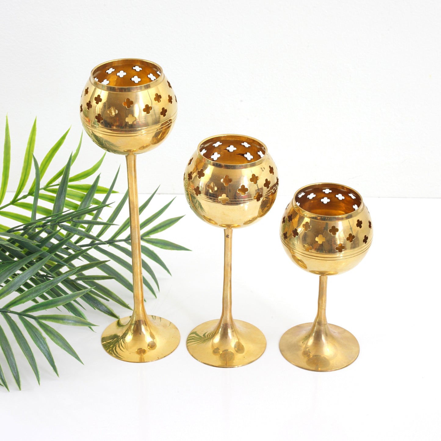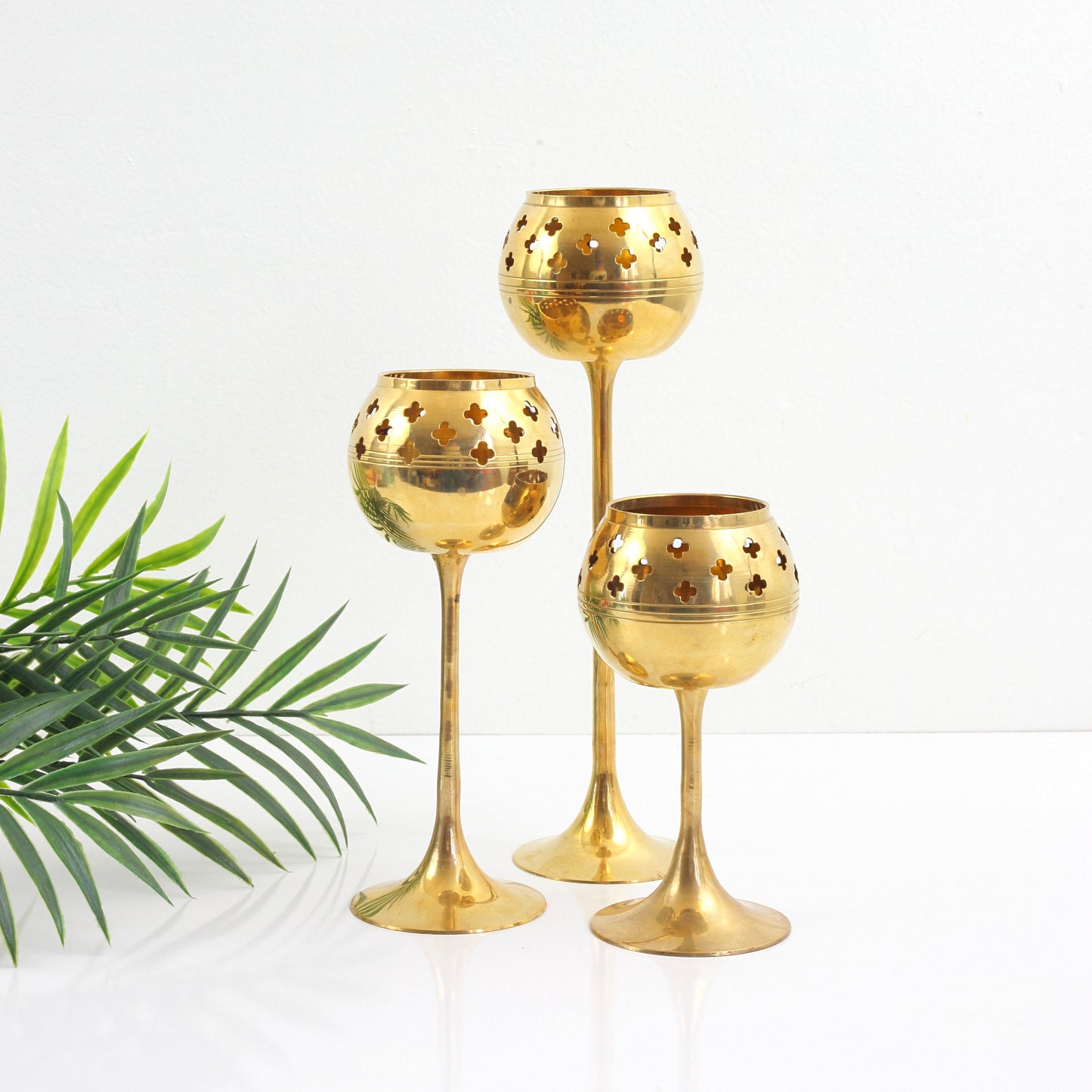 This stunning set of three mid century brass candle holders is just gorgeous! With a beautiful patina and warm, gorgeous golden color, these candlesticks are varying heights, allowing you to create any number of centerpieces or displays. Each candle holder sits atop a tulip base and features a beautiful cut-out quatrefoil design. Simple yet stunning, these beautiful candle holders are sure to add a touch of mid century charm to your table or shelf!