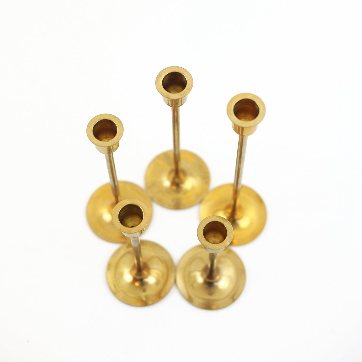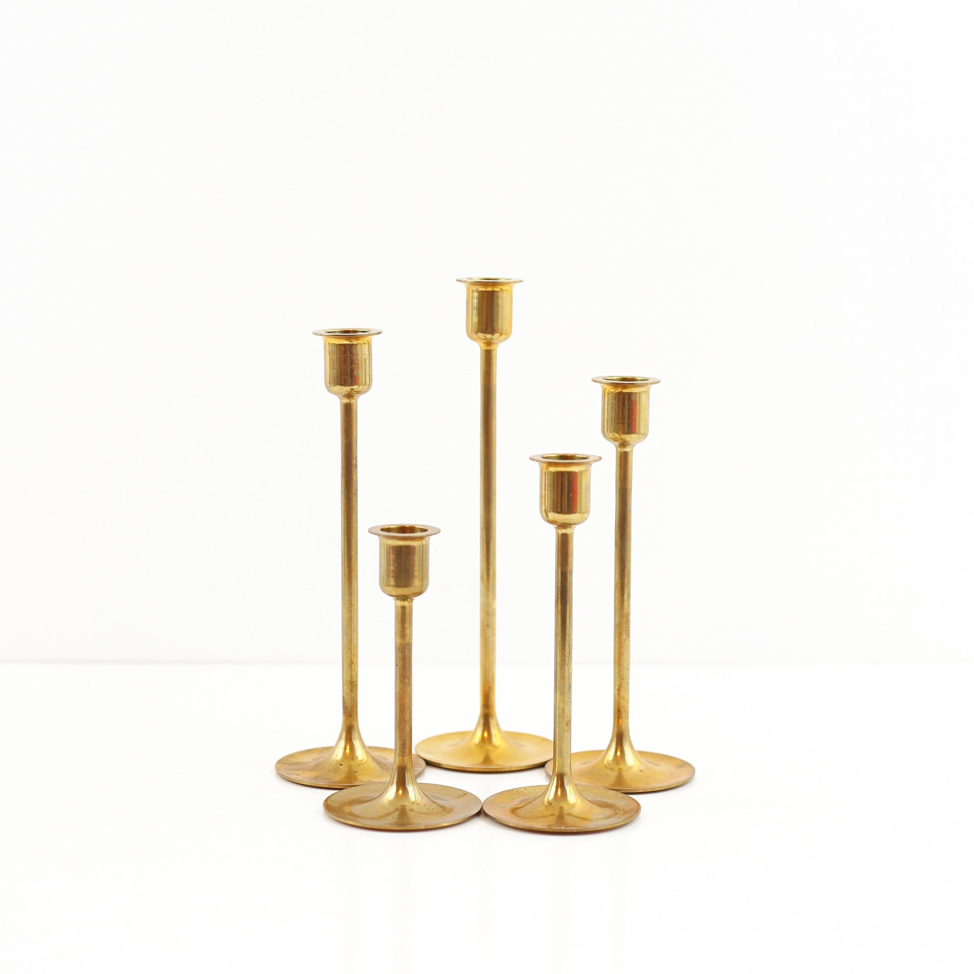 This handsome set of five mid century brass candlesticks is just gorgeous! With a beautiful patina and warm, gorgeous golden color, these candlesticks are varying heights, allowing you to create any number of centerpieces or displays. Simple yet stunning, these beautiful candlesticks are sure to add a touch of mid century charm to your table or shelf!