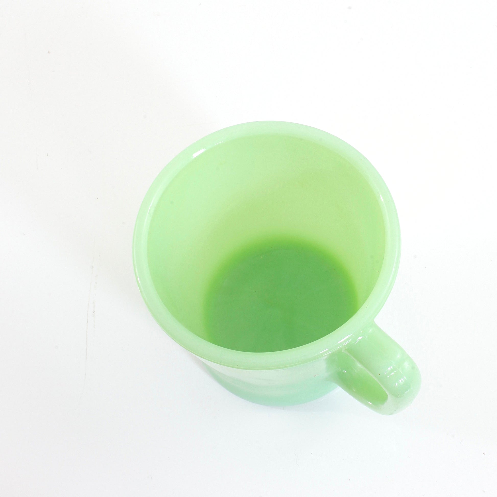 ➝ In fantastic condition! No chips or cracks. Minor spots of color variation in glass, which is common with older jadeite pieces. Inside of mug shows loss of shine and extremely light discoloration. Overall, just gorgeous!