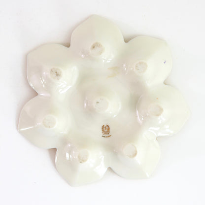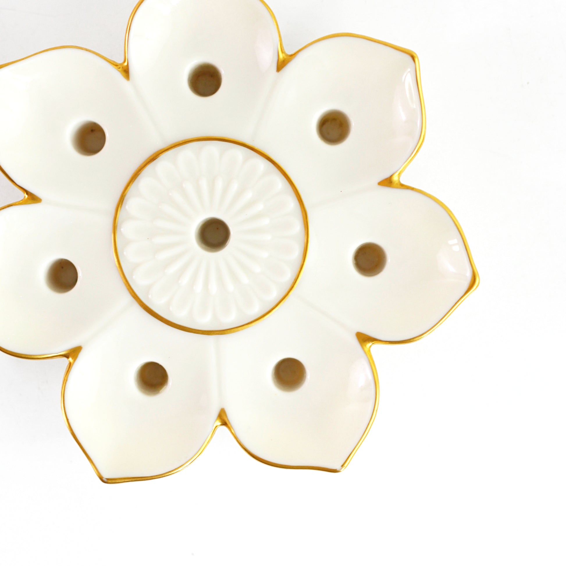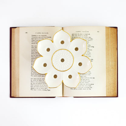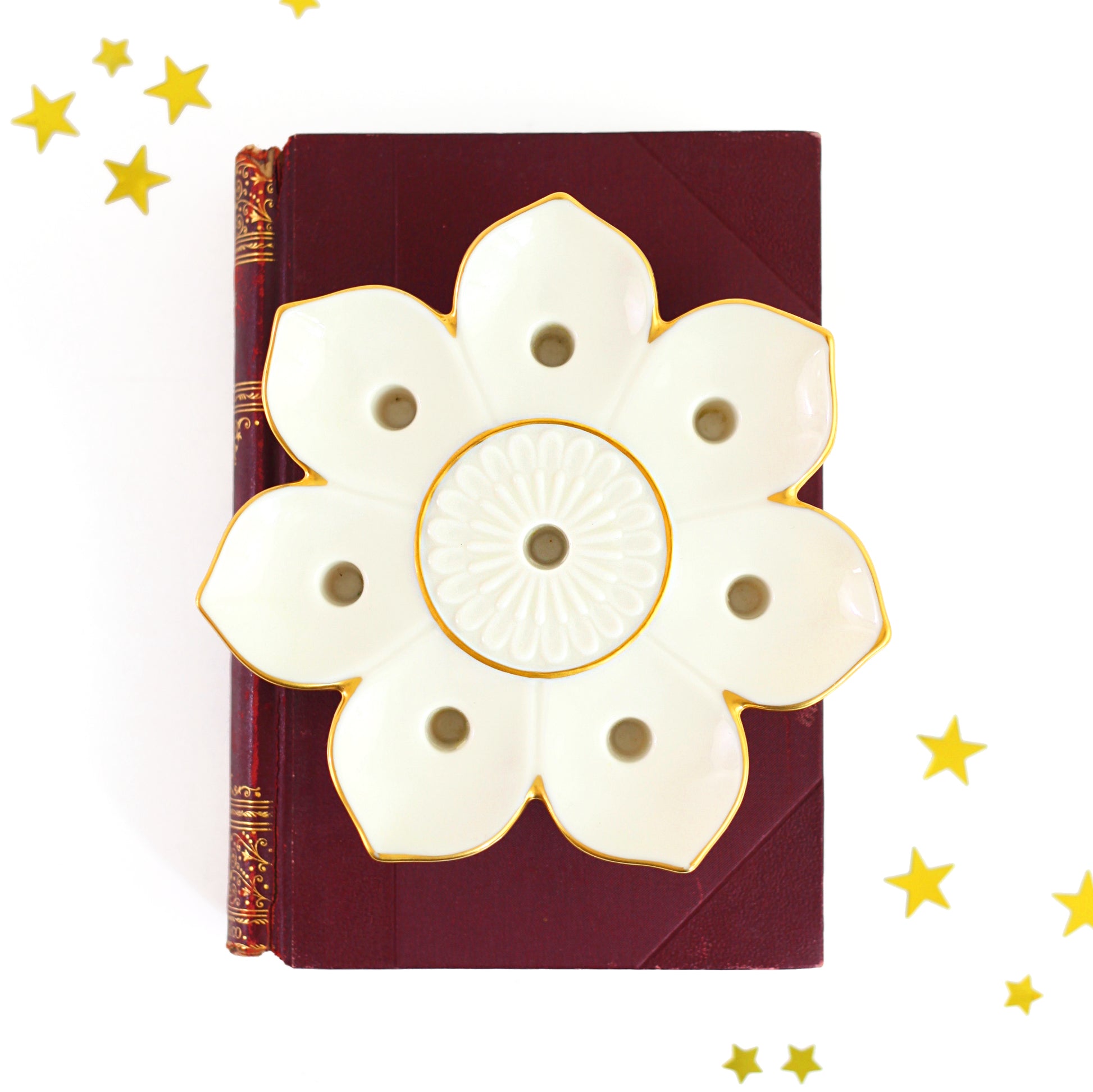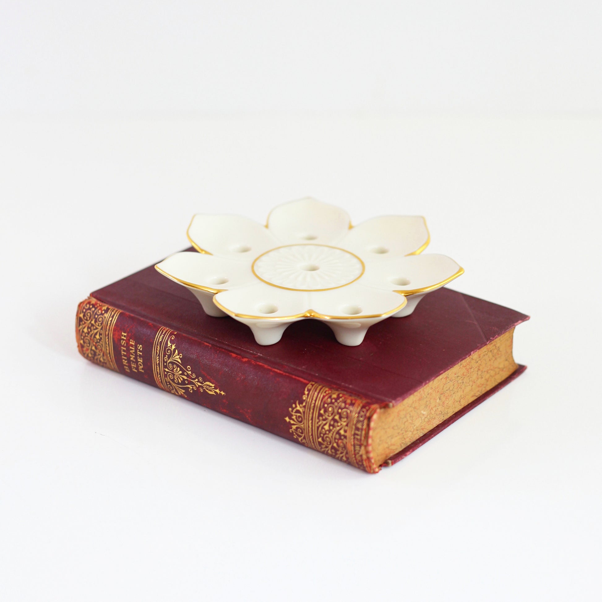 This beautiful vintage Lenox flower candle holder is so simple and elegant! Made in the USA, this ivory-colored candle holder has gorgeous petal detailing in the center and the stunning gold detailing Lenox is known for. Each of the eight holes holds a tiny taper candlestick, or any candle about 3/8 inches in diameter. Perfect for adding a bit of mid century elegance to your table or shelf!