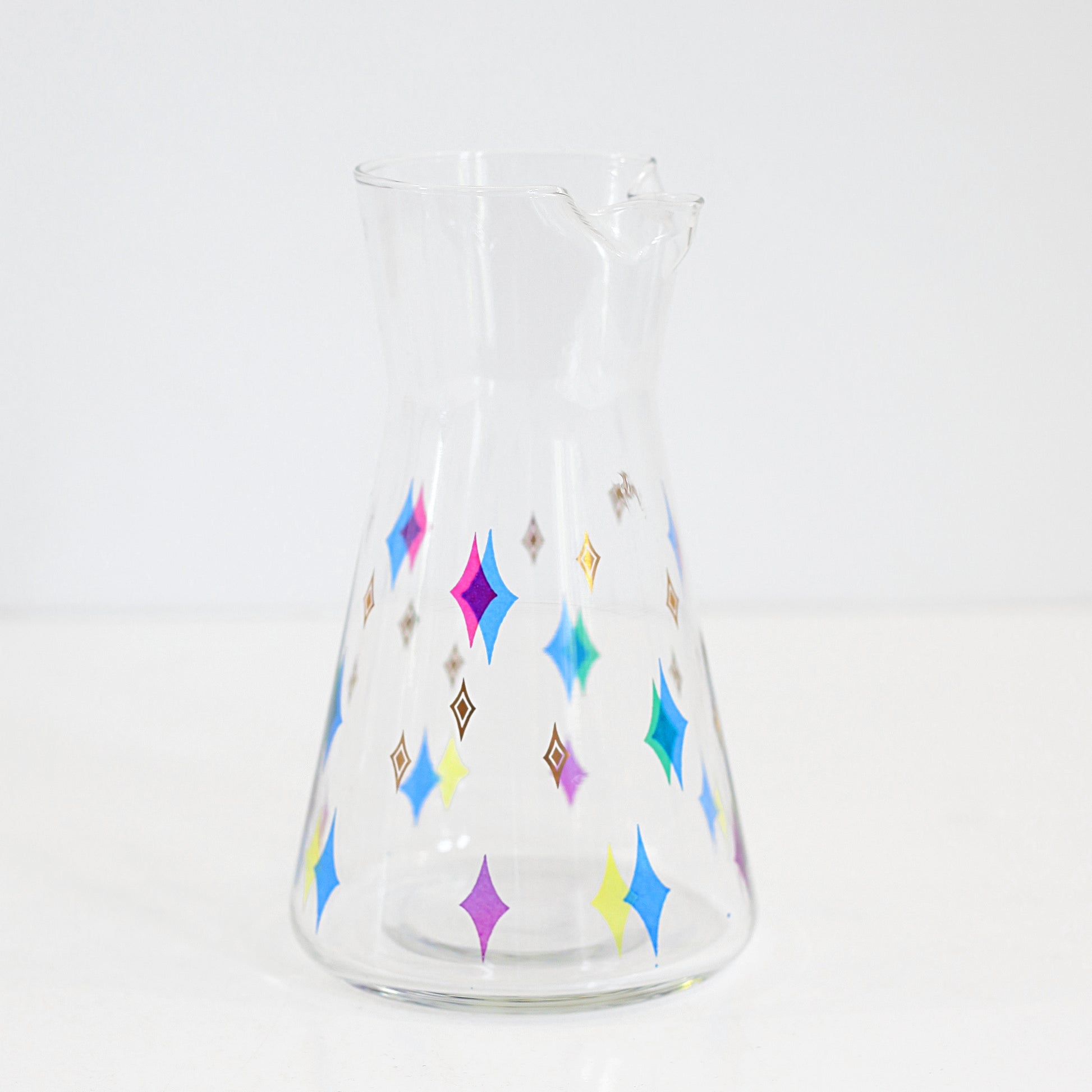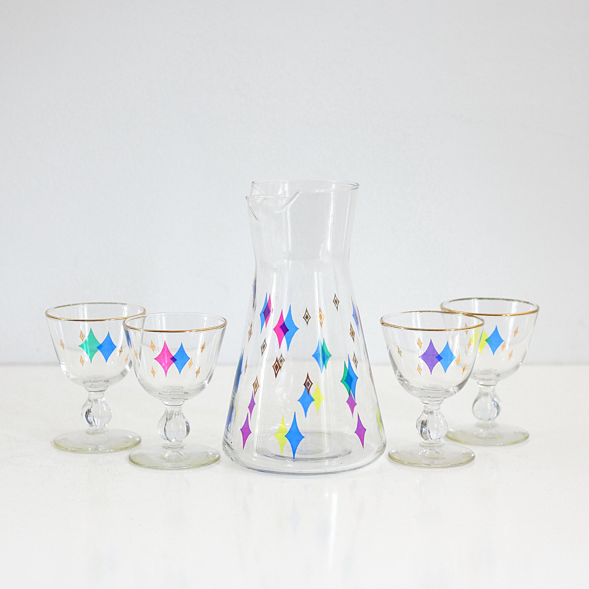 Hands down one of the most fabulous vintage cocktail sets I've come across, this mid century modern atomic starburst barware set is so classy and fun! Set includes a decanter and four gold-rimmed stemmed glasses each decorated with brightly-colored atomic starbursts. Perfect for making your next cocktail party extra special, and guaranteed to make your bar cart extra classy.