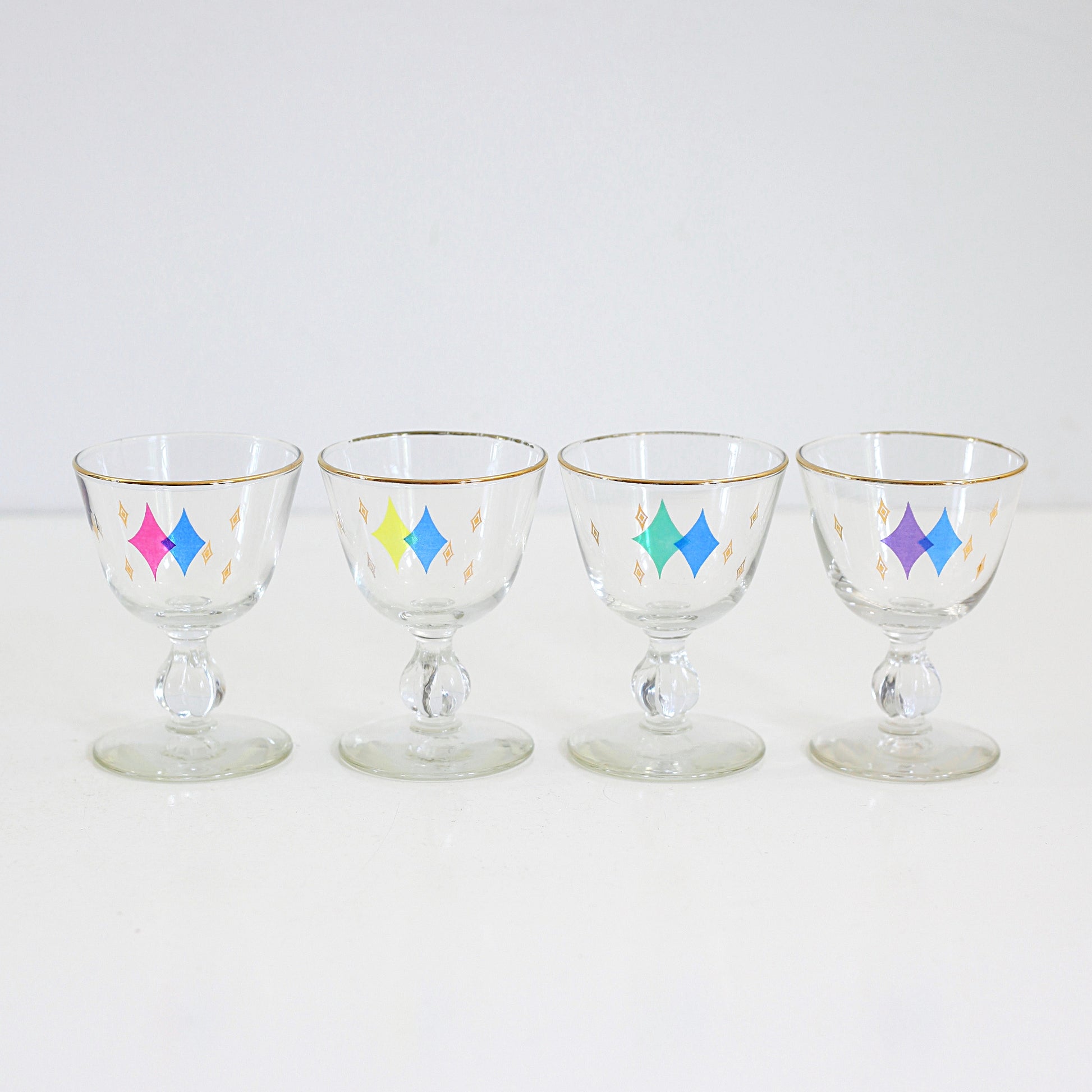 ➝ Entire set is in fantastic vintage condition, with no chips, cracks, or repairs. Images are overall bright and solid, showing only extremely minor wear on a few of the gold metallic starbursts. One of the glasses has a small scratched spot near the stem (shown in last photo). Overall, a stunning set.