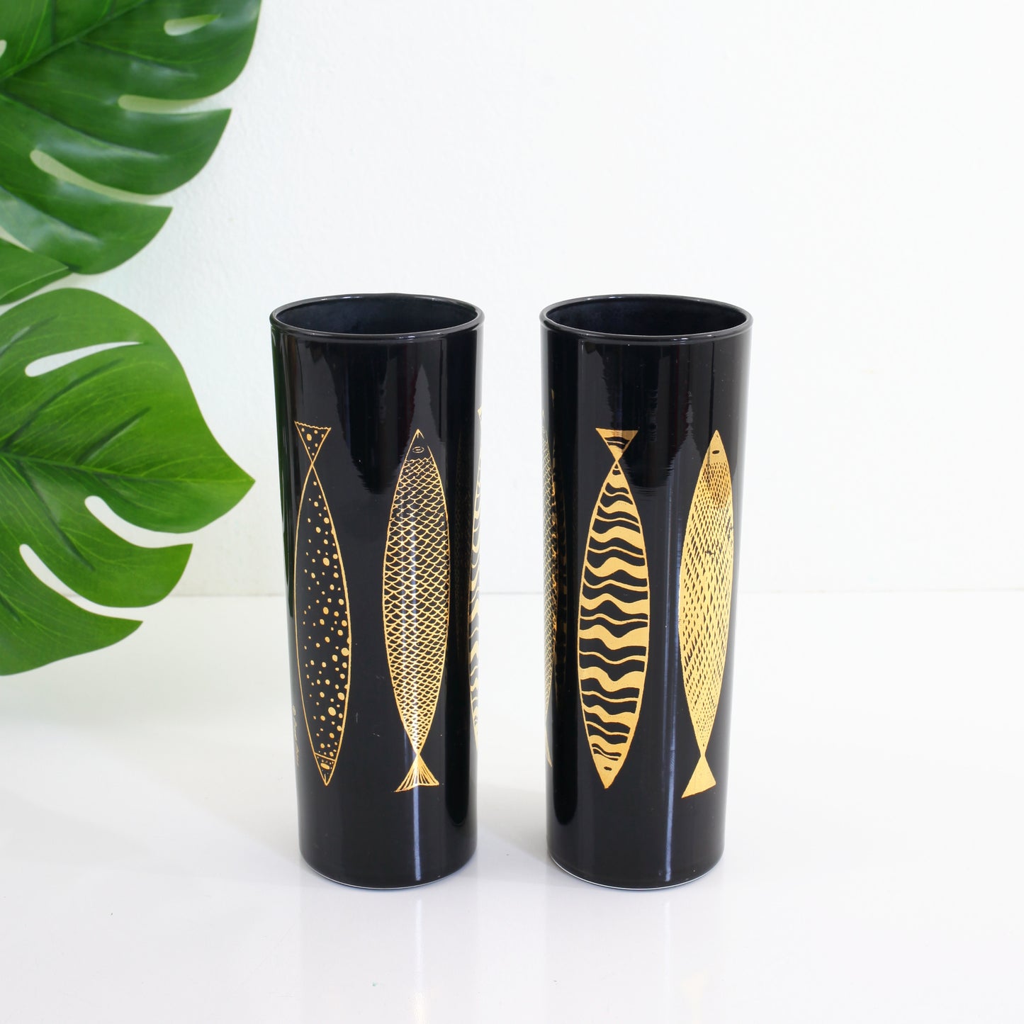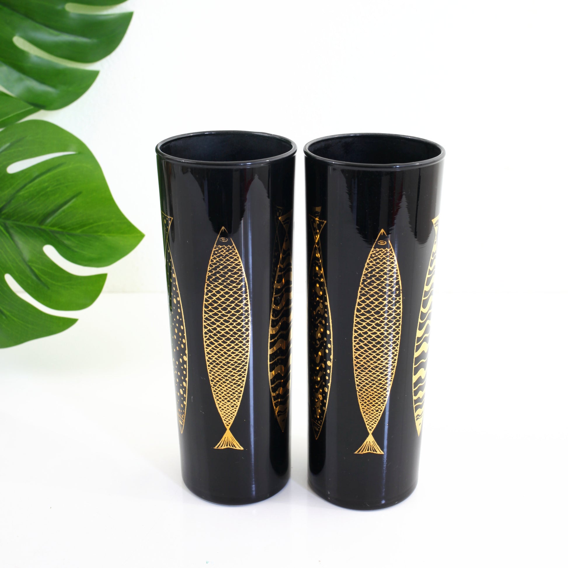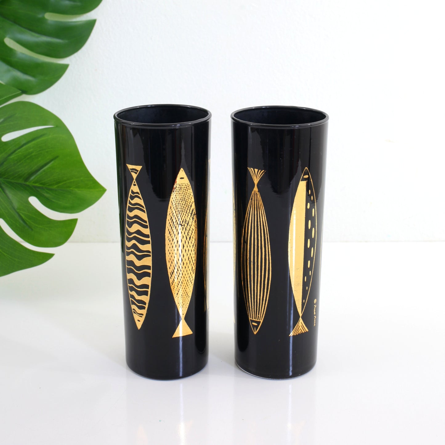 SOLD - Mid Century Modern Black & Gold Fred Press Fish Glasses