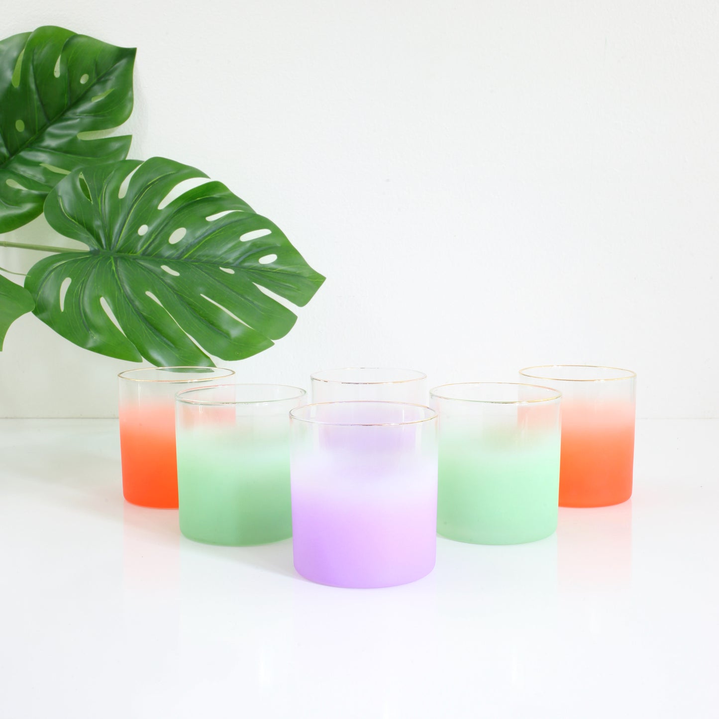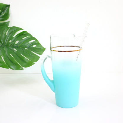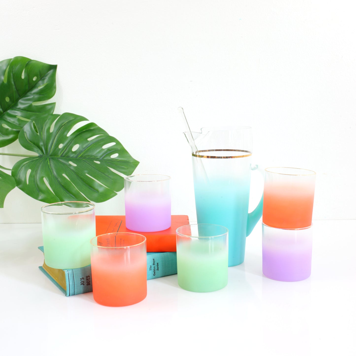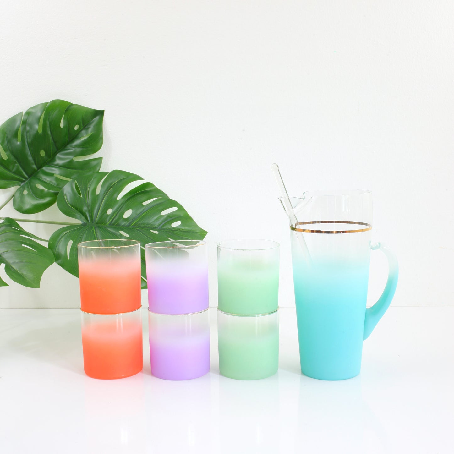 This mid century modern Blendo cocktail set is so darn classy! Set includes six colorful frosted glasses with gold rims, a matching turquoise frosted pitcher with a gold band, and the original glass swizzle stick. Sure to make any cocktail party extra swanky and extra fun!