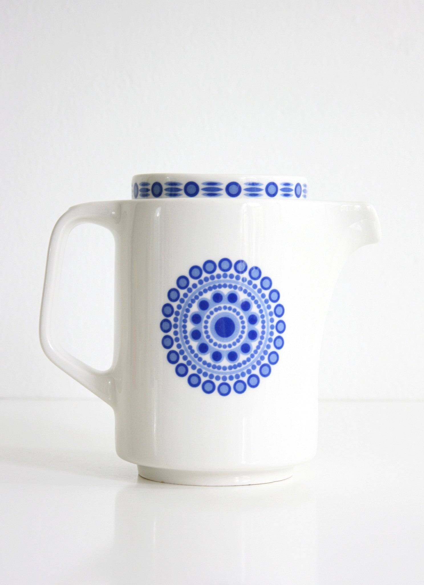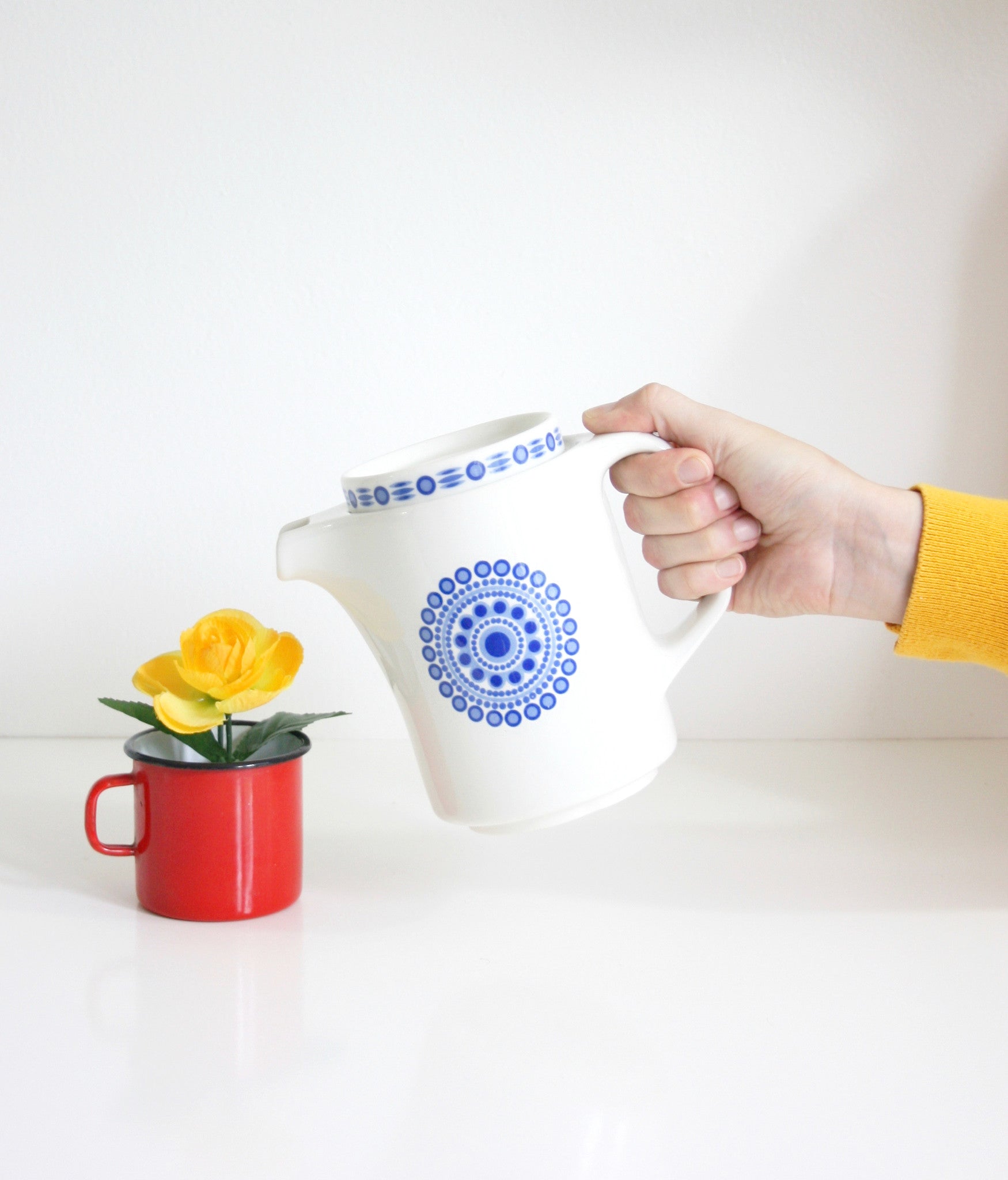 The only thing better than a piping hot cup of your favorite coffee or tea is one poured from a fun vintage pot! This beautiful mid century tea or coffee pot is made of bright white ceramic with a gorgeous cobalt blue geometric dot pattern on each side. Fun and functional, this beautiful retro coffee pot is sure to bring a smile to your face whether you're brewing a fresh pot of something tasty or just admiring this vintage cutie on your shelf.
