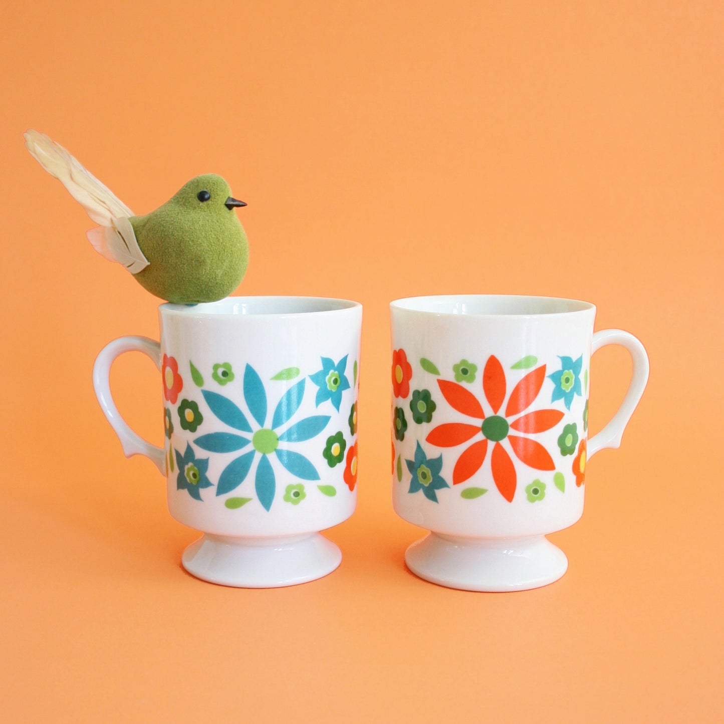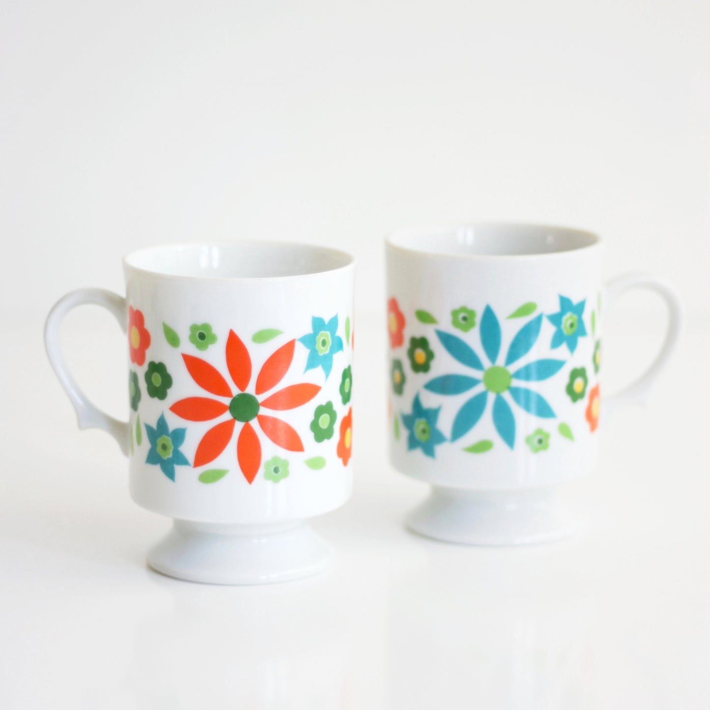This fabulous pair of mid century modern flower mugs is so colorful and fun! Made of bright white ceramic with a bright and beautiful Mid Century Mod floral design all the way around. I just love the way the colors compliment one another! The perfect way to make your morning cup of coffee or tea extra fun!