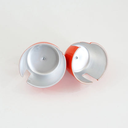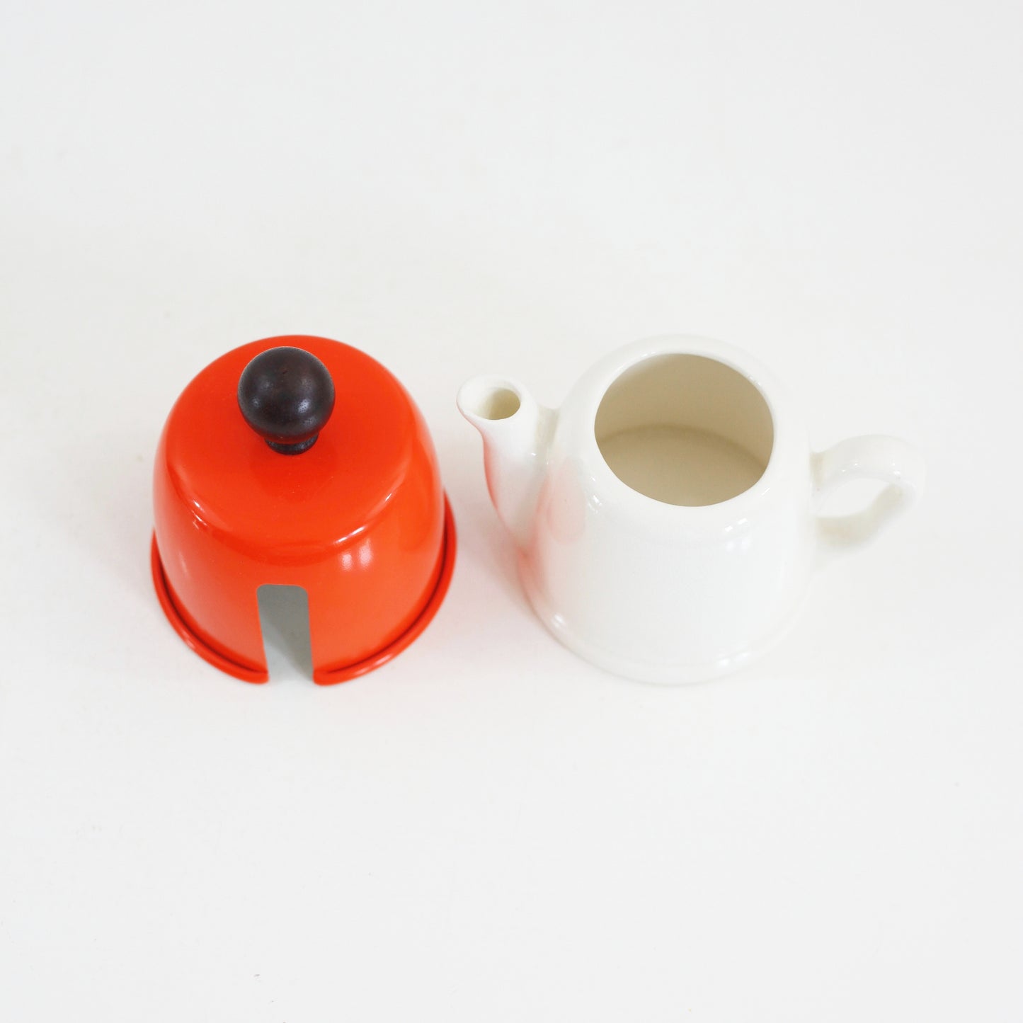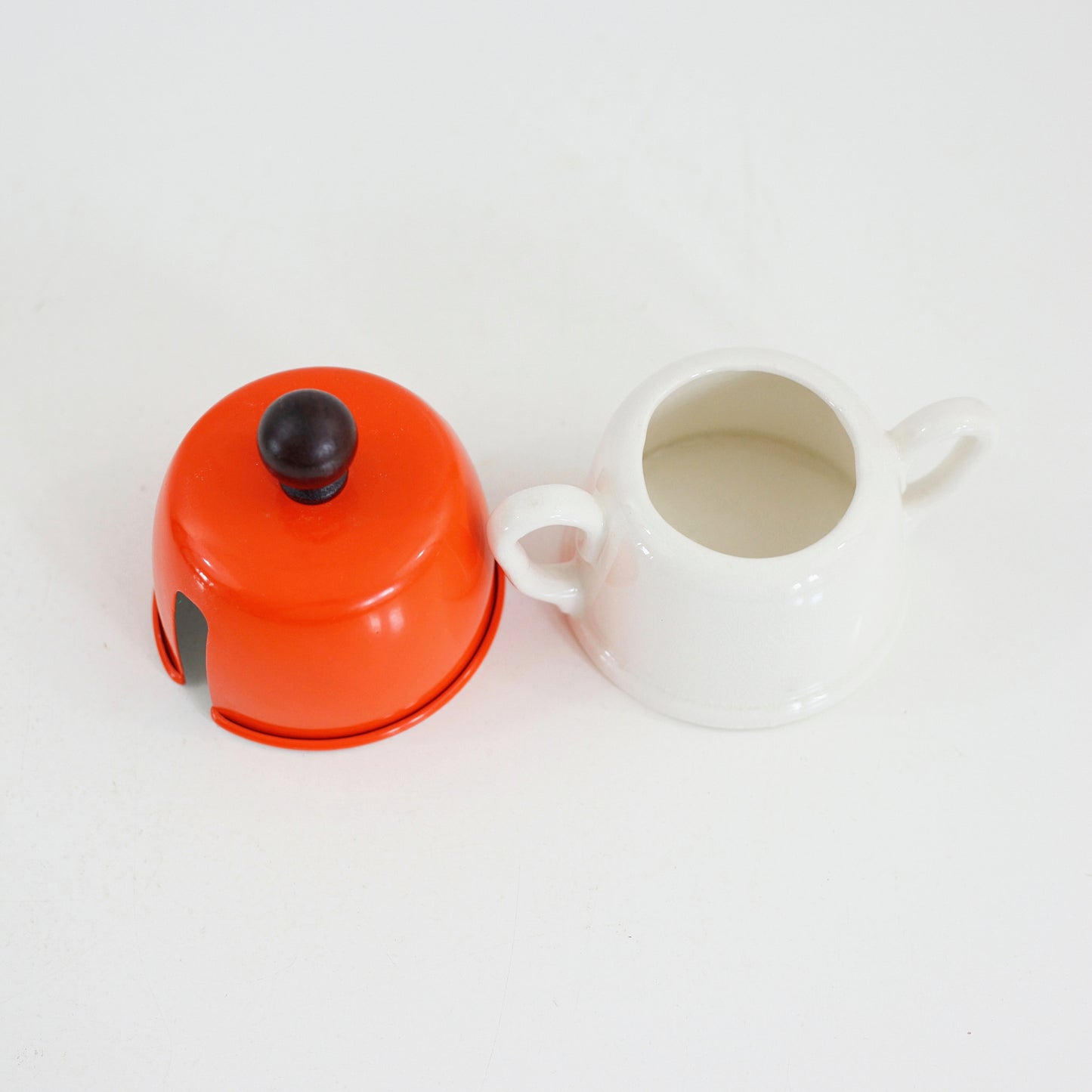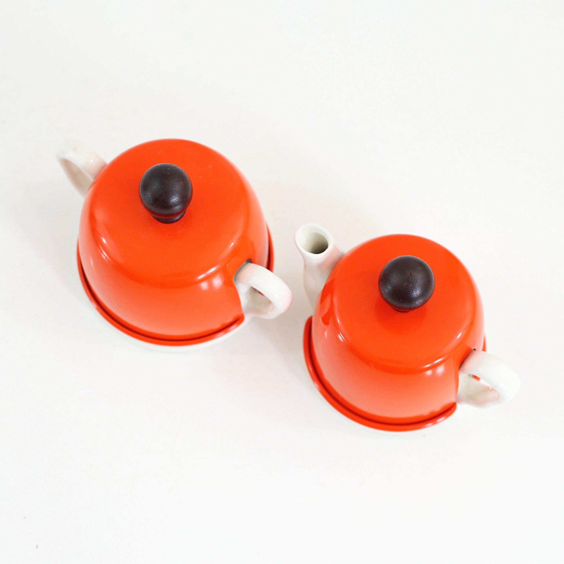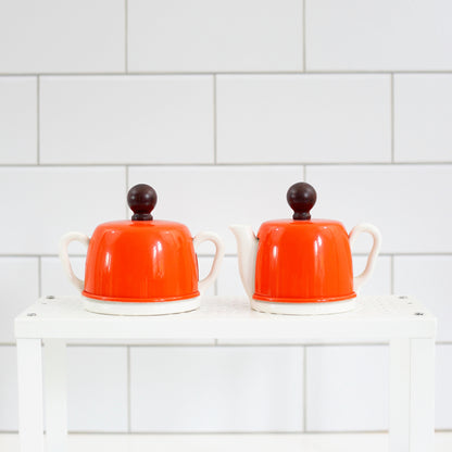 SOLD - Mid Century Modern Cream & Sugar Set with Orange Aluminum Cozies