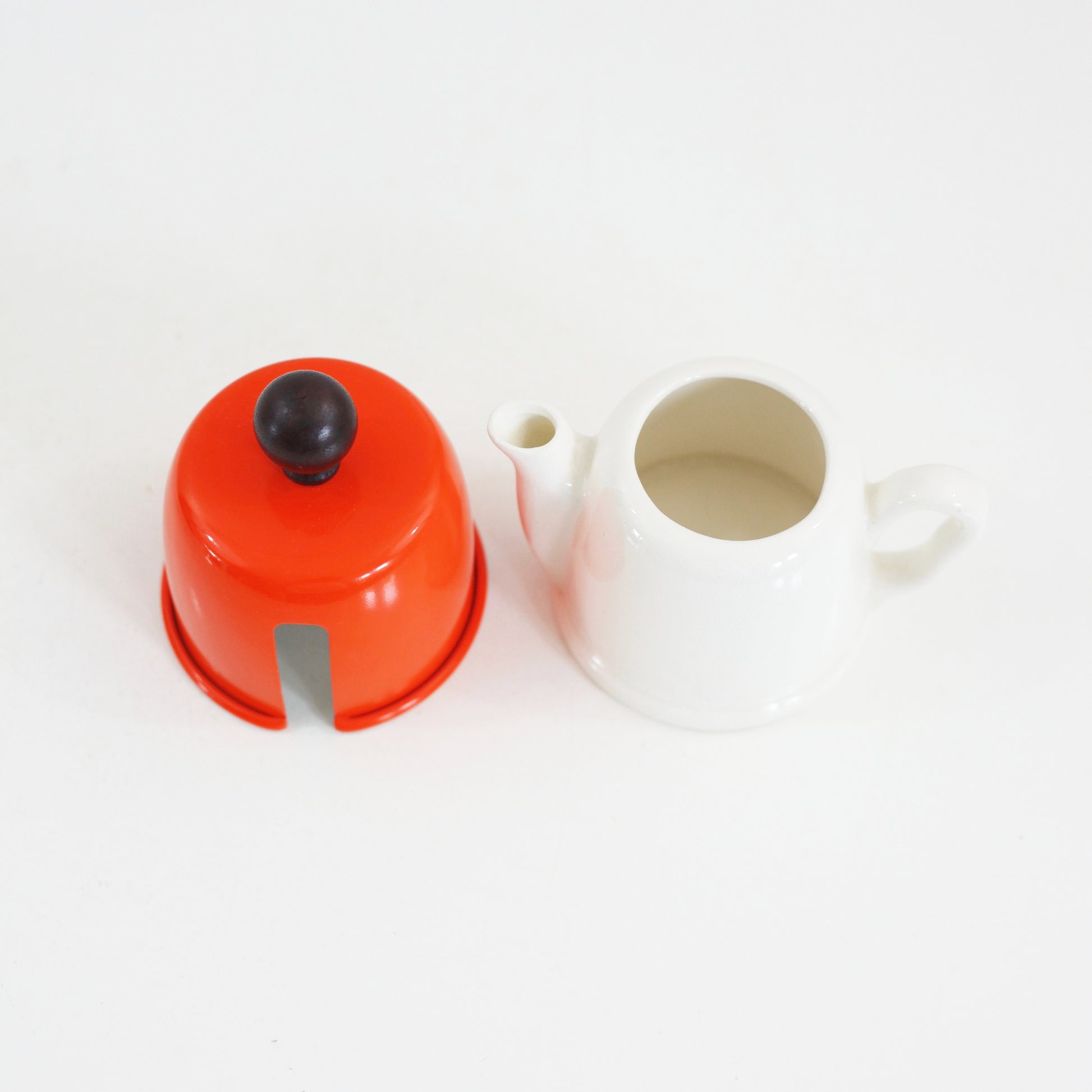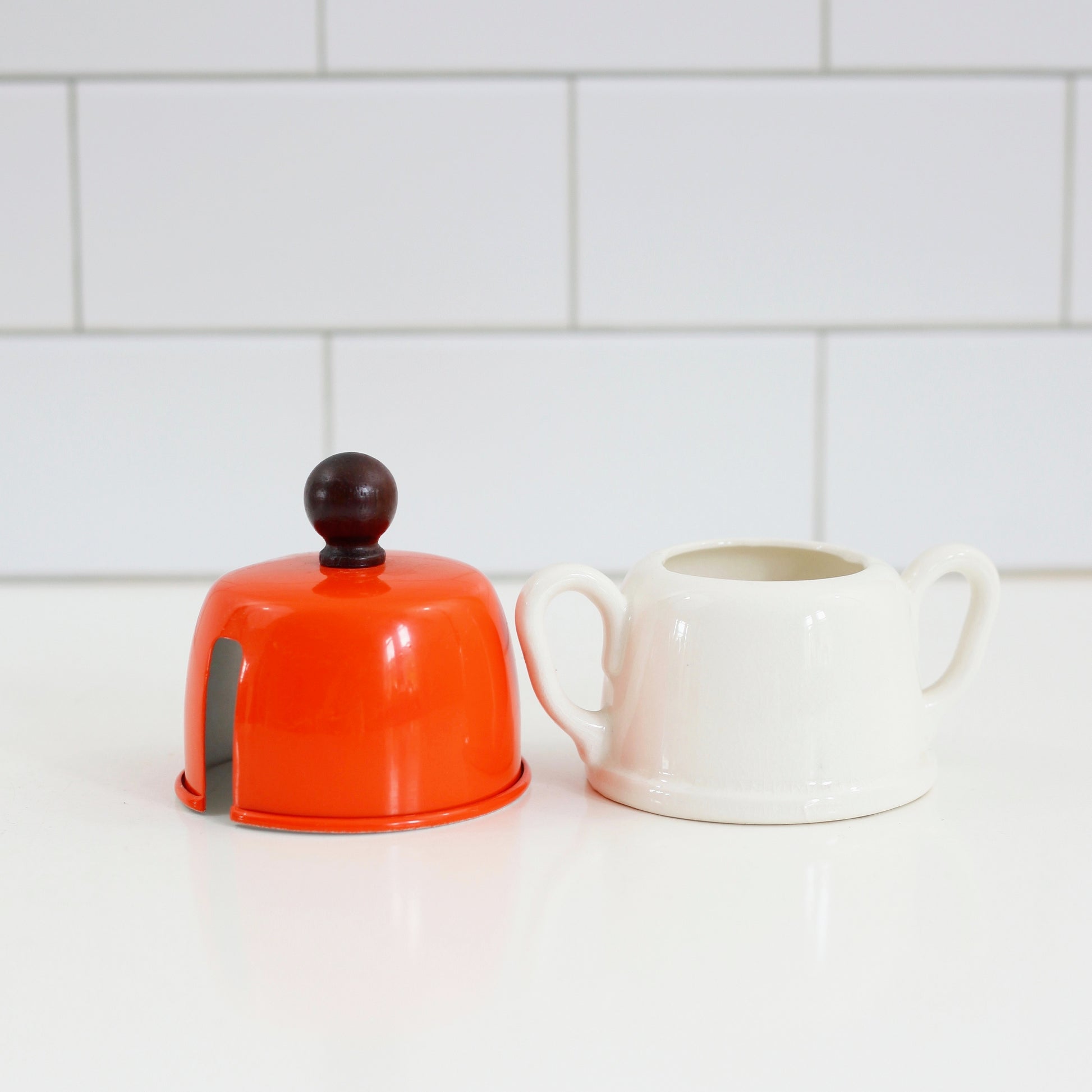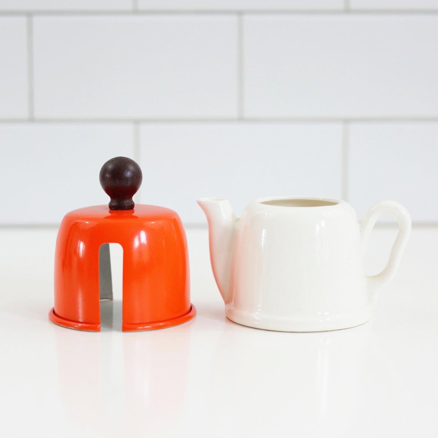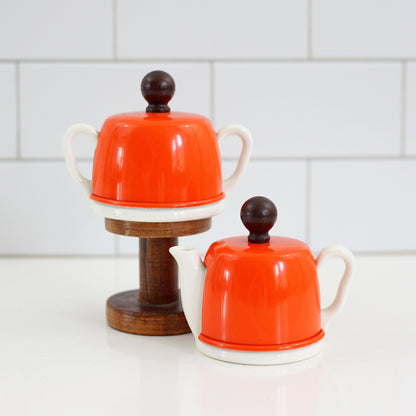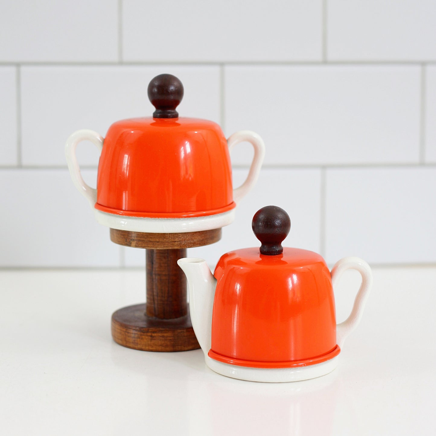 This bright and beautiful mid century cream and sugar set is so cheerful and fun! A hard-to-find set, these vintage beauties are made of creamy white ceramic and each piece has an orange aluminum cozy topped with a wooden knob. Perfect for serving cream and sugar in style, and beautiful enough just to display and admire!
