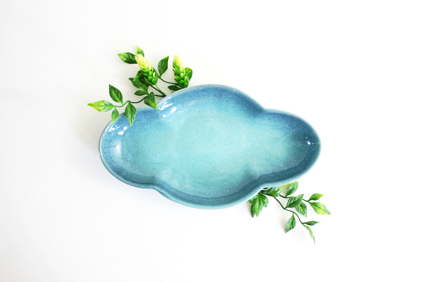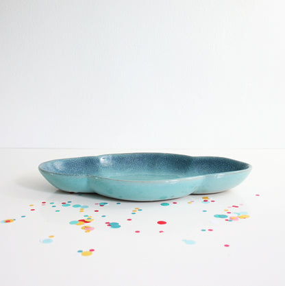 This absolutely gorgeous mid century modern Glidden cloud-shaped pottery dish is so beautiful! Made by the Glidden pottery company of Alfred, New York, which produced beautiful but practical art pottery from 1940 - 1957. This serving dish has a great cloud-like shape and a beautiful speckled aqua blue glaze. Sturdy and solid, this piece would be great for serving, but is definitely beautiful enough just to display and admire!