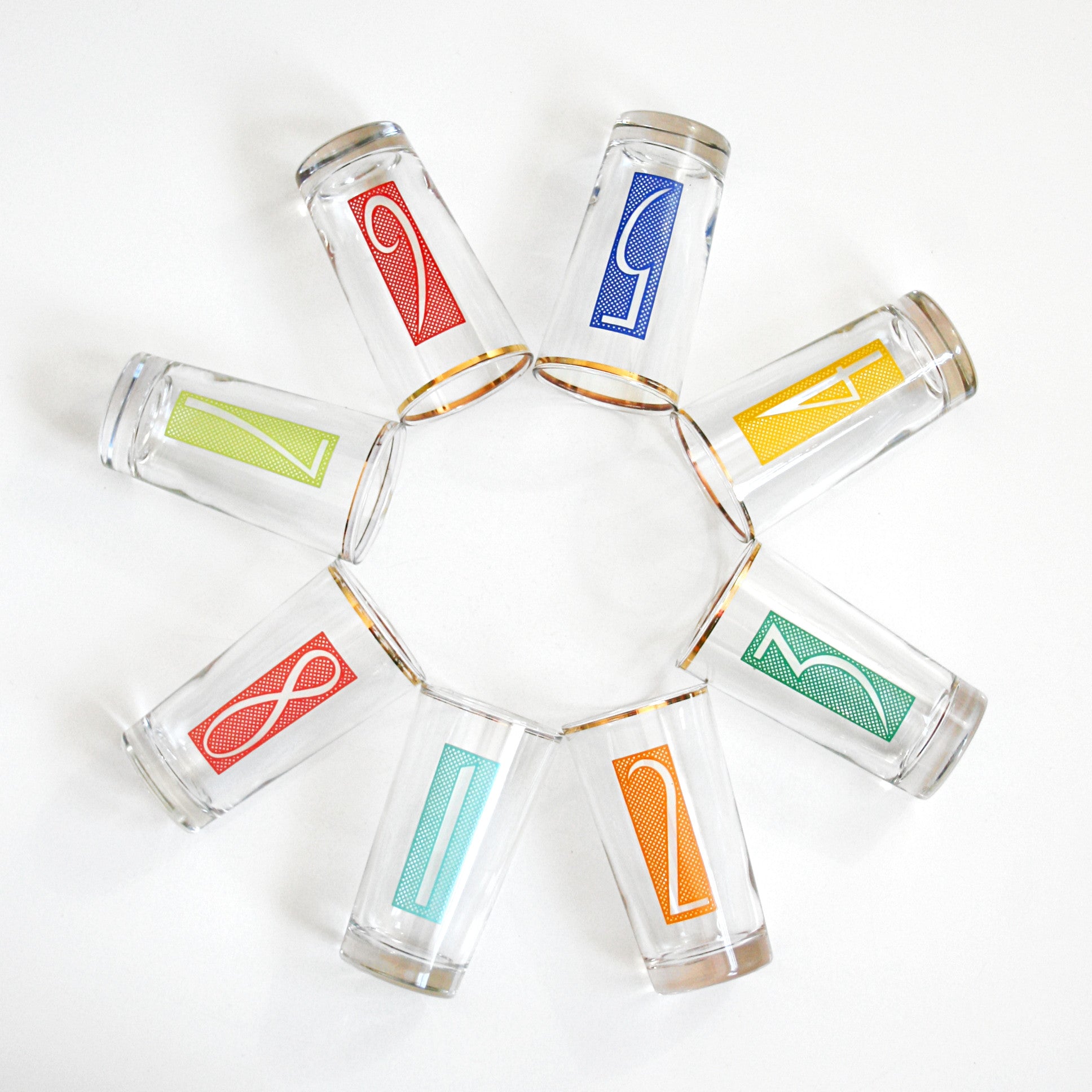 Oh, vintage glassware, how I love thee - let me count the ways... These colorful mid century modern numbered tumblers will give you eight great reasons to love mid century drinking glasses! Each glass has a brightly colored number from 1-8 in a great retro font and a rainbow of retro colors! Glasses are finished with oh-so-classy gold rims and marked with the Libbey capital 'L' logo on the bottom. Perfect for parties or for every day use, this set is one you can certainly 'count on'!