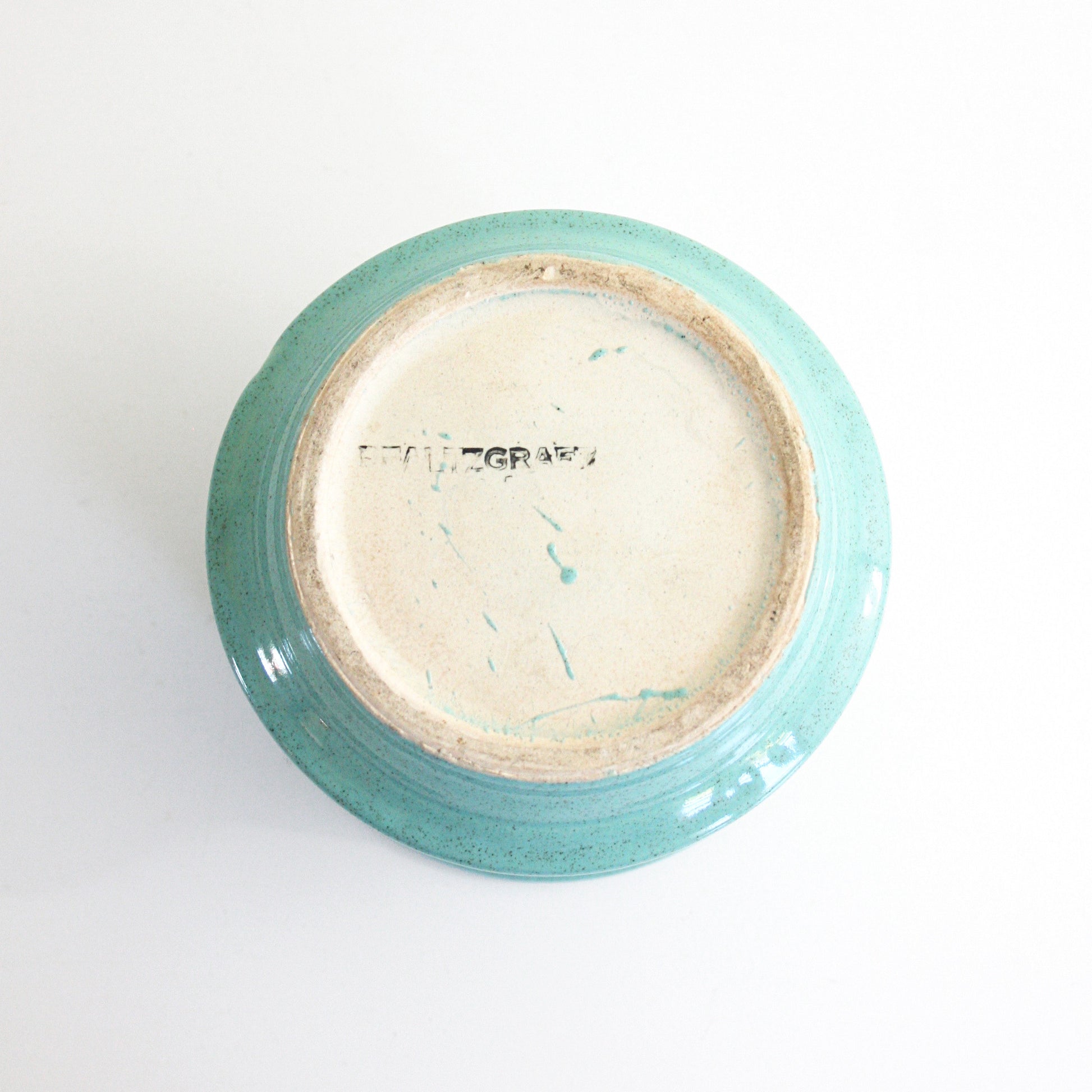 This gorgeous mid century modern Pfaltzgraff ceramic planter is just gorgeous! In a beautiful shade of aqua green with little speckles ,this sturdy ceramic flower pot is part of Pflatzgraff's popular Ringware line of pottery. With an attached underplate and a drainage hole, this flower pot is as useful as it is beautiful. Perfect for holding your favorite plant or flower, as a cache pot, or even holding pens and pencils on your desk!