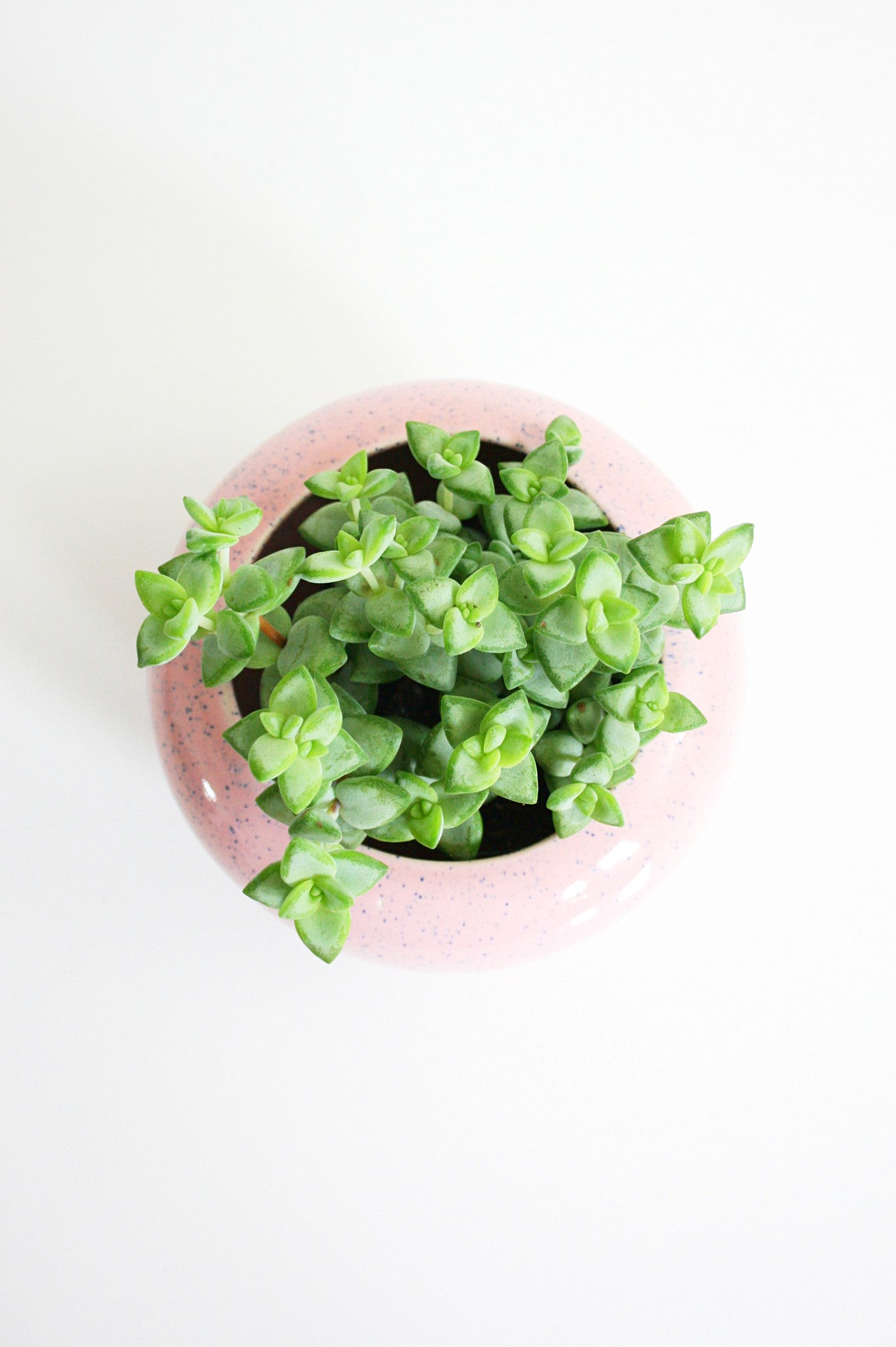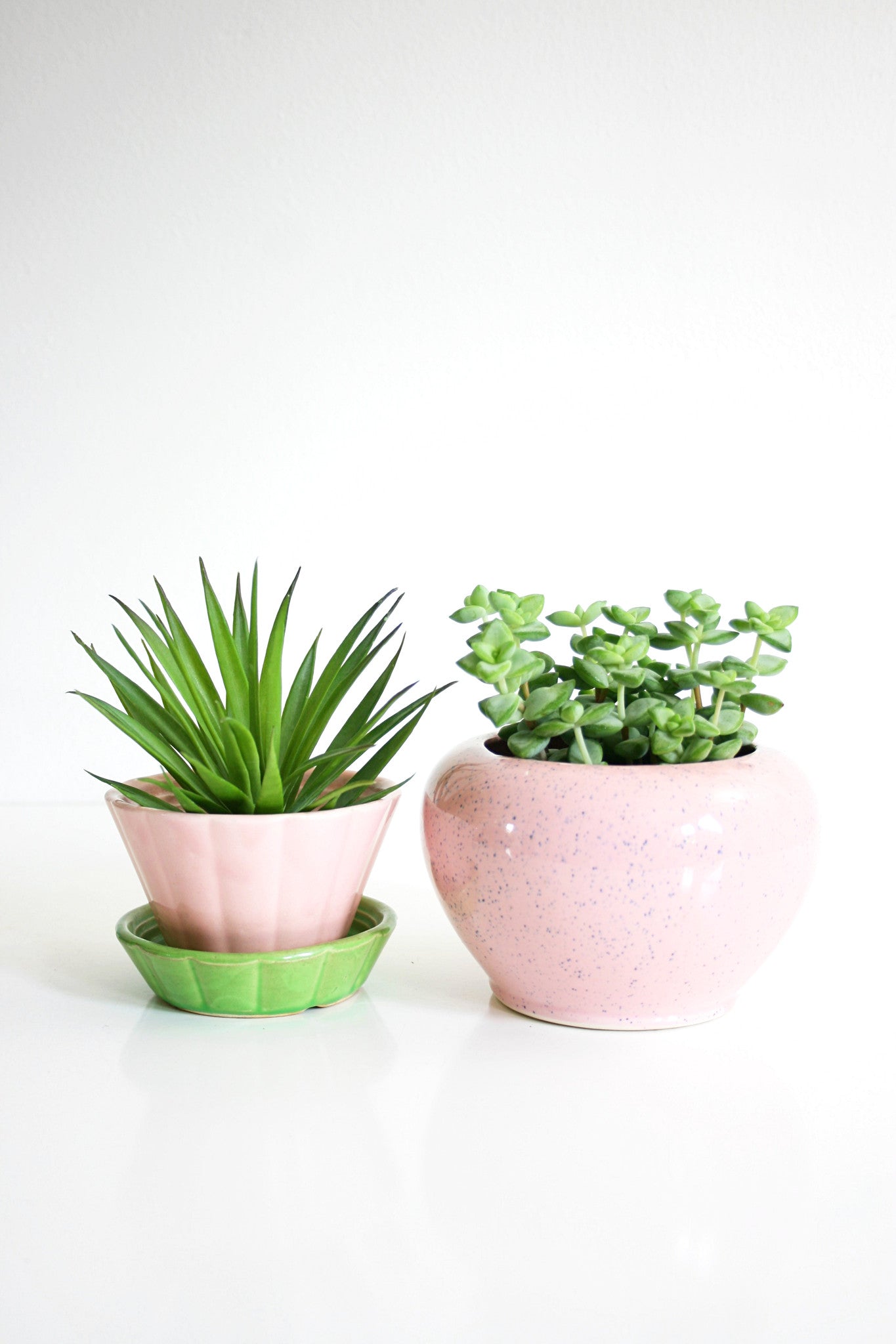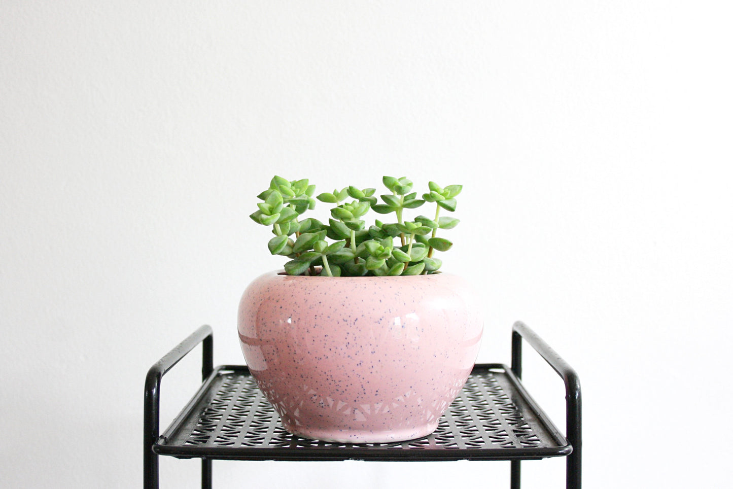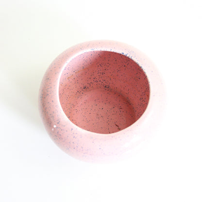 This fabulous mid century modern planter is full of vintage charm! Made of ceramic with a fun retro bulb shape, this planter is finished with bright pink glaze speckled with tiny dots of cobalt blue. Perfect for making your favorite plant feel extra special, but also great for stashing pens and pencils, odds and ends, or whatever else you can dream up!