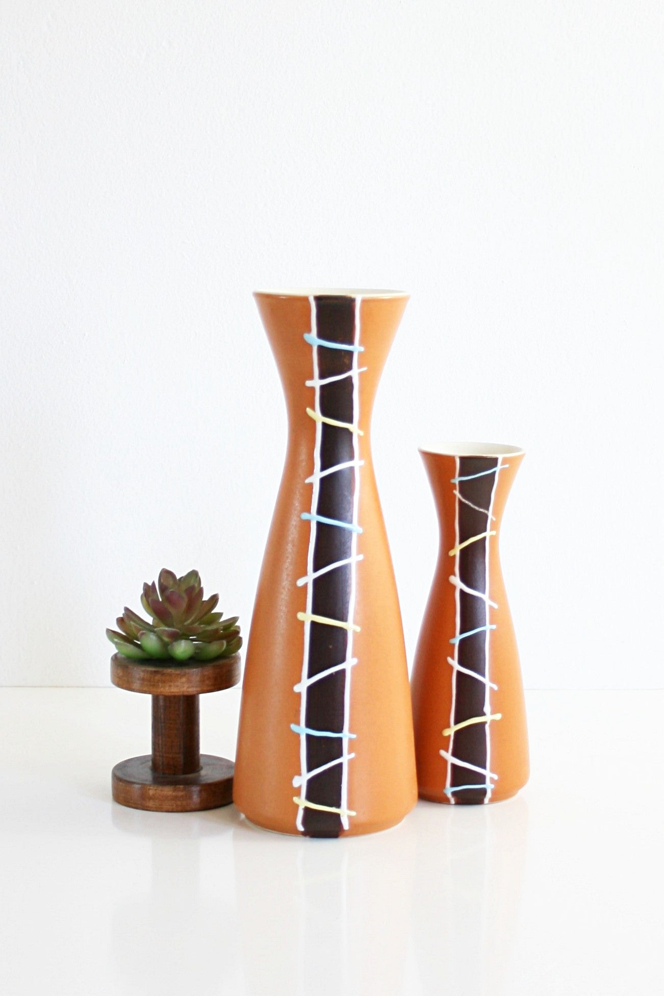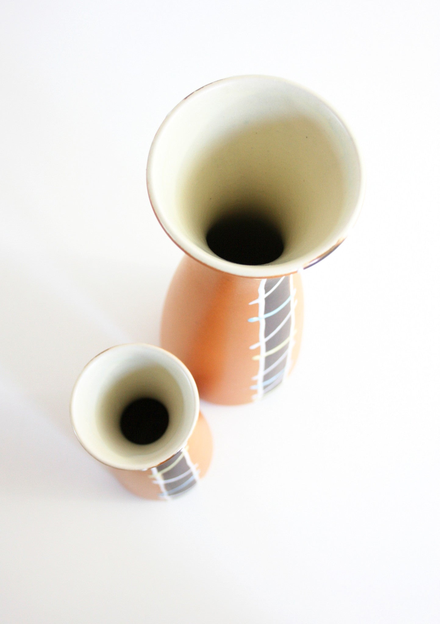 This sleek and stylish pair of mid century West German Dümler & Breiden vases is just the epitome of vintage style! From the curvy mid century diabolo shape, to the gorgeous textured geometric stripes atop a rich rust-orange and chocolate brown glaze, these vases are mid century marvelous in every way. The sky blue and soft yellow stripes are so striking against the darker backgrounds - these beauties are sure to be the stars of your mid century ceramics collection.