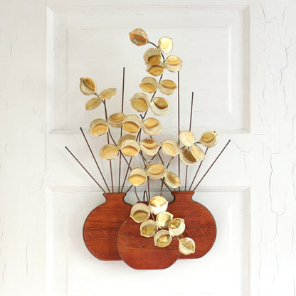 This gorgeous mid century modern wood and brass plant wall hanging is full of boho charm! Three wooden pots or vases with a great geometric triangle pattern carved into them each hold a few sprigs of gorgeous golden brass leaves. Leaves have a beautiful patina and variation in color, giving them an almost iridescent glow from certain angles. A unique and beautiful piece, this beautiful sculpture is perfect for any plant-lover - even those without a green thumb!
