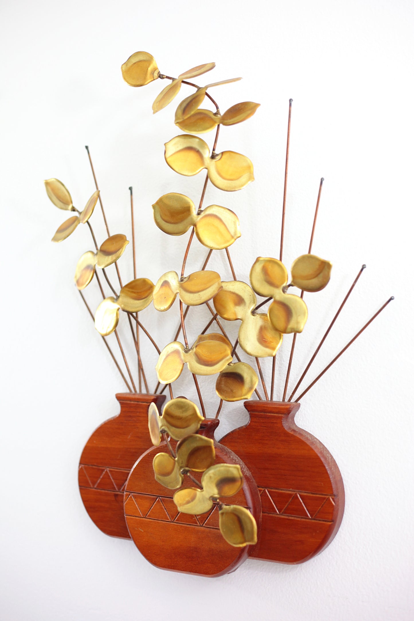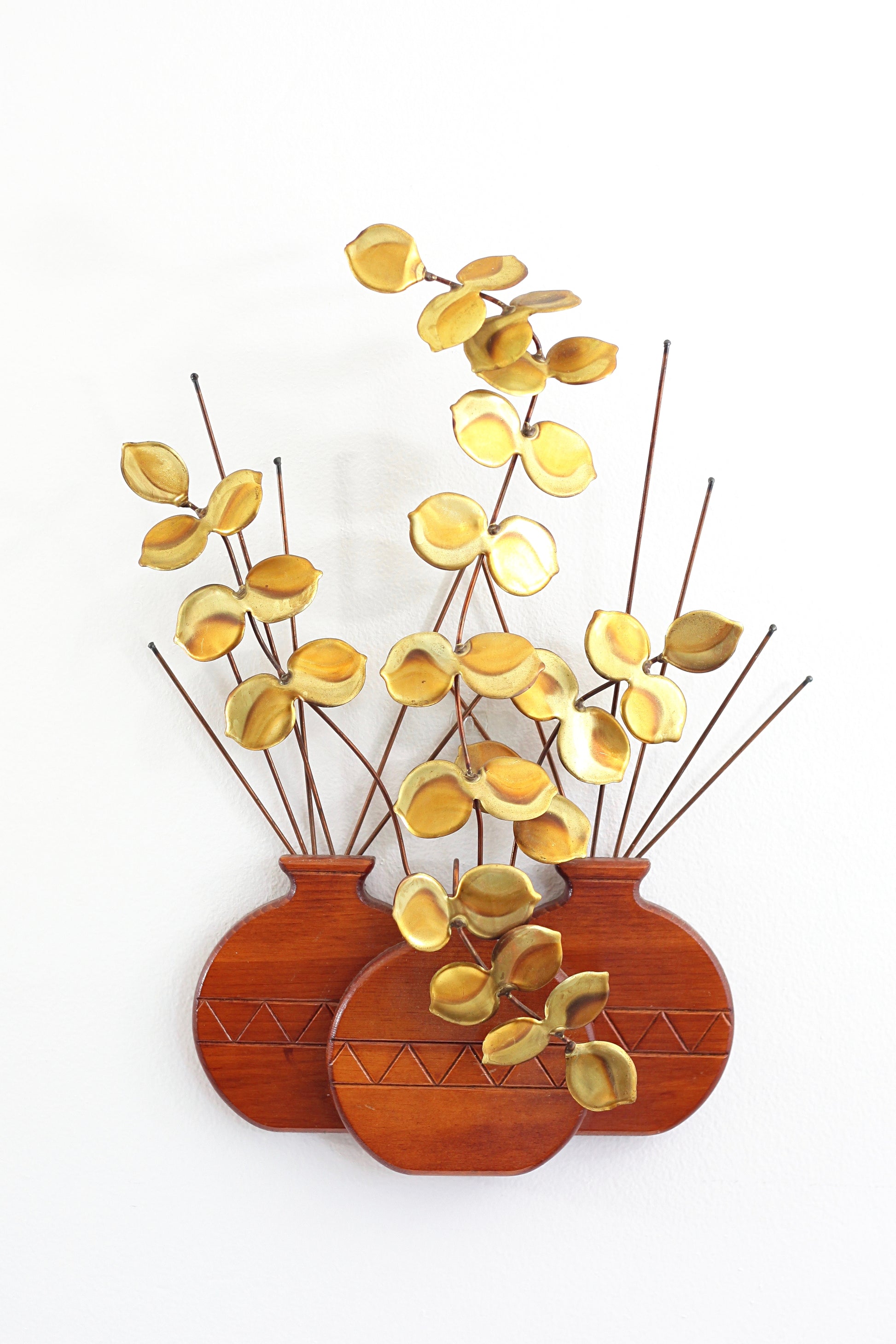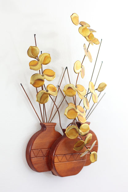 This gorgeous mid century modern wood and brass plant wall hanging is full of boho charm! Three wooden pots or vases with a great geometric triangle pattern carved into them each hold a few sprigs of gorgeous golden brass leaves. Leaves have a beautiful patina and variation in color, giving them an almost iridescent glow from certain angles. Two sturdy crossed 'branches' on the back made it easy to hang up on your wall. A unique and beautiful piece, this beautiful sculpture is perfect for any plant-lover - even those without a green thumb!