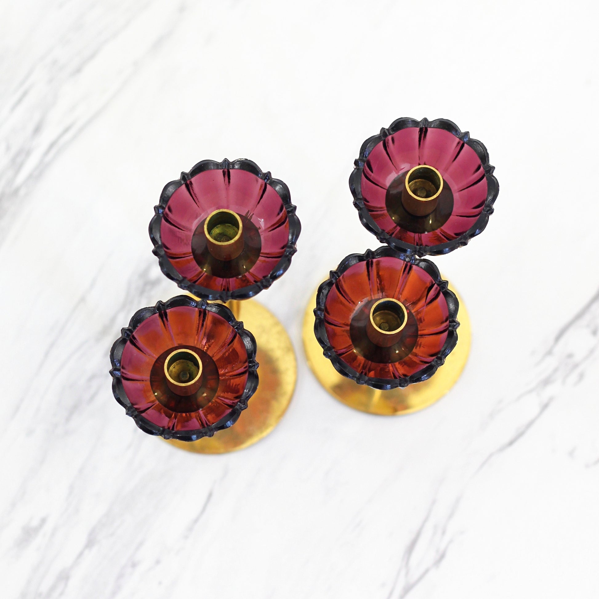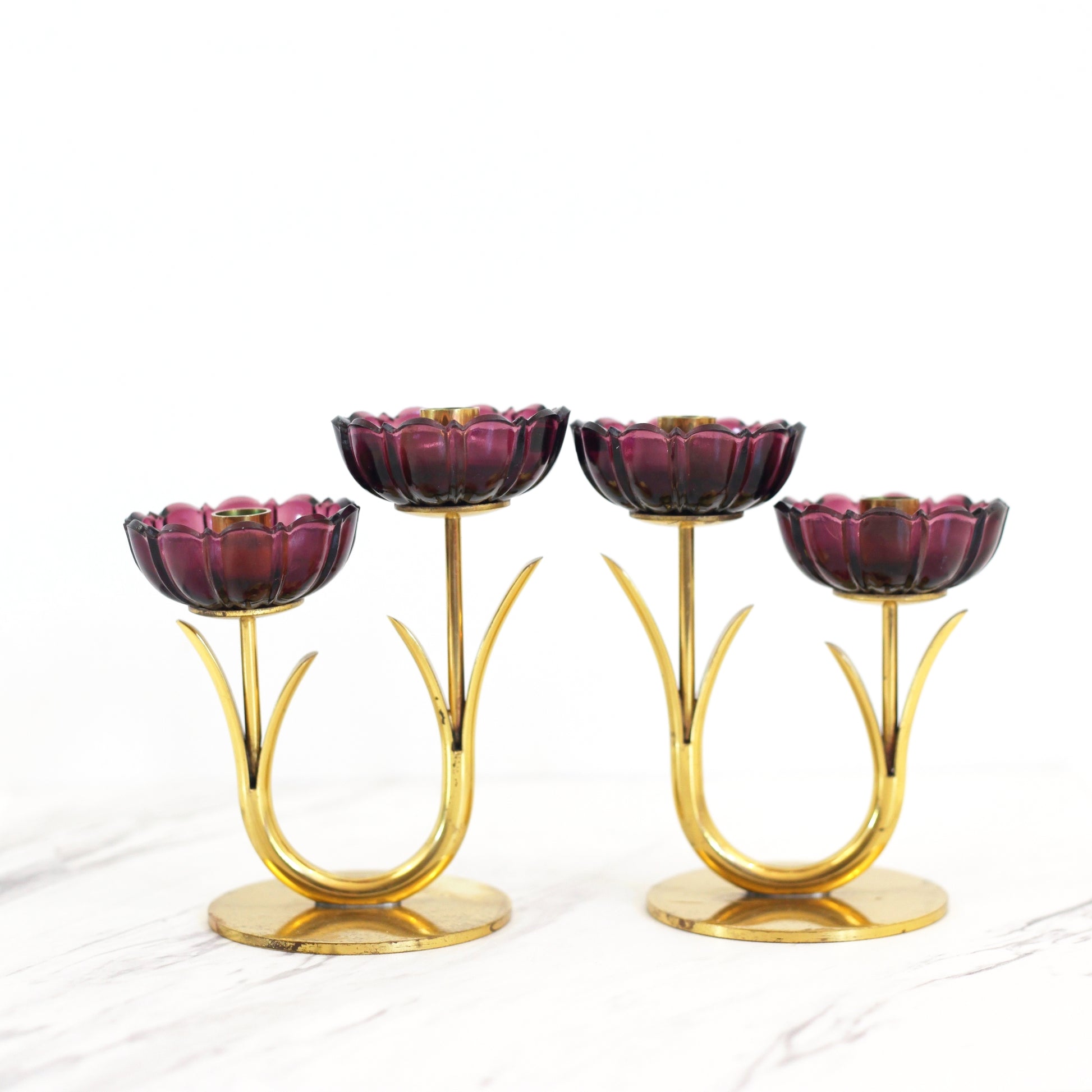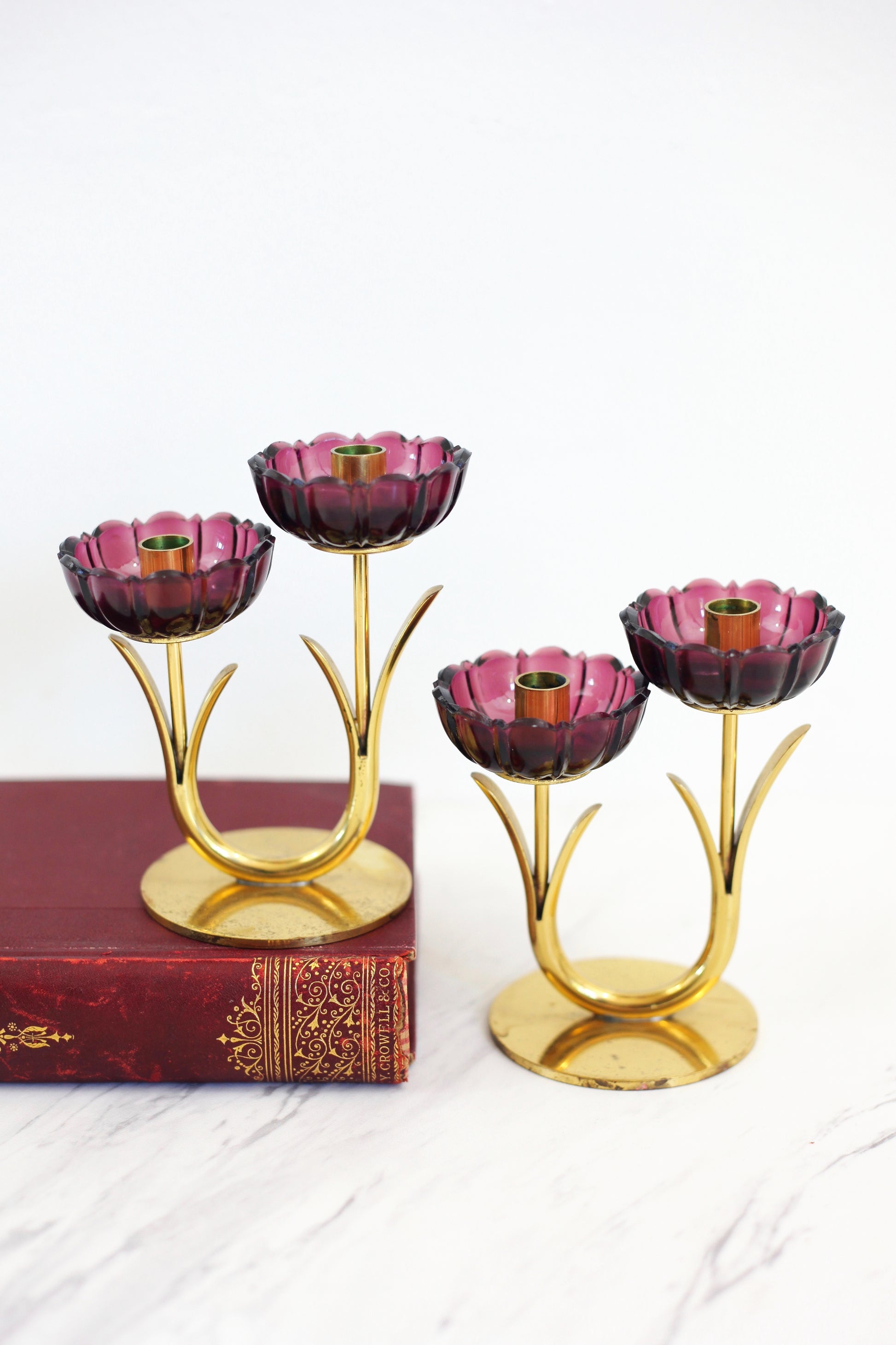 This gorgeous pair of mid century modern candle holders is so unique and beautiful! Designed by Gunnar Ander for Ystad Metall of Sweden, these beautiful brass flower candlesticks are each topped with a gorgeous scalloped glass blossom in a rich amethyst purple hue. Glass blossoms are removable if you prefer the all-brass look. Each flower blossom holds a tiny taper candle, or any candle about half an inch in diameter. Perfect for adding a bit of mid century modern charm to your tabletop or shelf, these stunning candlesticks are sure to be the perfect addition to your vintage decor.