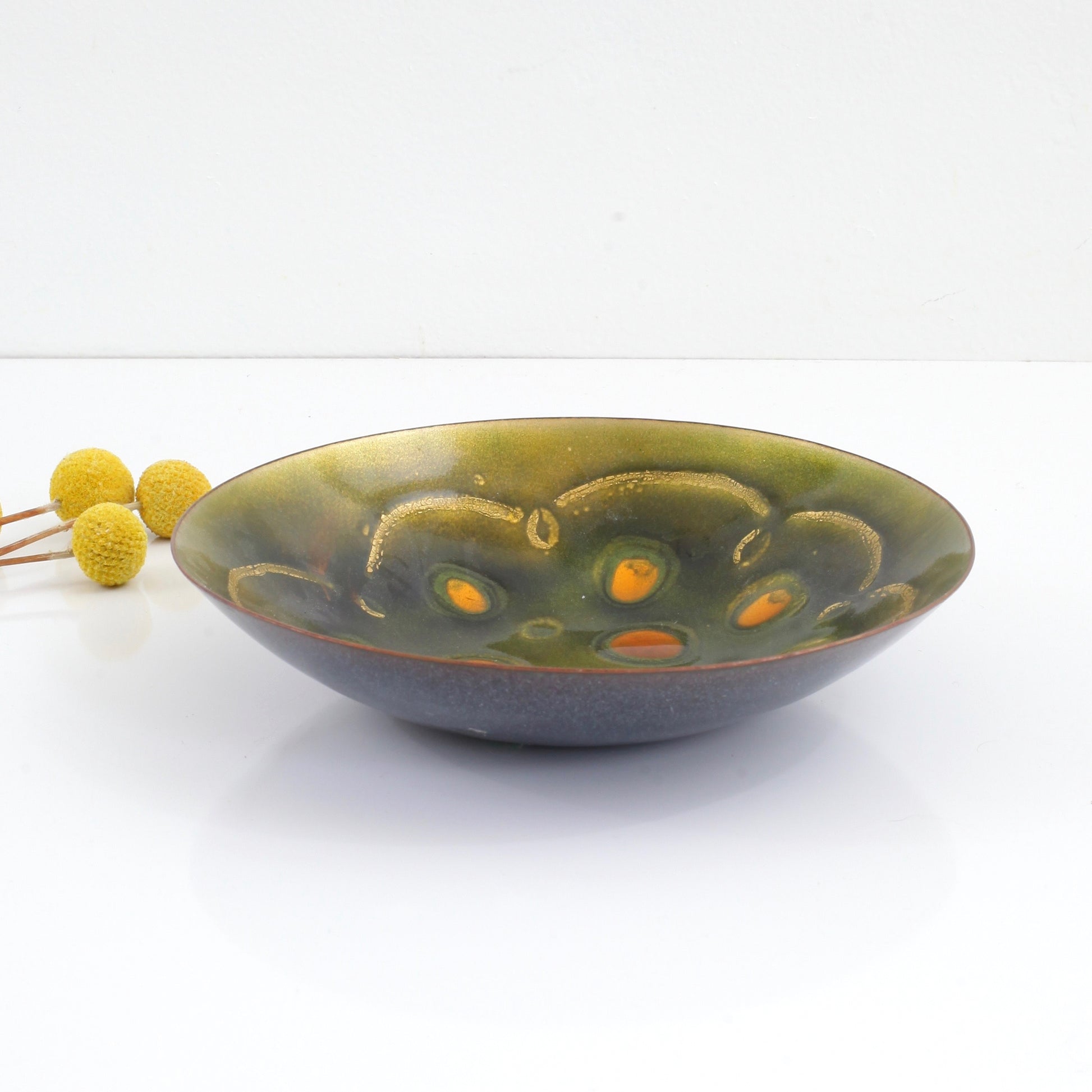 This absolutely gorgeous mid century modern enameled copper bowl is a real stunner. Made of solid copper with a beautiful mossy green enamel finish and golden details, this bowl is a mid century marvel!