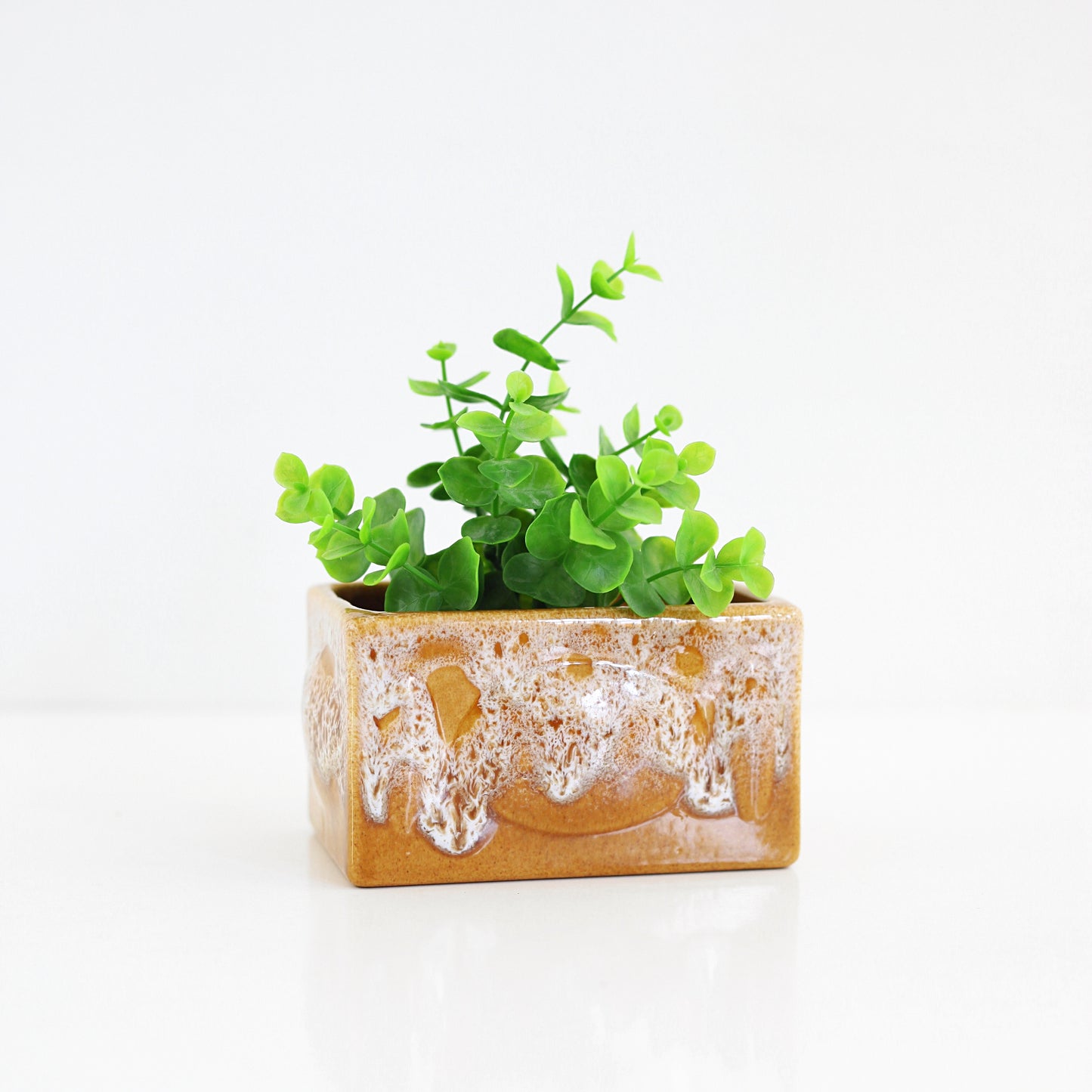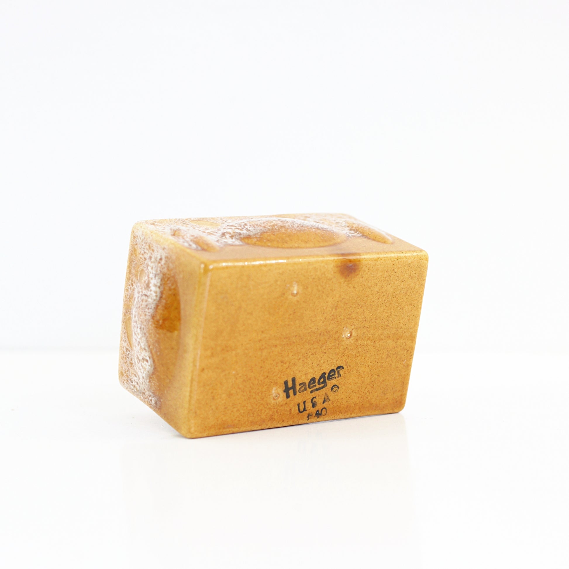 This beautiful mid century modern Haeger planter is real stunner! Made by Haeger in the 1970s, this planter is full of mid century charm. With a rich, mustard yellow glaze, this rectangular planter is finished with a textured off-white drip glaze. Perfect for holding your favorite house plant, and works just as well for holding pens and pencils or odds and ends!