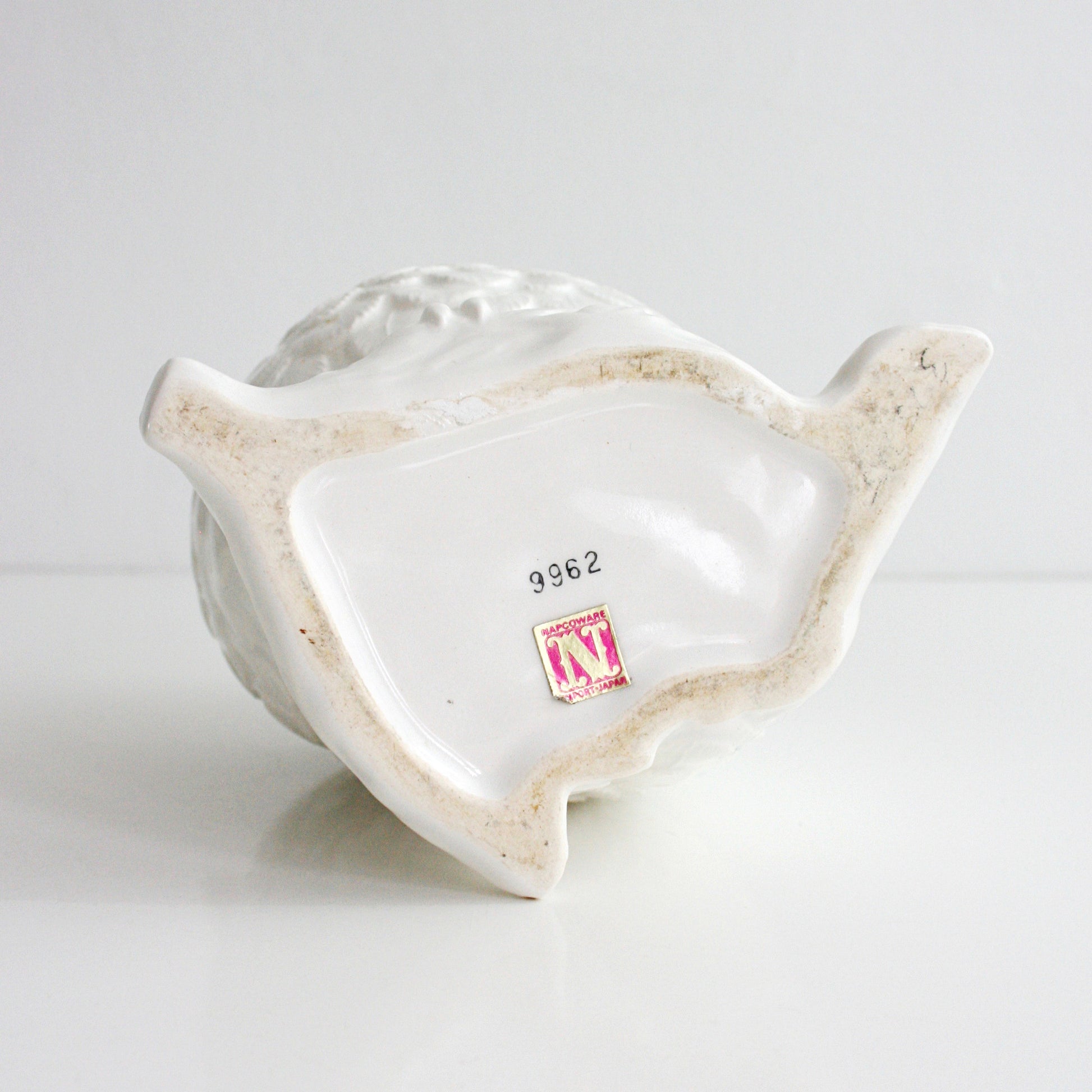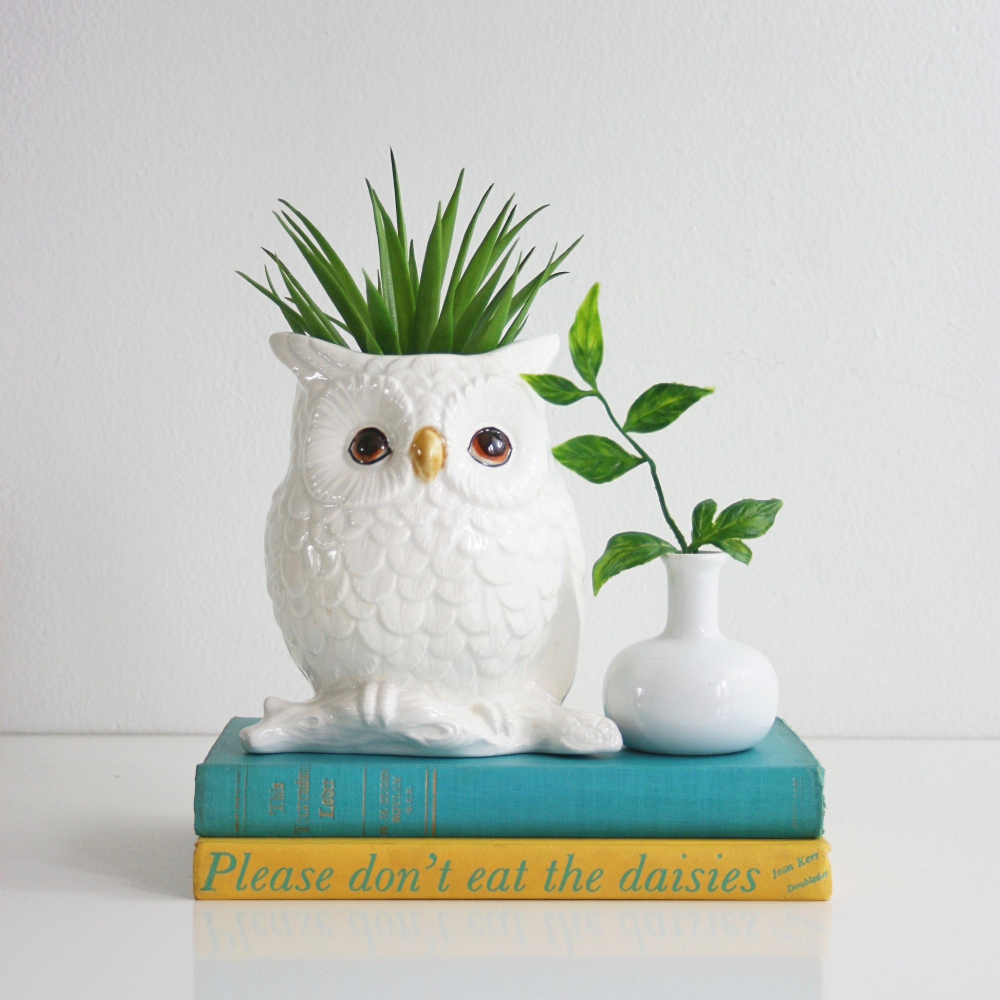 This handsome vintage ceramic owl planter is a real hoot! Finished in a bright white high gloss glaze, this Napcoware owl has gorgeous texture (just look at those feathers) and hand-painted details on his eyes and beak. This feathered friend is ready to add a bit of retro woodland charm to your decor - perfect for holding your favorite plant or even a bunch of kitchen utensils!