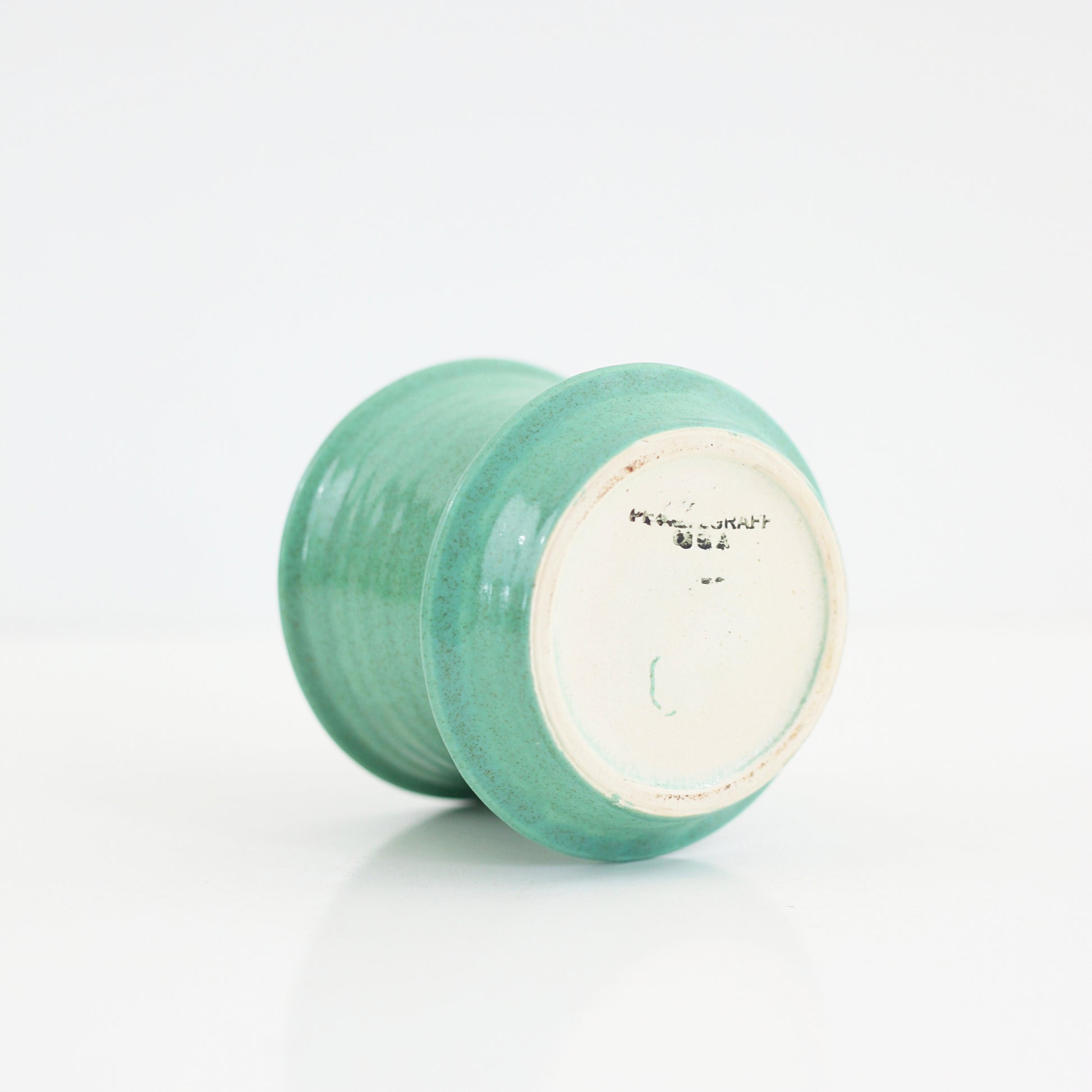 This mid century modern Pfaltzgraff ceramic planter is just gorgeous! In a beautiful shade of aqua green with little speckles, this sturdy ceramic flower pot is part of Pflatzgraff's popular Ringware line of pottery. With an attached saucer and a drainage hole, this flower pot is as useful as it is beautiful. Perfect for holding your favorite plant or flower, as a cache pot, or even holding pens and pencils on your desk!