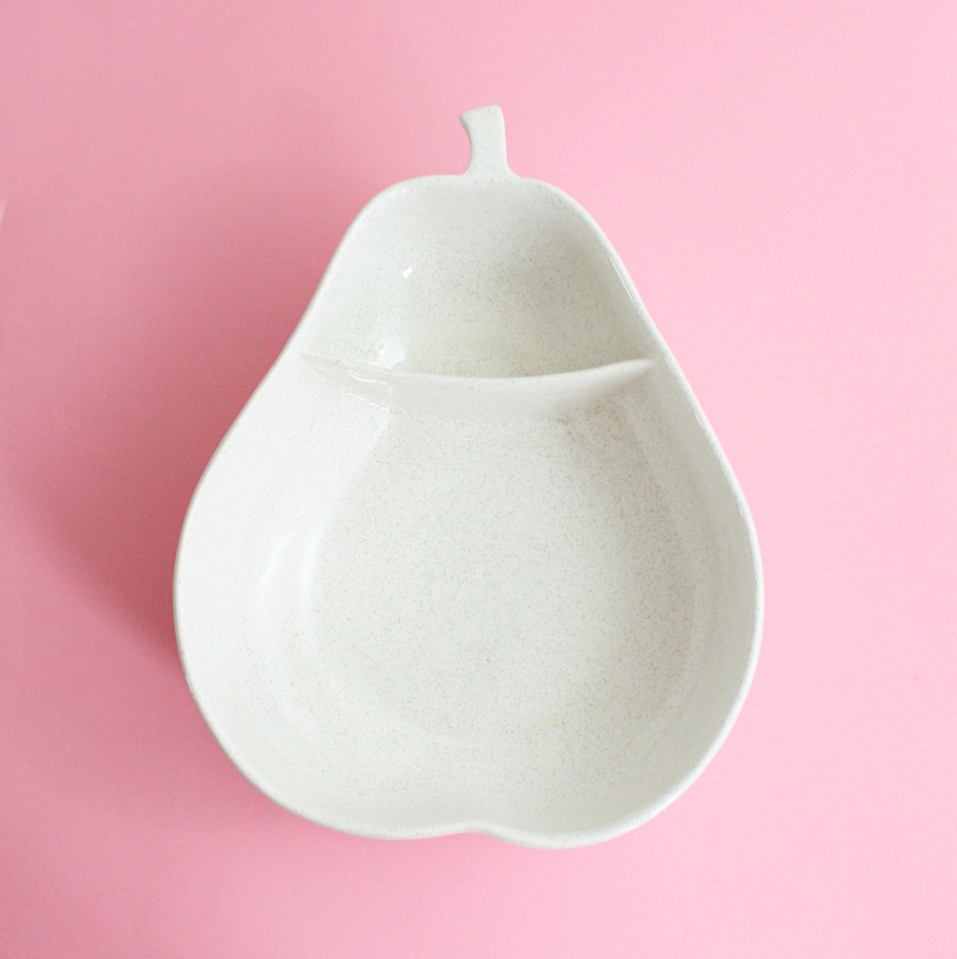 This absolutely gorgeous vintage 1950s Pfaltzgraff ceramic divided pear bowl is simply stunning! Made of sturdy ceramic with an off-white glaze and little tan-colored speckles. Perfect for serving chips and dip or veggies, holding fruit on your counter, or just displaying and admiring!