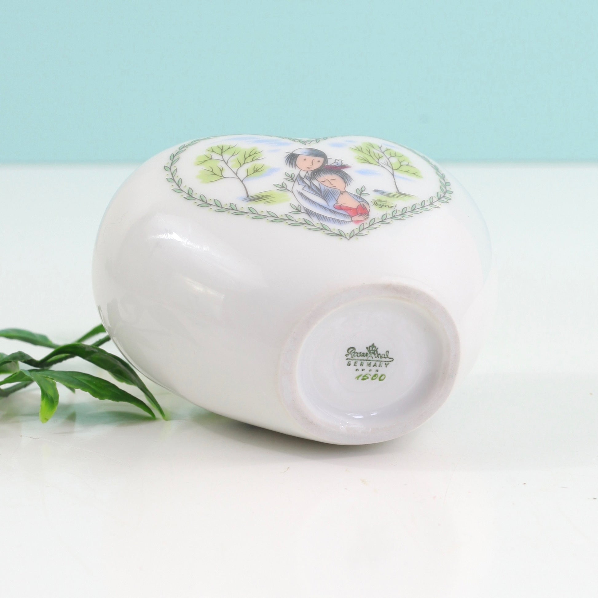 This sweet mid century Rosenthal vase is a real stunner! Made in Germany in the 1960s, this heart-shaped vase is decorated with Raymond Peynet's whimsical illustrations -- with his famous Lovers motif on the front and a sweet Cupid on the back. This vase is perfect for holding a few flowers, and lovely enough just to display and admire!