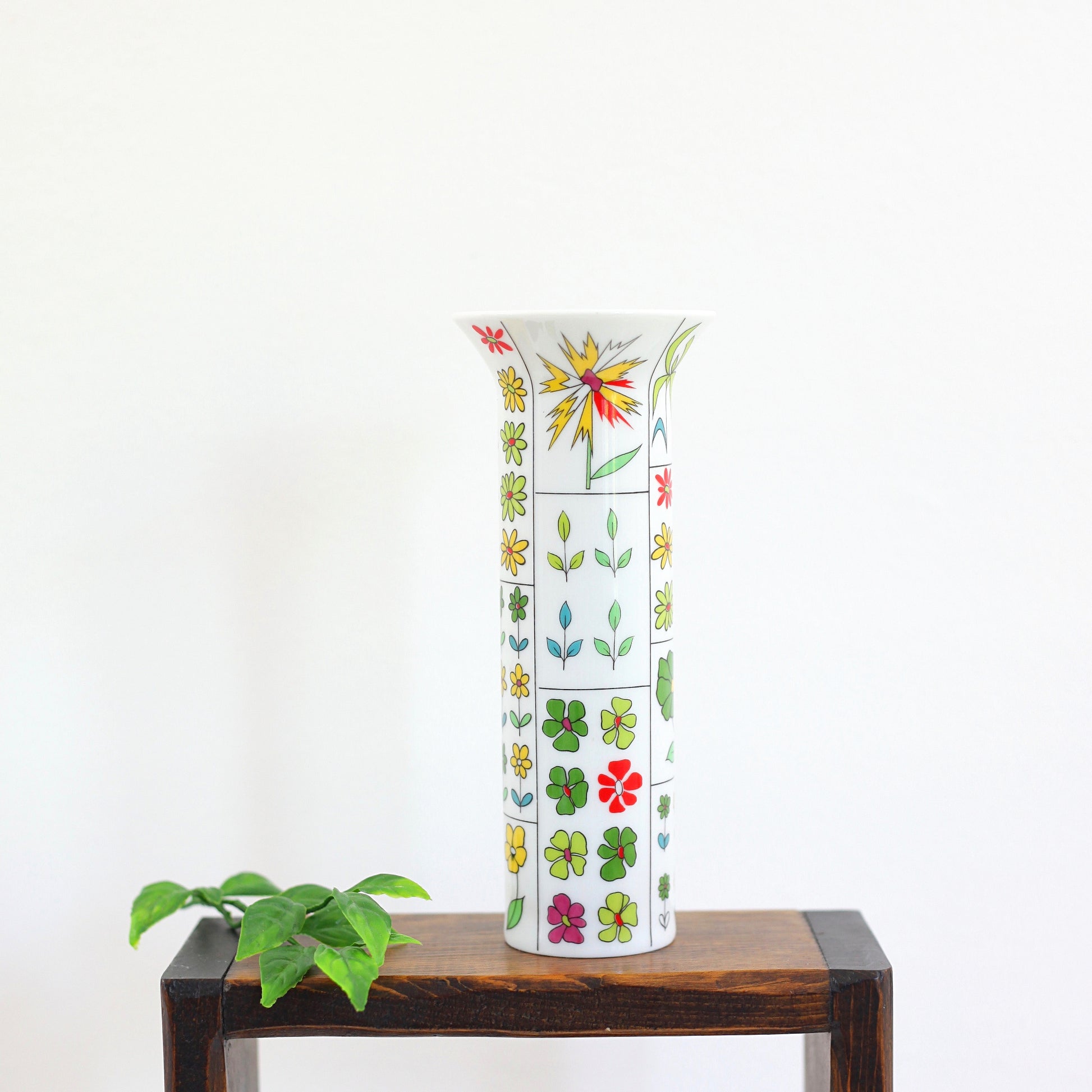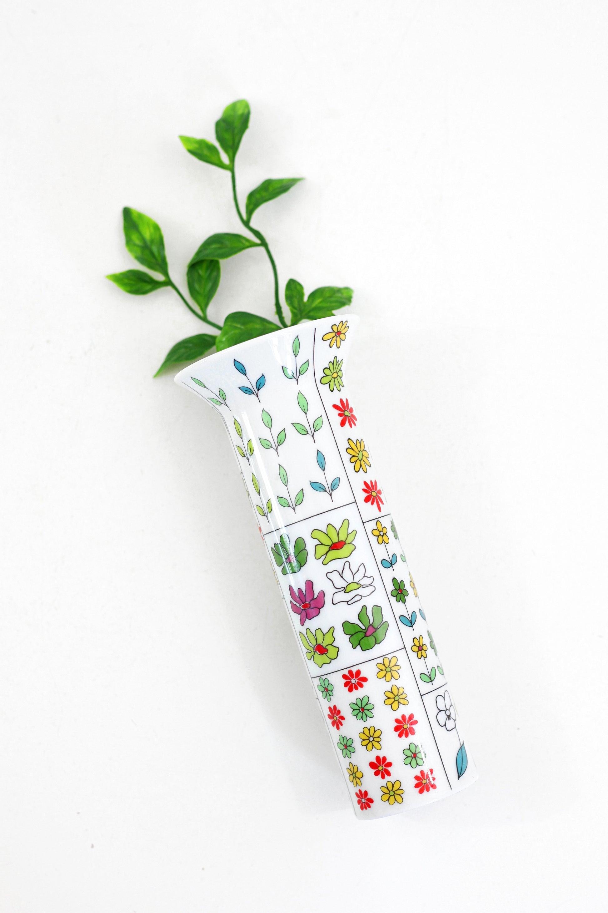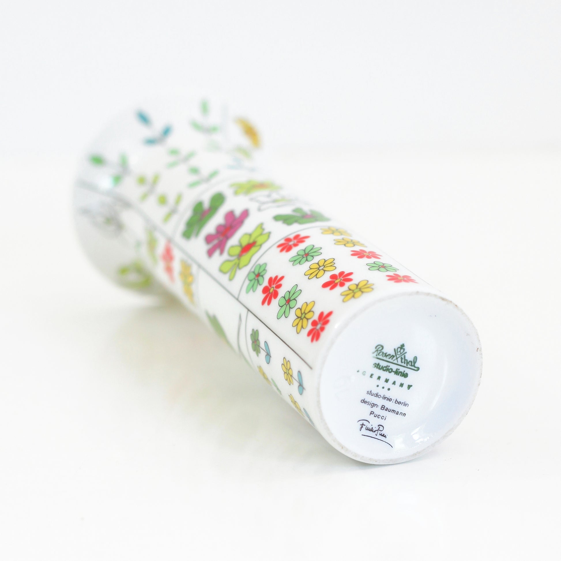 This gorgeous mid century Rosenthal vase is a real stunner! Made in Berlin, Germany in the 1960s or 70s, this beautiful vase shape was designed by Hans Theo Baumann. The pattern was designed by Emilio Pucci, and features whimsical floral motifs in rich, saturated colors. This vase is perfect for holding a few flowers, and lovely enough just to display and admire!
