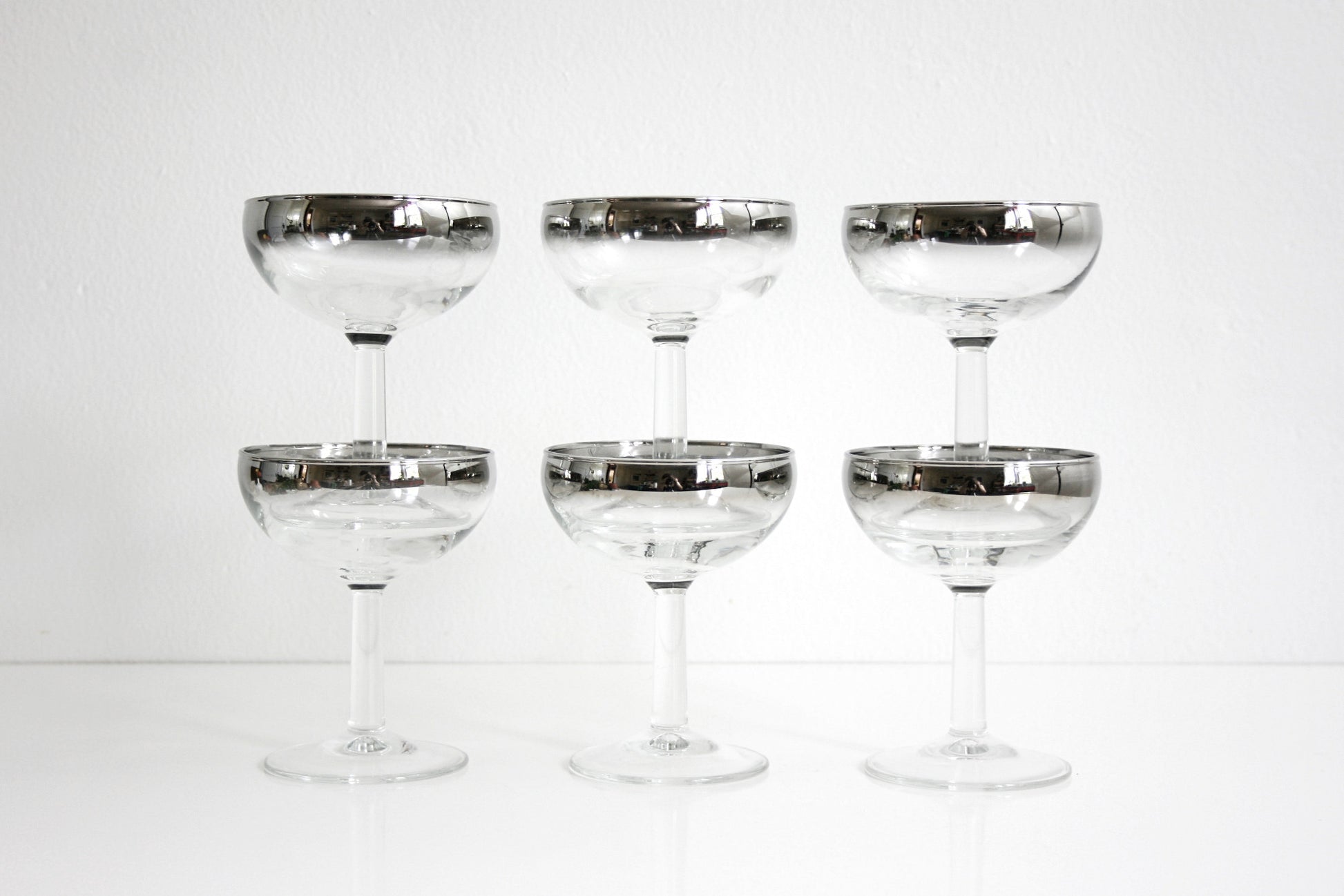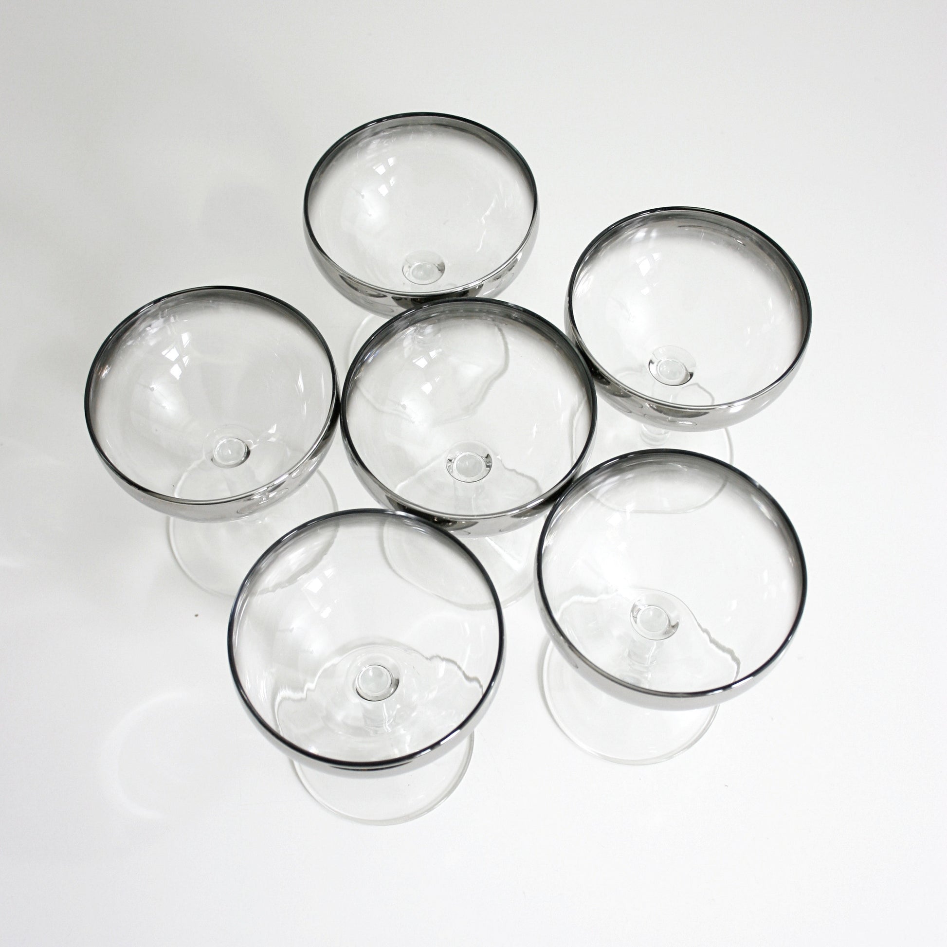 This gorgeous set of six mid century silver ombre champagne coupes is just stunning! Made of bright, clear glass with a silver ombre fade that starts at the rim, these glasses are simple yet oh-so stunning. Made in France, these glasses are perfect for making any occasion extra special!