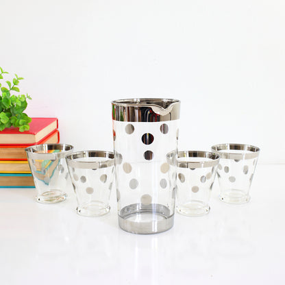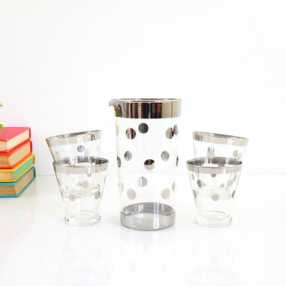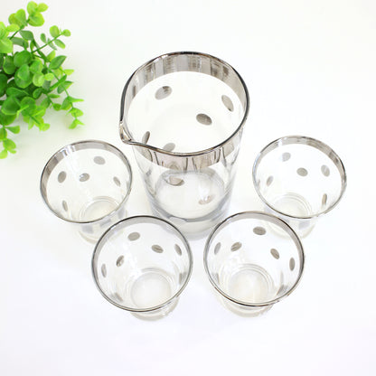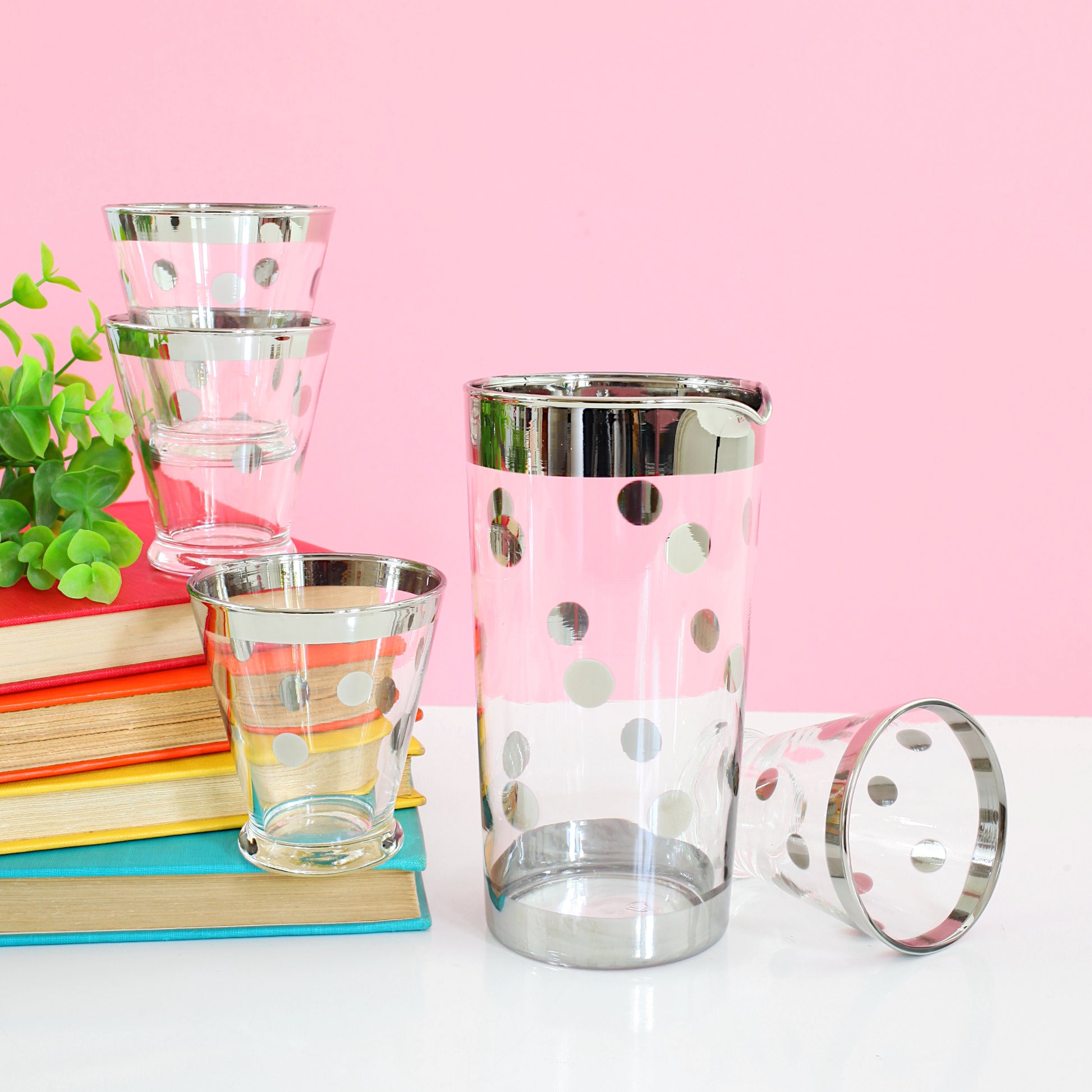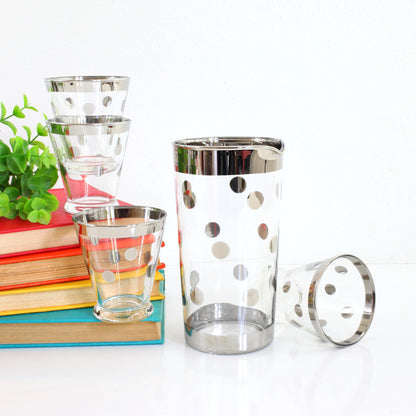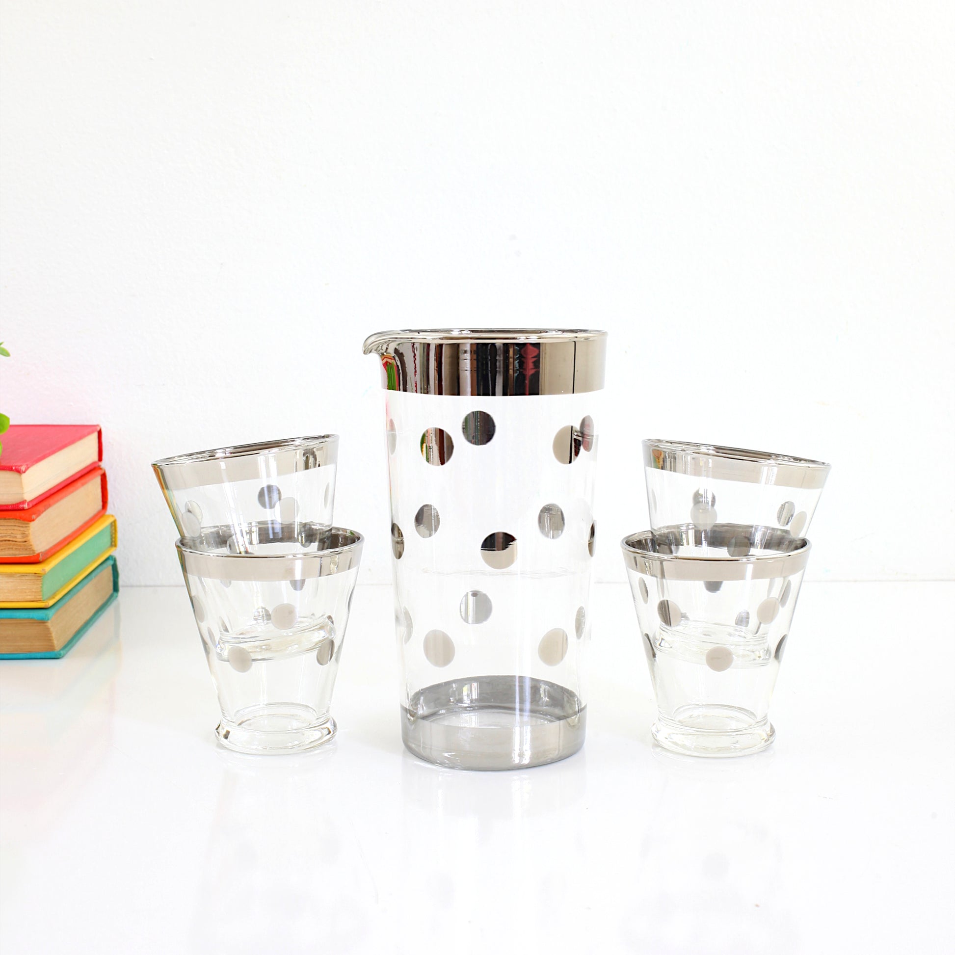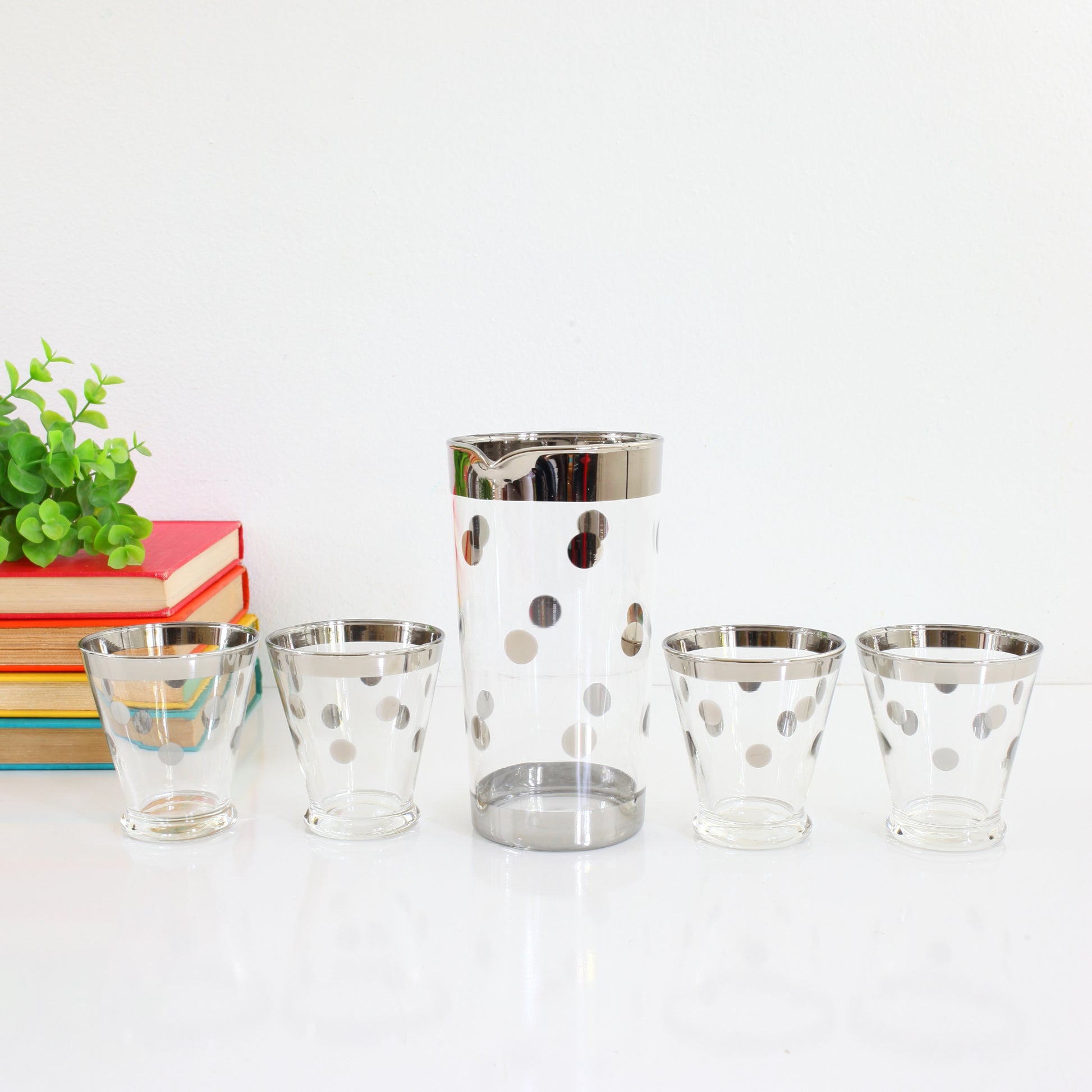 This gorgeous mid century modern cocktail set is a real stunner! Set includes four small cocktail glasses and a pitcher with pour spout. Each piece features fun silver polka dots and a silver band around the rim. Perfect for an extra classy cocktail party, these dotted darlings will make any drink more fun!