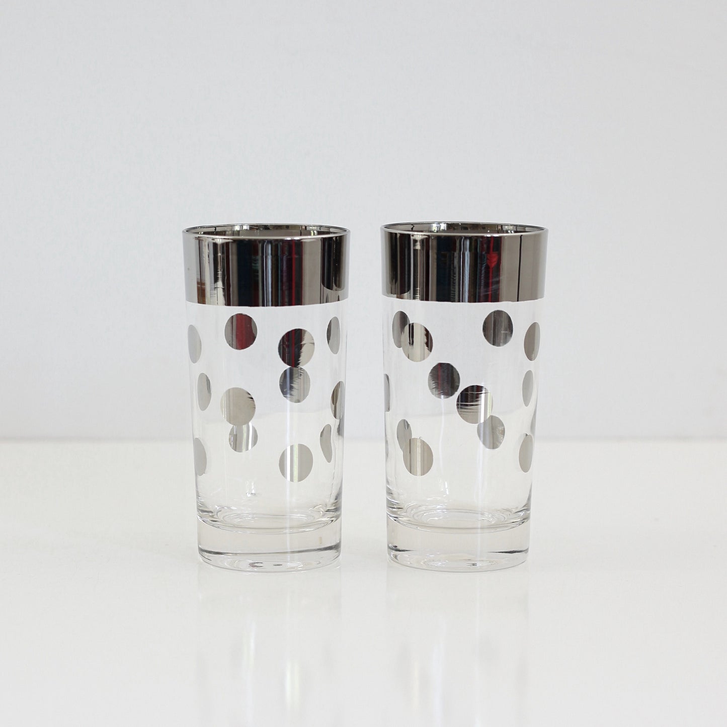 This beautiful pair of mid century modern highball glasses feature gorgeous metallic silver polka dots and a thick silver band around the rim. Perfect for an extra classy cocktail, these dotted darlings will make any drink more fun!